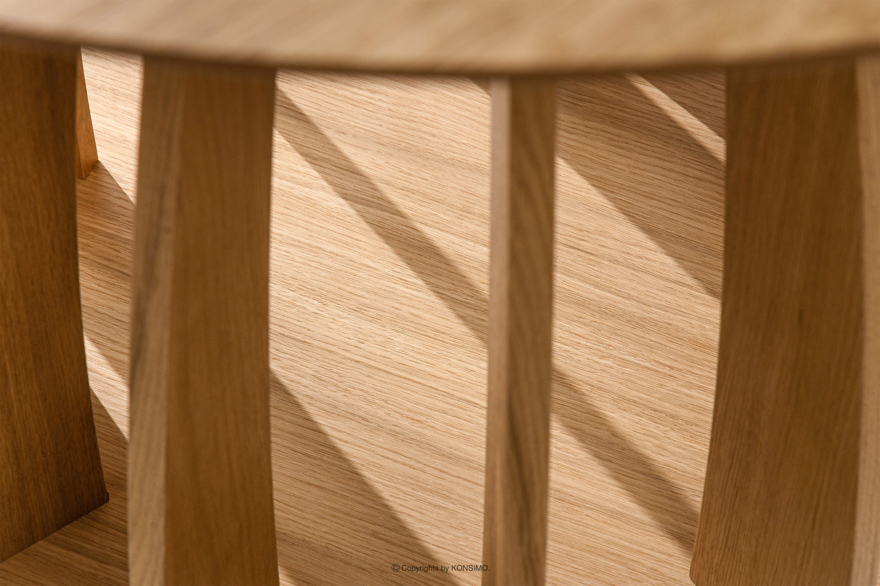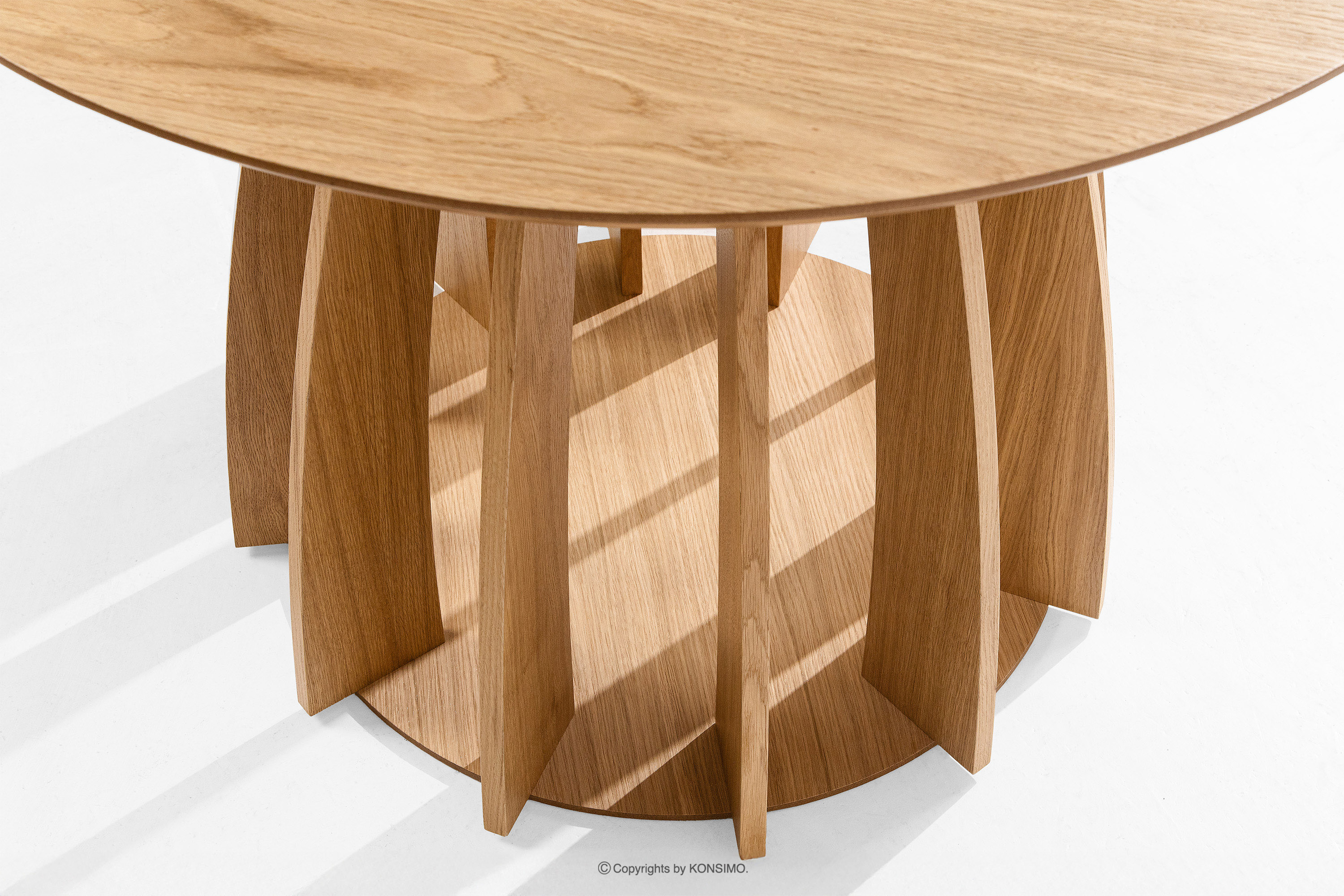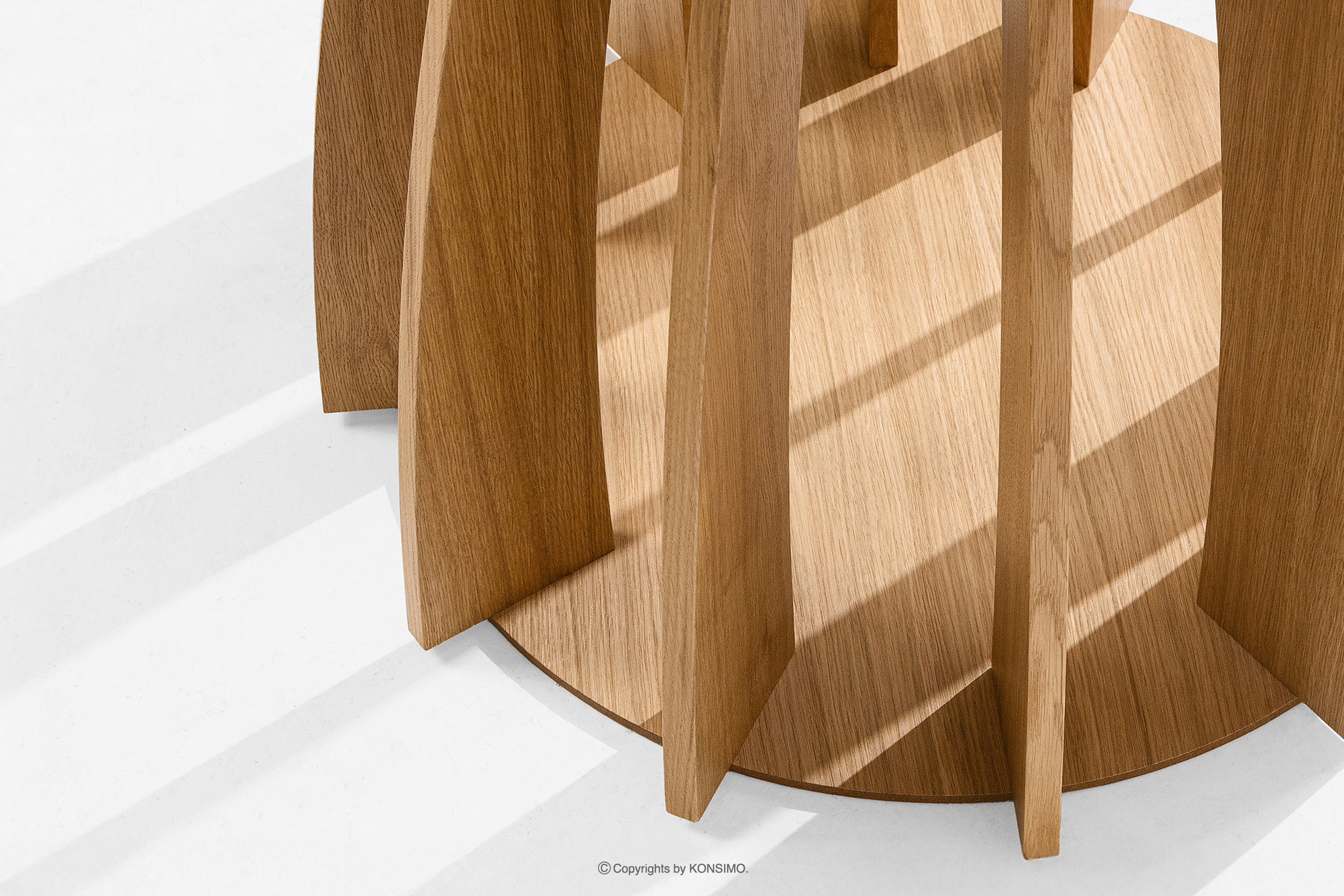 Stół do jadalni 100 cm dąb naturalny to kwintesencja nowoczesnego designu, gdzie minimalizm łączy się z wyrafinowaną formą i najwyższą jakością wykonania. Stół z tej serii wyróżnia się charakterystyczną, okrągłą formą blatu oraz podstawą, które zostały wykonane z najwyższej jakości forniru dębowego. Blat o idealnie gładkiej powierzchni spoczywa na wyjątkowej, architektonicznej podstawie złożonej z kilku wygiętych, łukowatych elementów.
