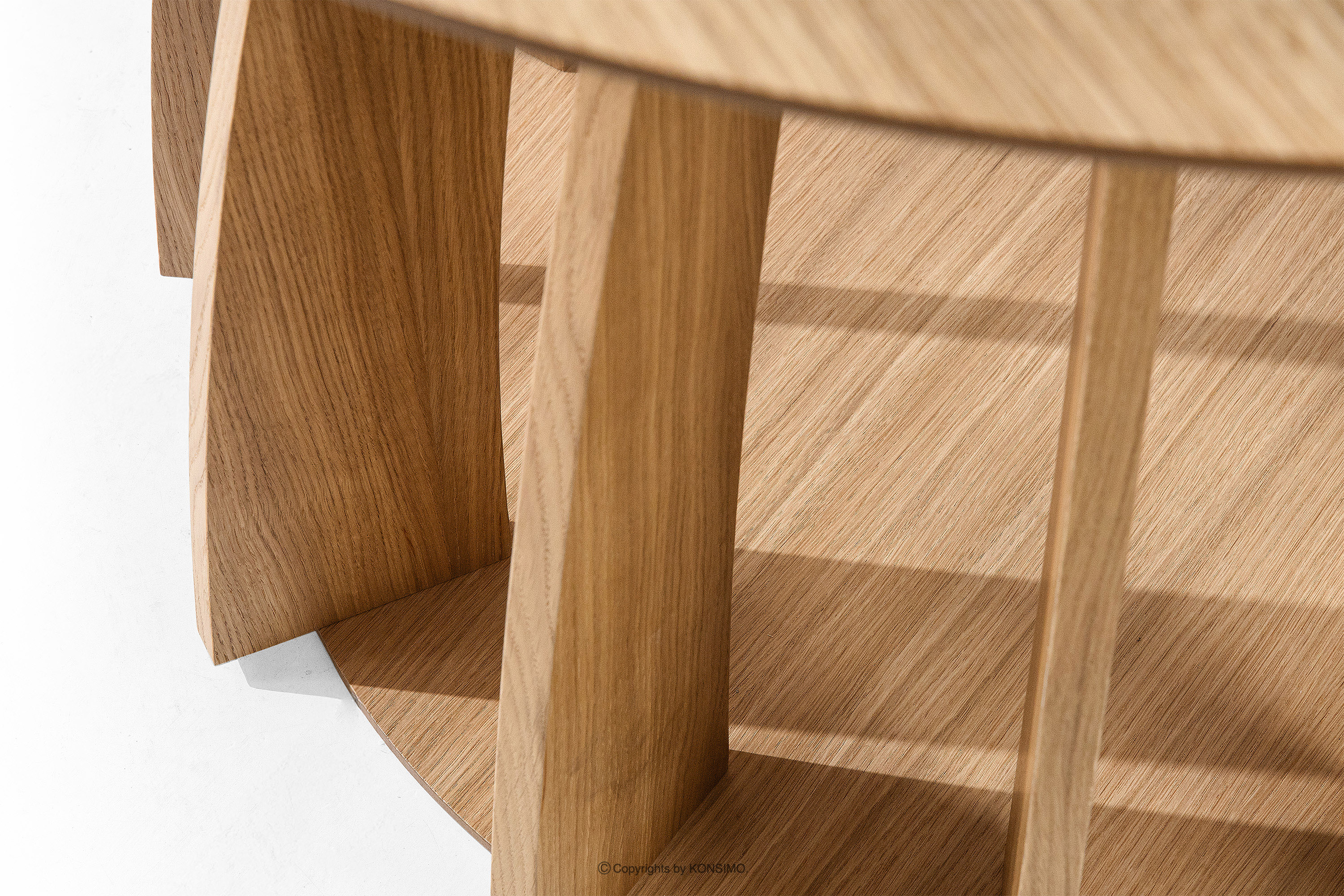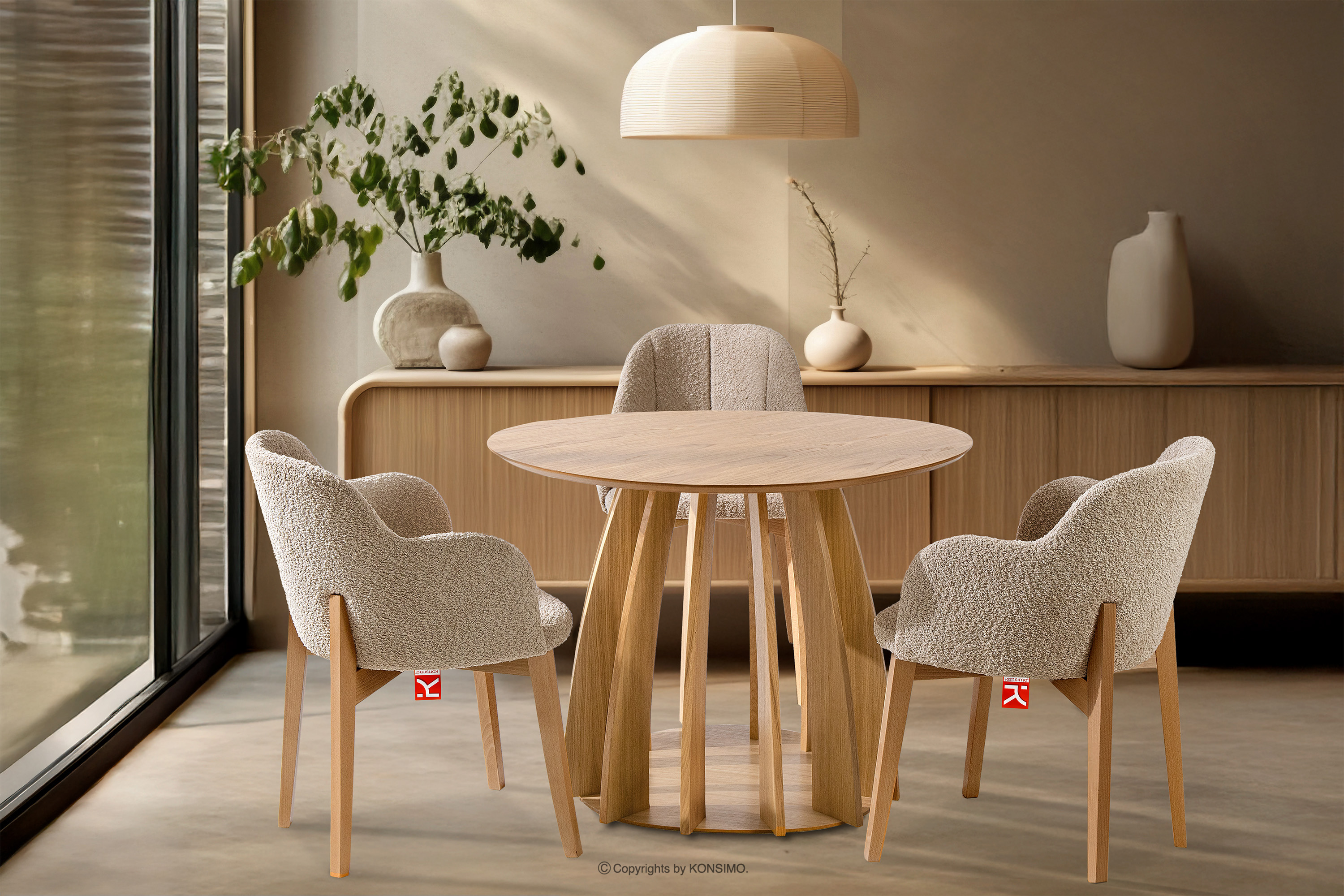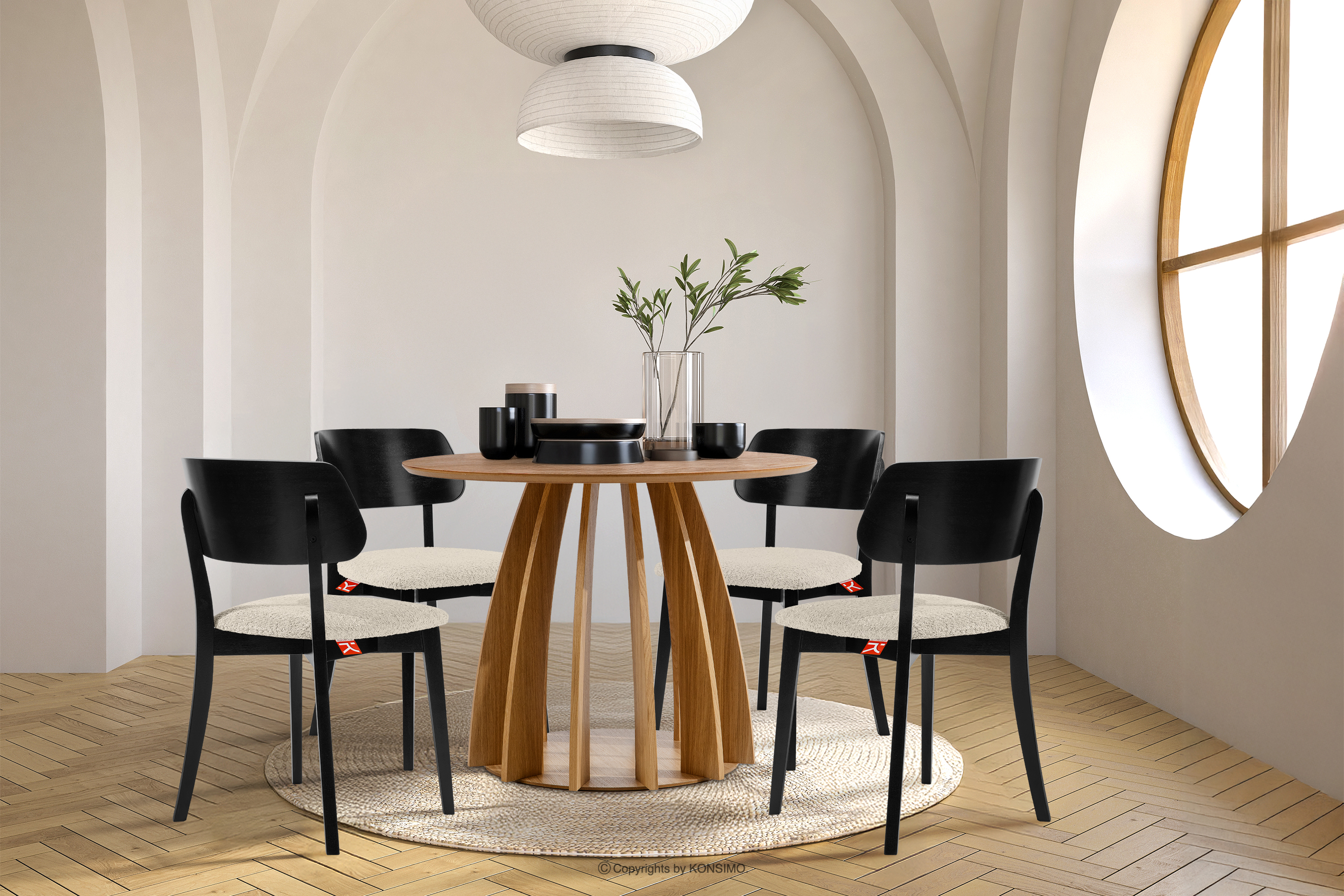 Stół do jadalni 100 cm dąb naturalny to kwintesencja nowoczesnego designu, gdzie minimalizm łączy się z wyrafinowaną formą i najwyższą jakością wykonania. Stół z tej serii wyróżnia się charakterystyczną, okrągłą formą blatu oraz podstawą, które zostały wykonane z najwyższej jakości forniru dębowego. Blat o idealnie gładkiej powierzchni spoczywa na wyjątkowej, architektonicznej podstawie złożonej z kilku wygiętych, łukowatych elementów.