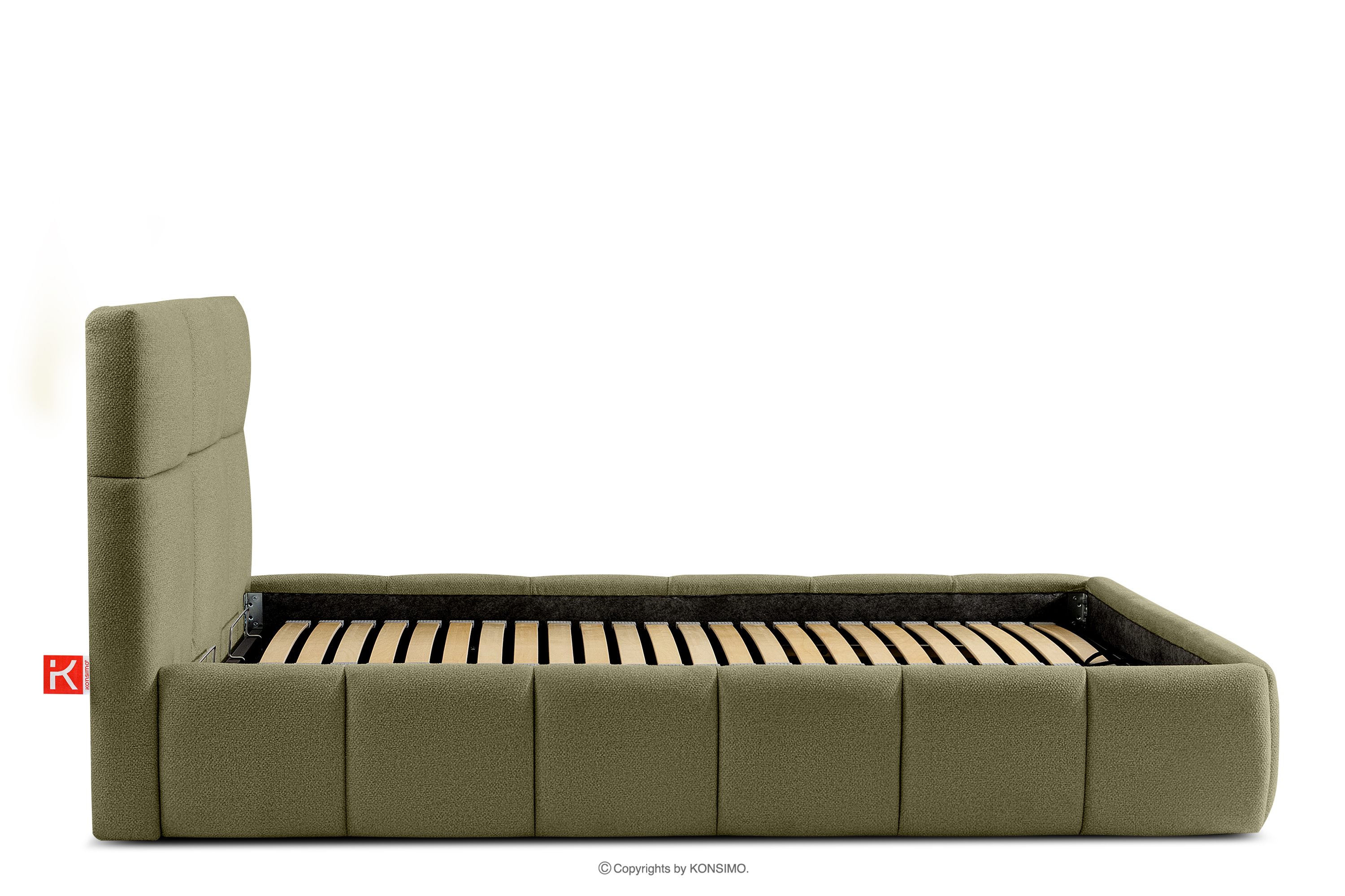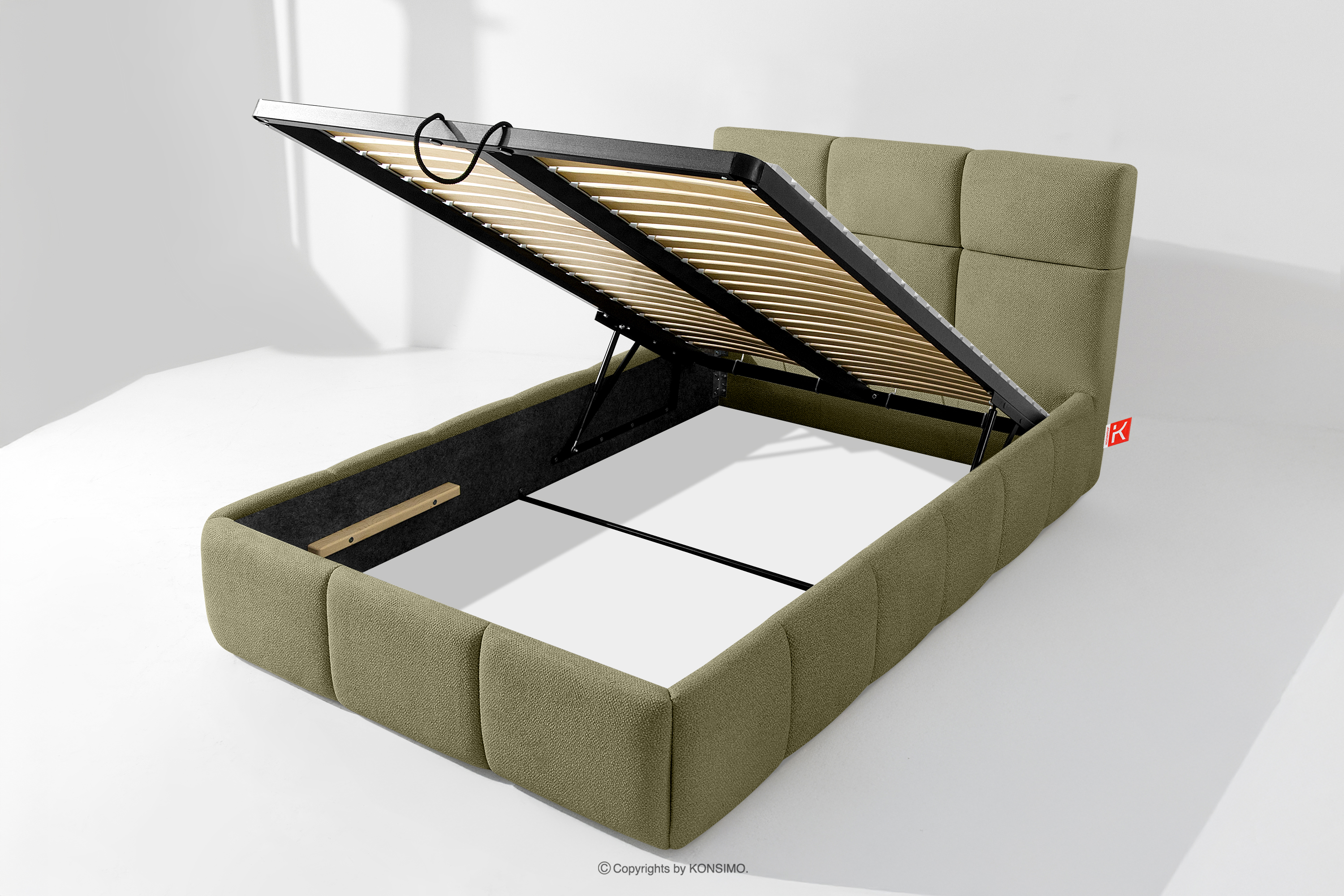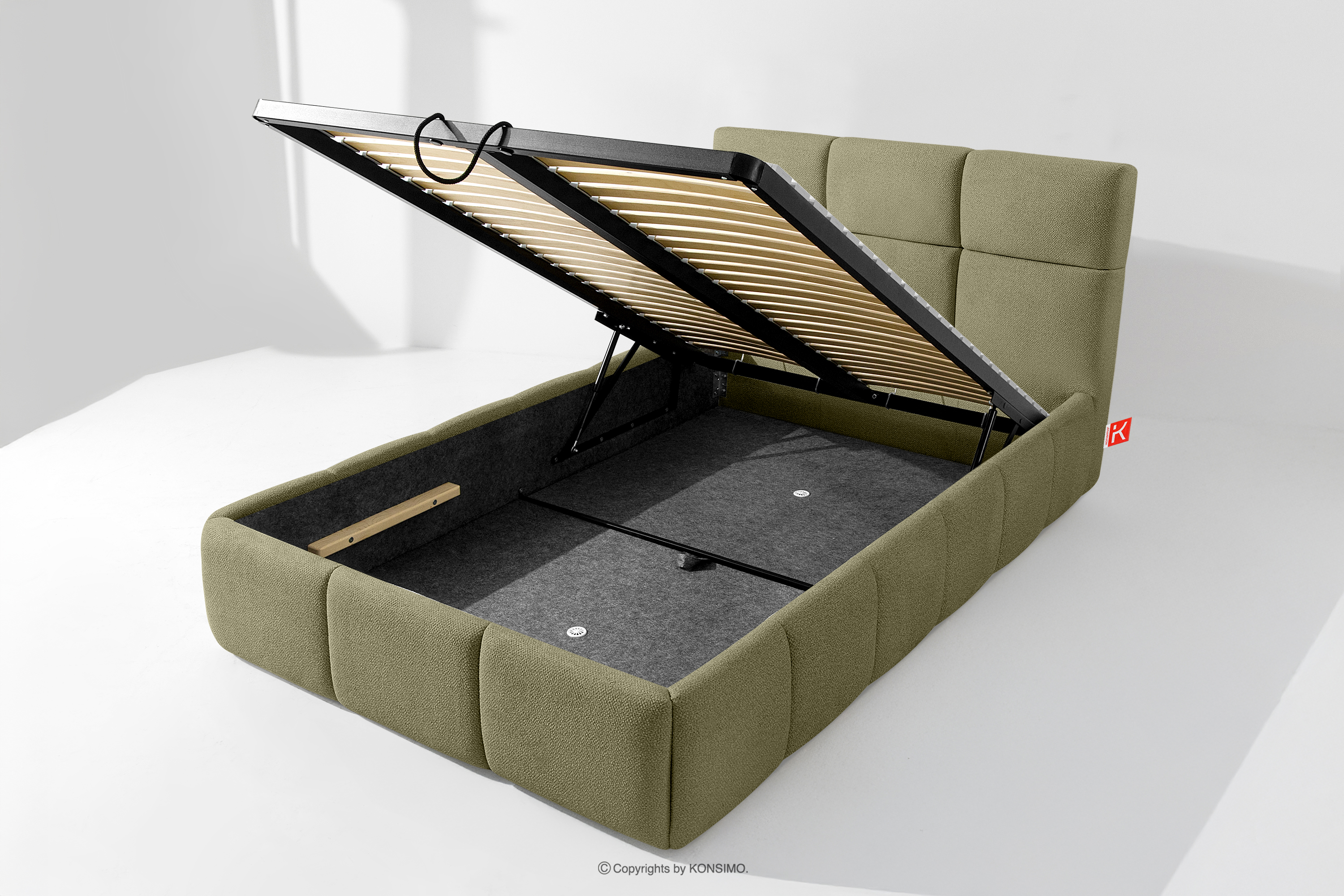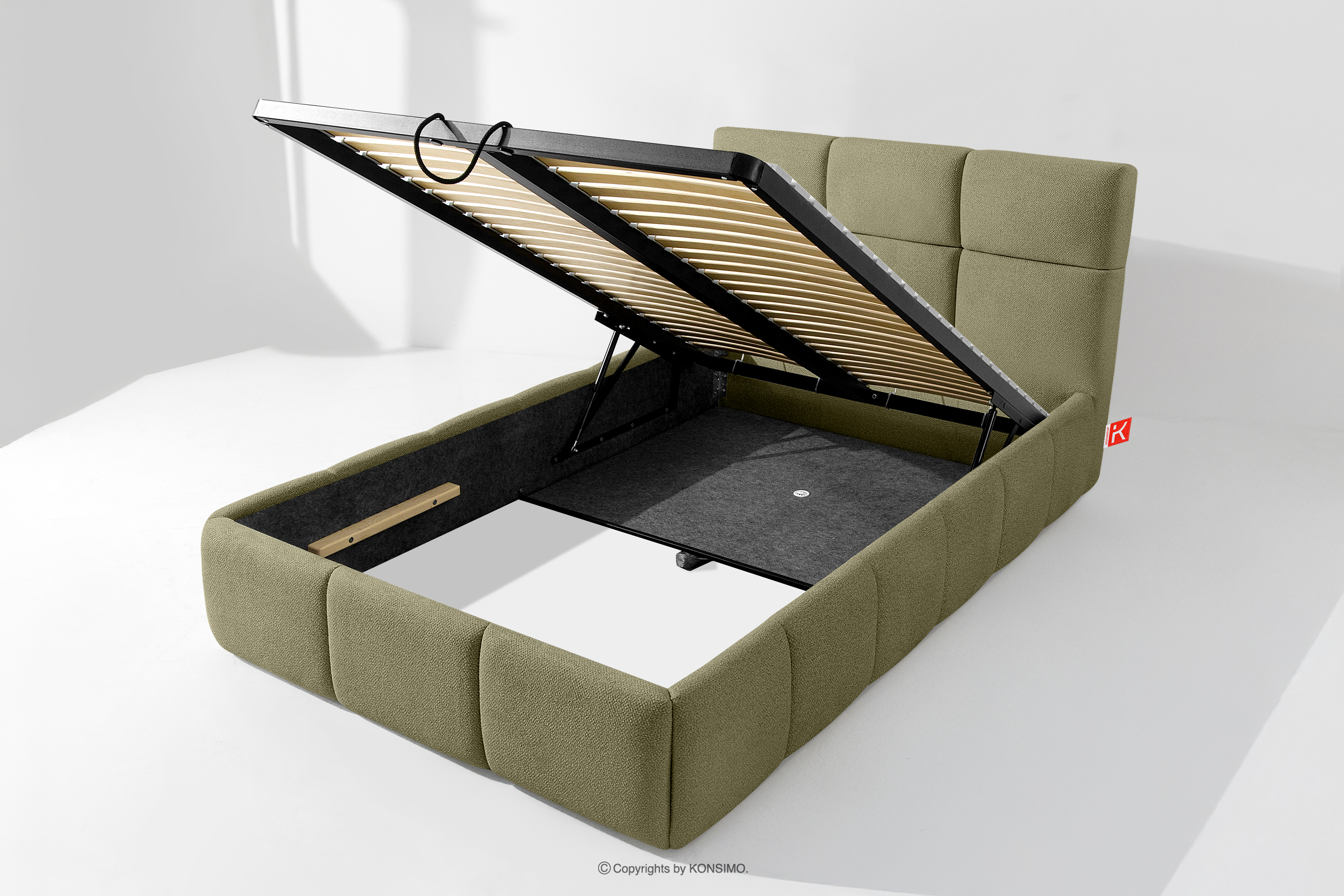 Tkanina, którą pokryte jest łóżko, to materiał najwyższej jakości – nie tylko pięknie się prezentuje, dodając wnętrzu elegancji, ale również jest wysoce funkcjonalna. Odporna na przetarcia i codzienne zużycie. Tkanina doskonale pasuje do nowoczesnych i skandynawskich wnętrz, gdzie prostota idzie w parze z funkcjonalnością. Podłoga w skrzyni łóżka jest wyjmowana, co ułatwia sprzątanie pod meblem. Dodatkowo ściany i płyta podłogowa skrzyni wykończone są filcem, który zapobiega ślizganiu się pościeli i innych przechowywanych rzeczy, zachowując przy tym porządek i estetykę.