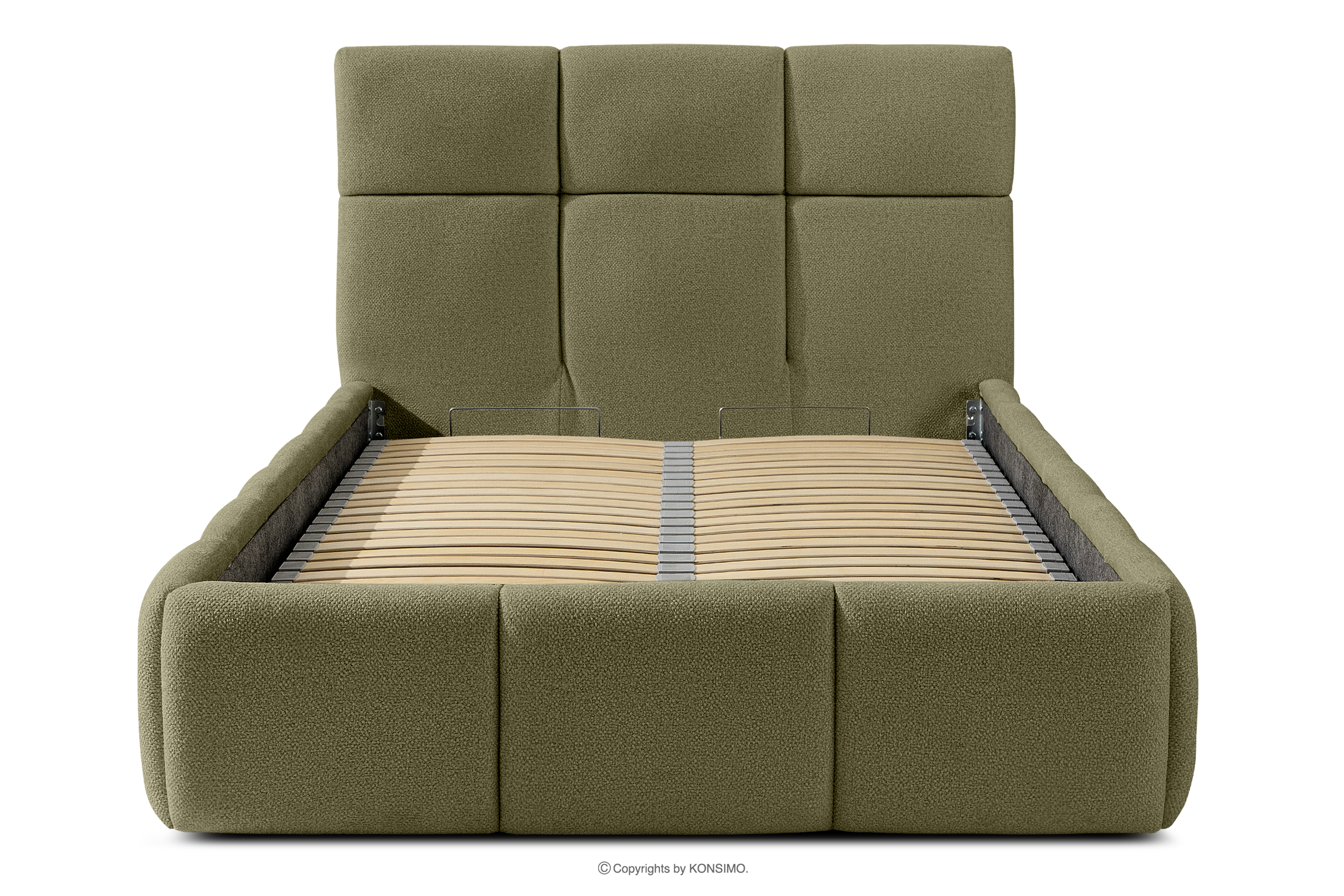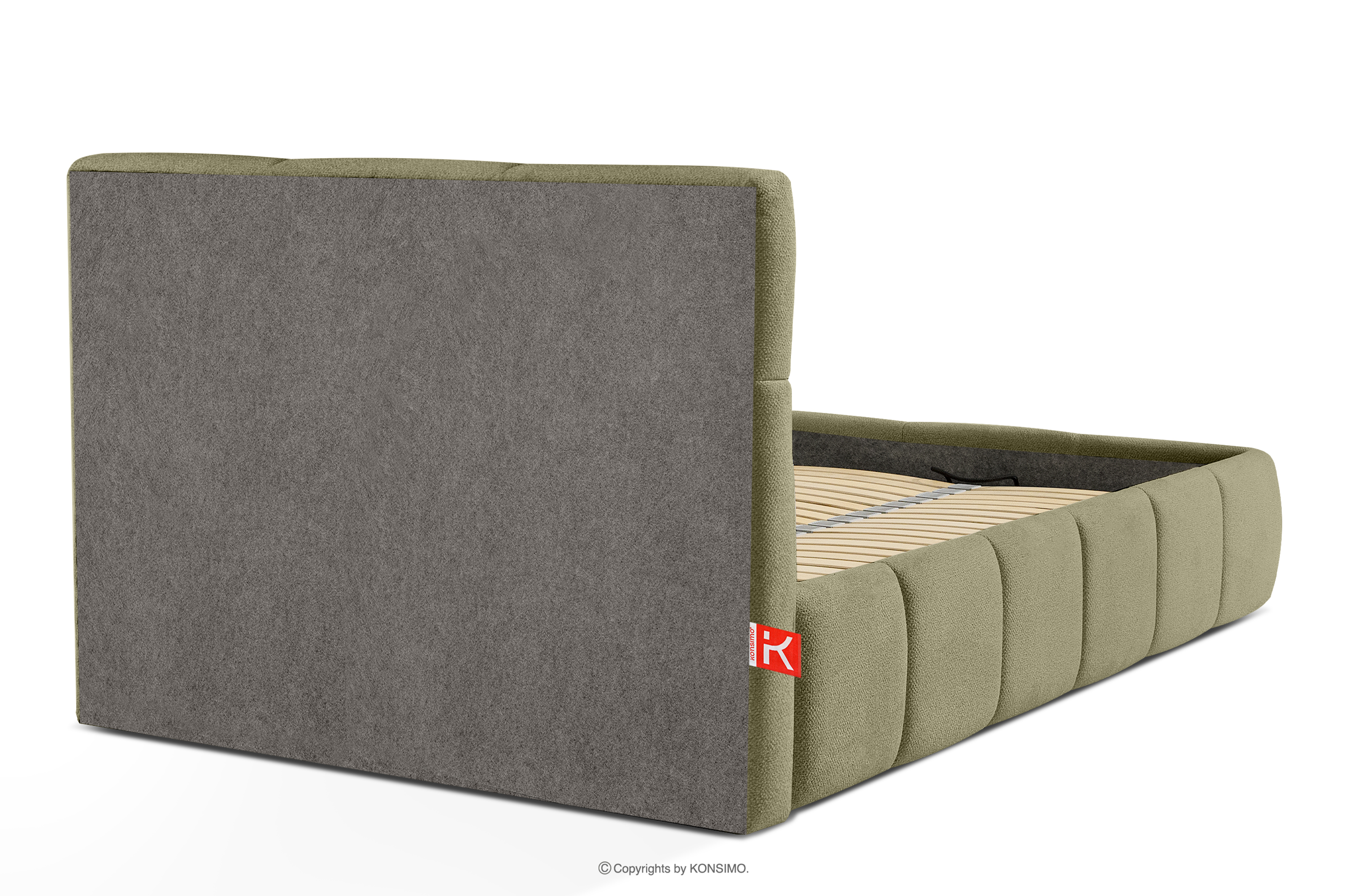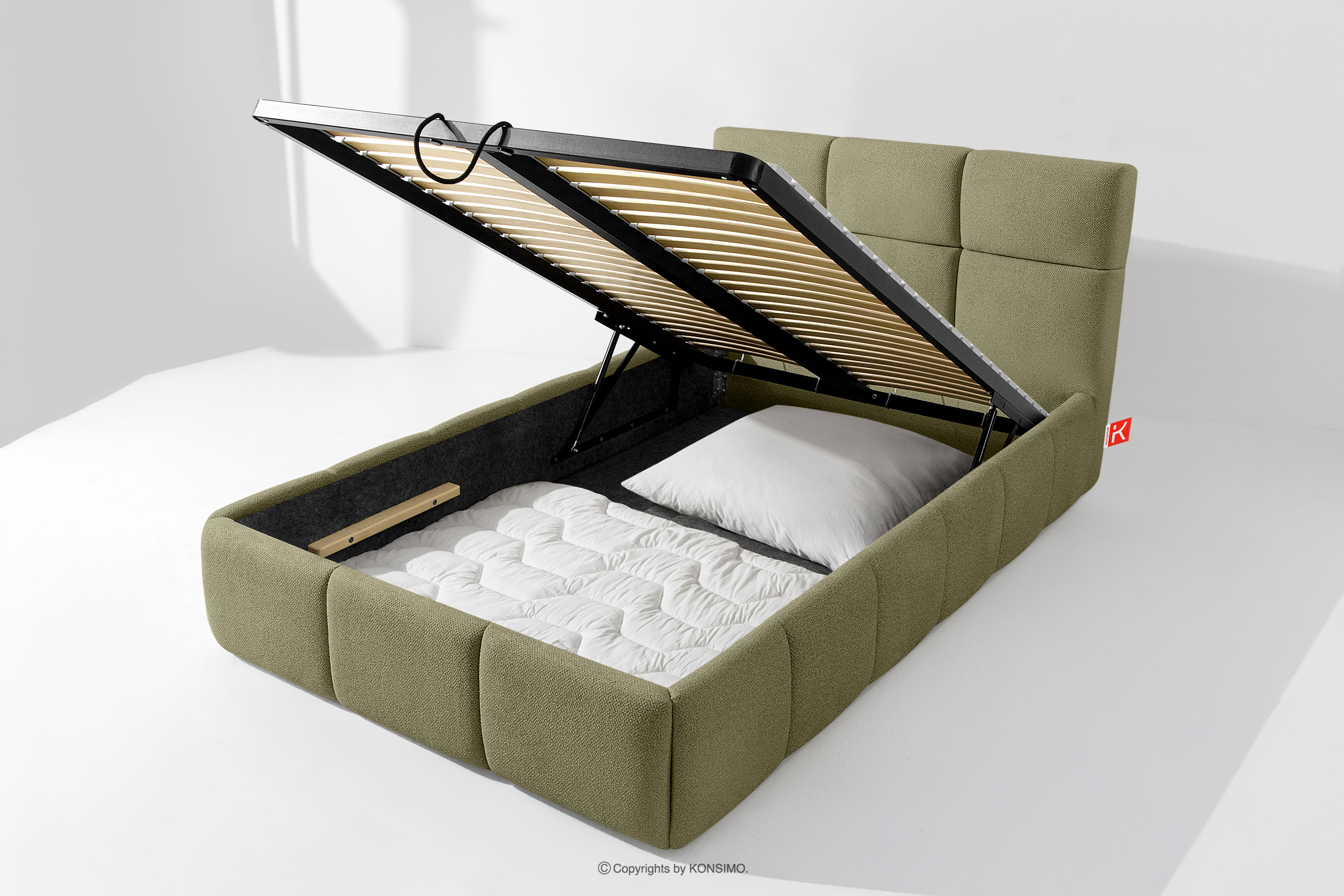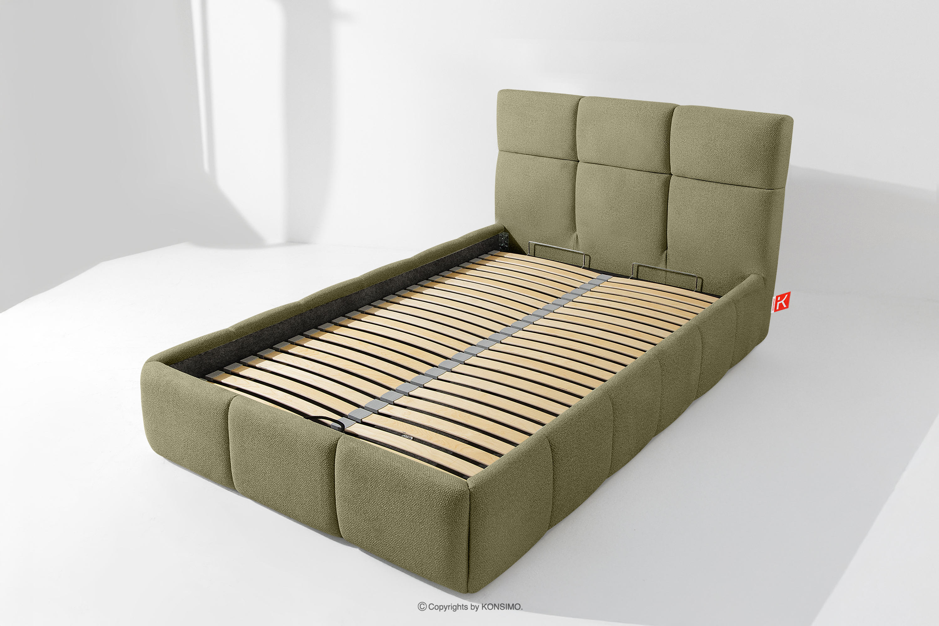 Tkanina, którą pokryte jest łóżko, to materiał najwyższej jakości – nie tylko pięknie się prezentuje, dodając wnętrzu elegancji, ale również jest wysoce funkcjonalna. Odporna na przetarcia i codzienne zużycie. Tkanina doskonale pasuje do nowoczesnych i skandynawskich wnętrz, gdzie prostota idzie w parze z funkcjonalnością. Podłoga w skrzyni łóżka jest wyjmowana, co ułatwia sprzątanie pod meblem. Dodatkowo ściany i płyta podłogowa skrzyni wykończone są filcem, który zapobiega ślizganiu się pościeli i innych przechowywanych rzeczy, zachowując przy tym porządek i estetykę.