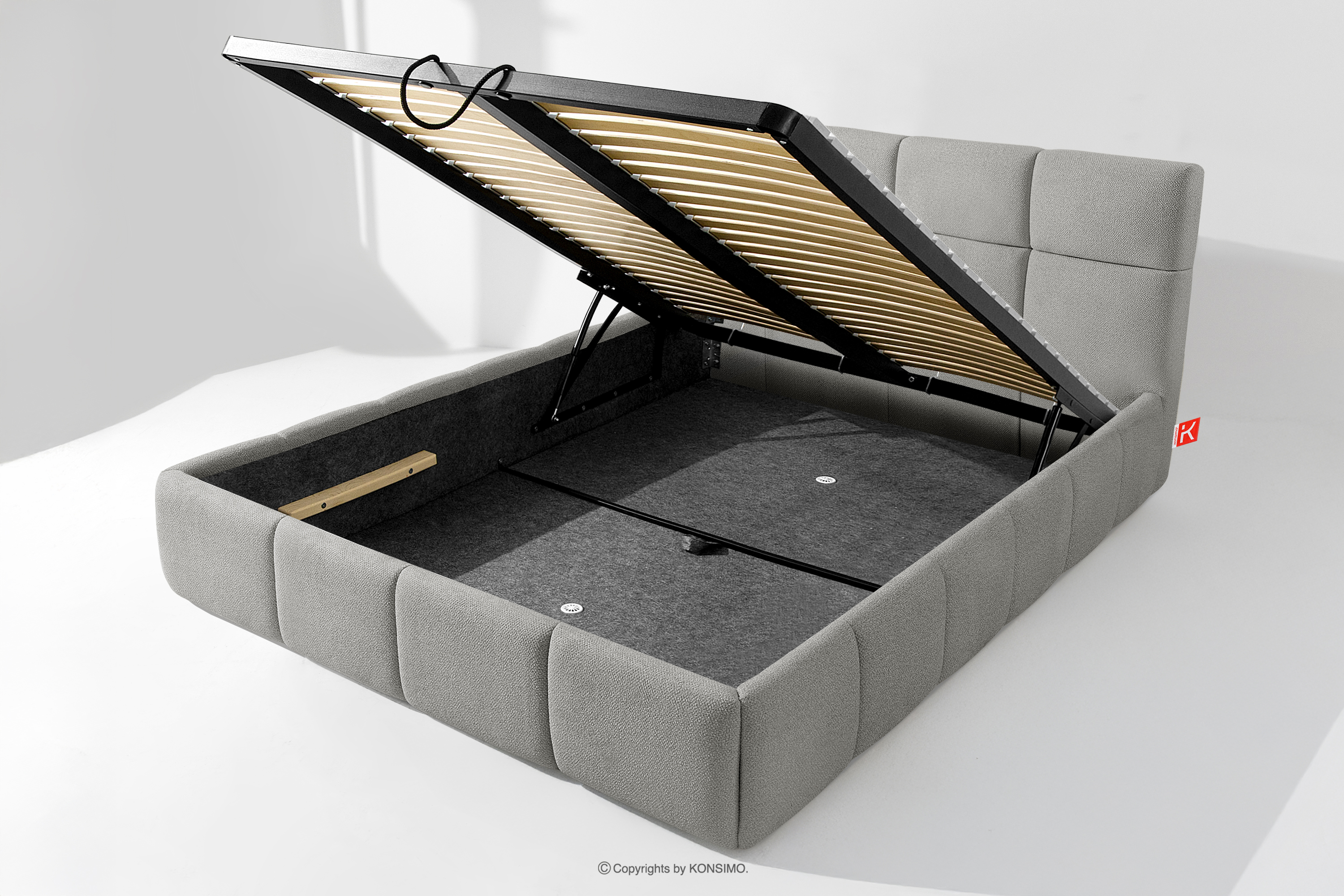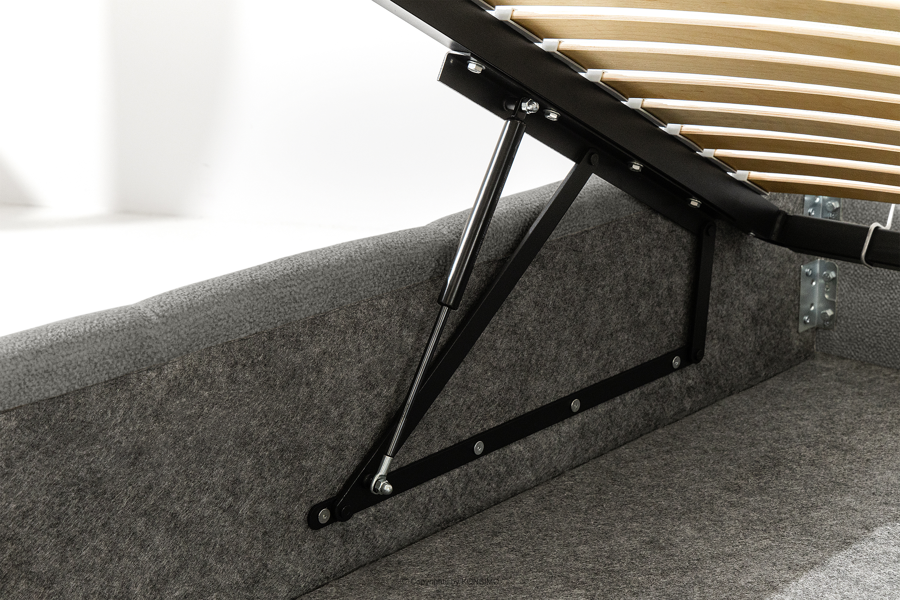 Co więcej, użytkownik ma możliwość personalizacji twardości łóżka – dzięki wyjmowanym listwom można uzyskać bardziej miękkie lub twardsze podłoże. Kolejnym udogodnieniem jest wygodny pojemnik na pościel, który otwiera się dzięki nowoczesnym siłownikom gazowym – bez wysiłku i z pełnym automatem. To praktyczne rozwiązanie pozwala na szybki dostęp do przechowywanej pościeli, bez konieczności podnoszenia ciężkiego materaca ręcznie.