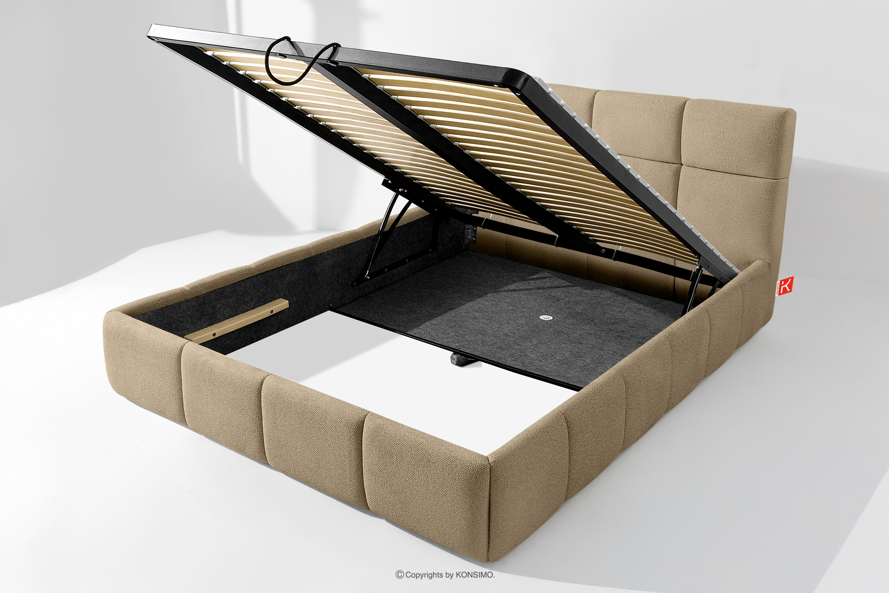 Co więcej, użytkownik ma możliwość personalizacji twardości łóżka – dzięki wyjmowanym listwom można uzyskać bardziej miękkie lub twardsze podłoże. Kolejnym udogodnieniem jest wygodny pojemnik na pościel, który otwiera się dzięki nowoczesnym siłownikom gazowym – bez wysiłku i z pełnym automatem. To praktyczne rozwiązanie pozwala na szybki dostęp do przechowywanej pościeli, bez konieczności podnoszenia ciężkiego materaca ręcznie.