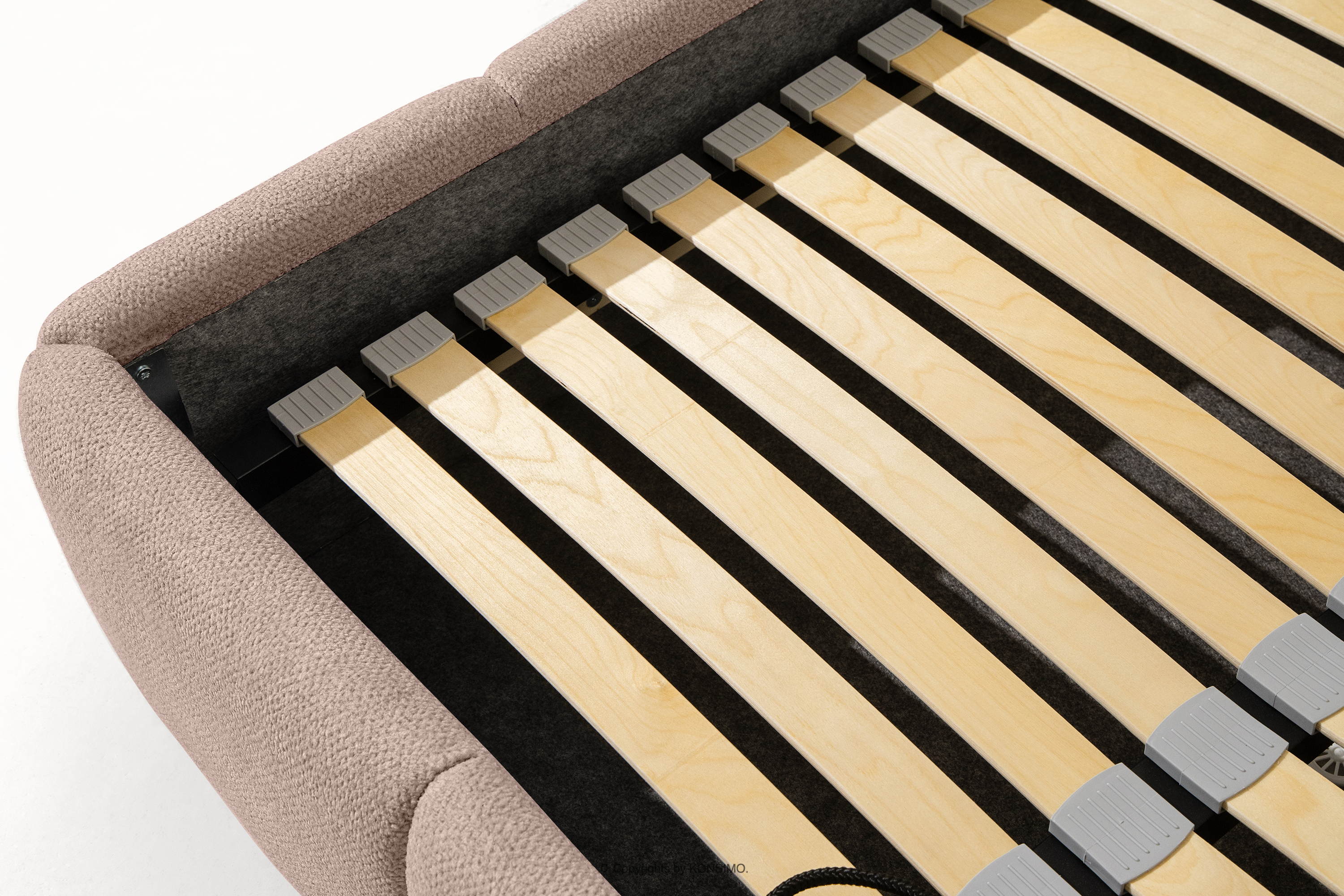 Łóżko tapicerowane 140 cm w stylu skandynawskim różowy łączy minimalistyczny design z maksymalnym komfortem. Jego wyjątkowy kształt sprawia, że nie tylko prezentuje się niebanalnie, ale również oferuje komfort na najwyższym poziomie. Łóżko wyposażono w solidny stelaż wykonany z elastycznych, drewnianych listew, które zapewniają optymalne podparcie materaca i dopasowują się do naturalnych ruchów ciała.