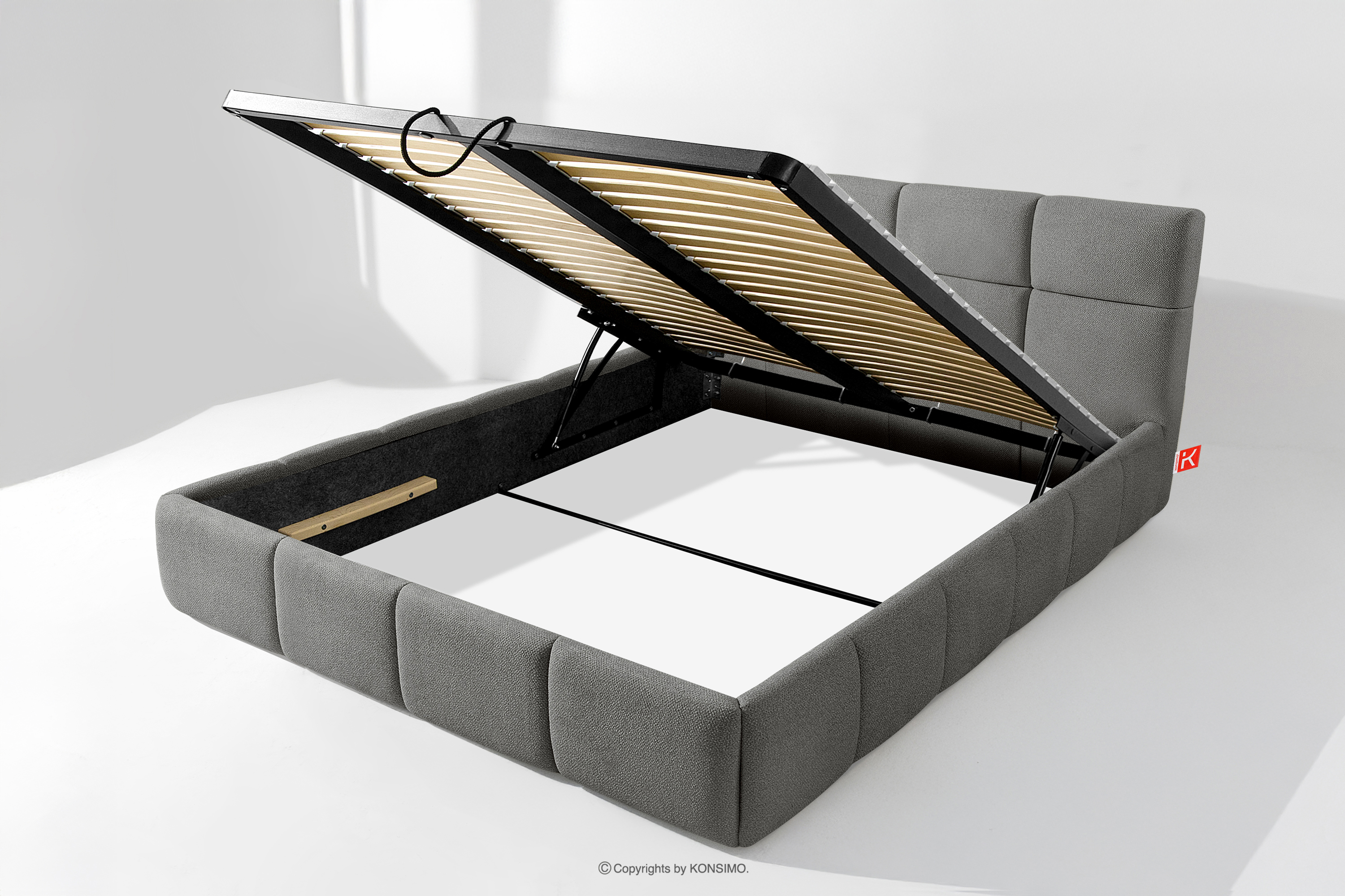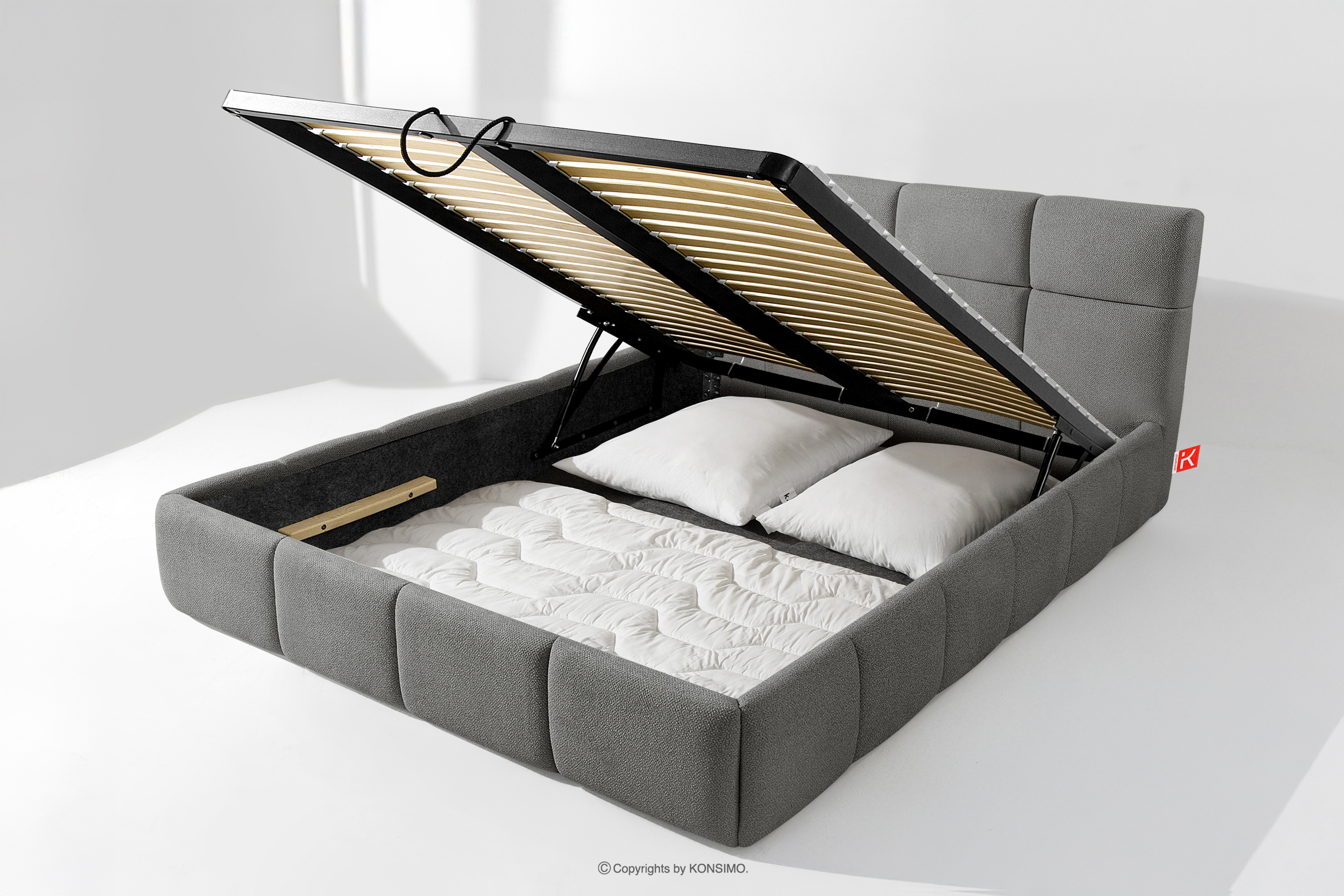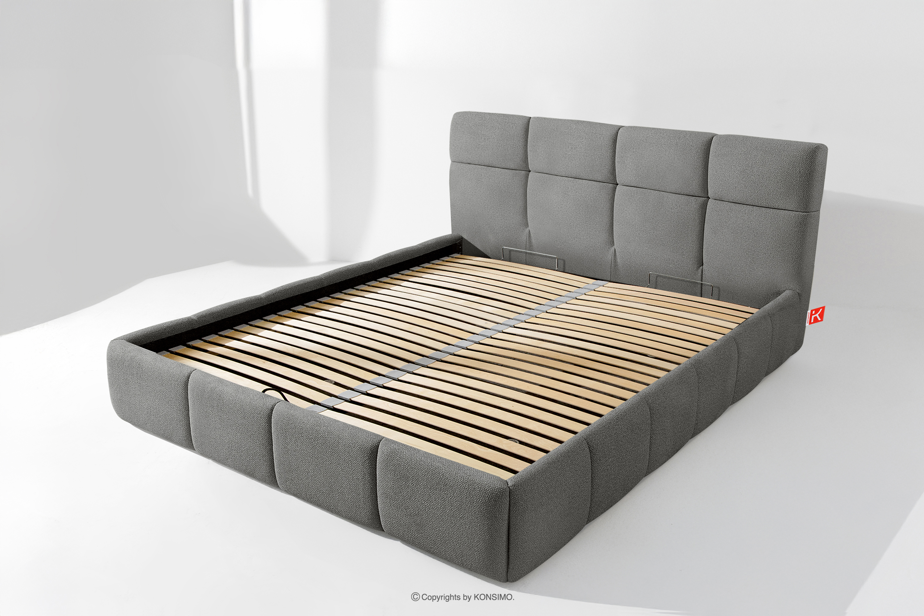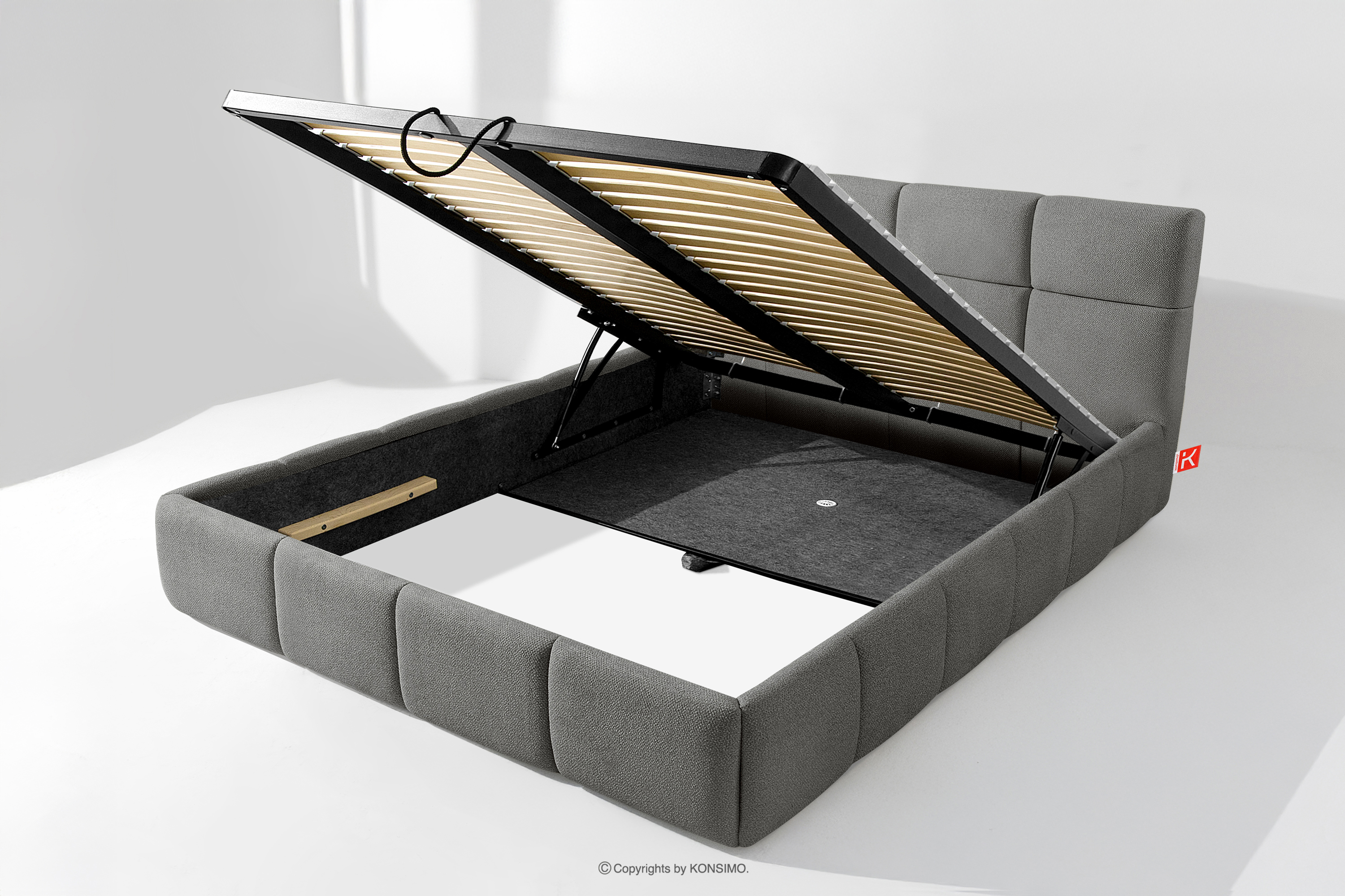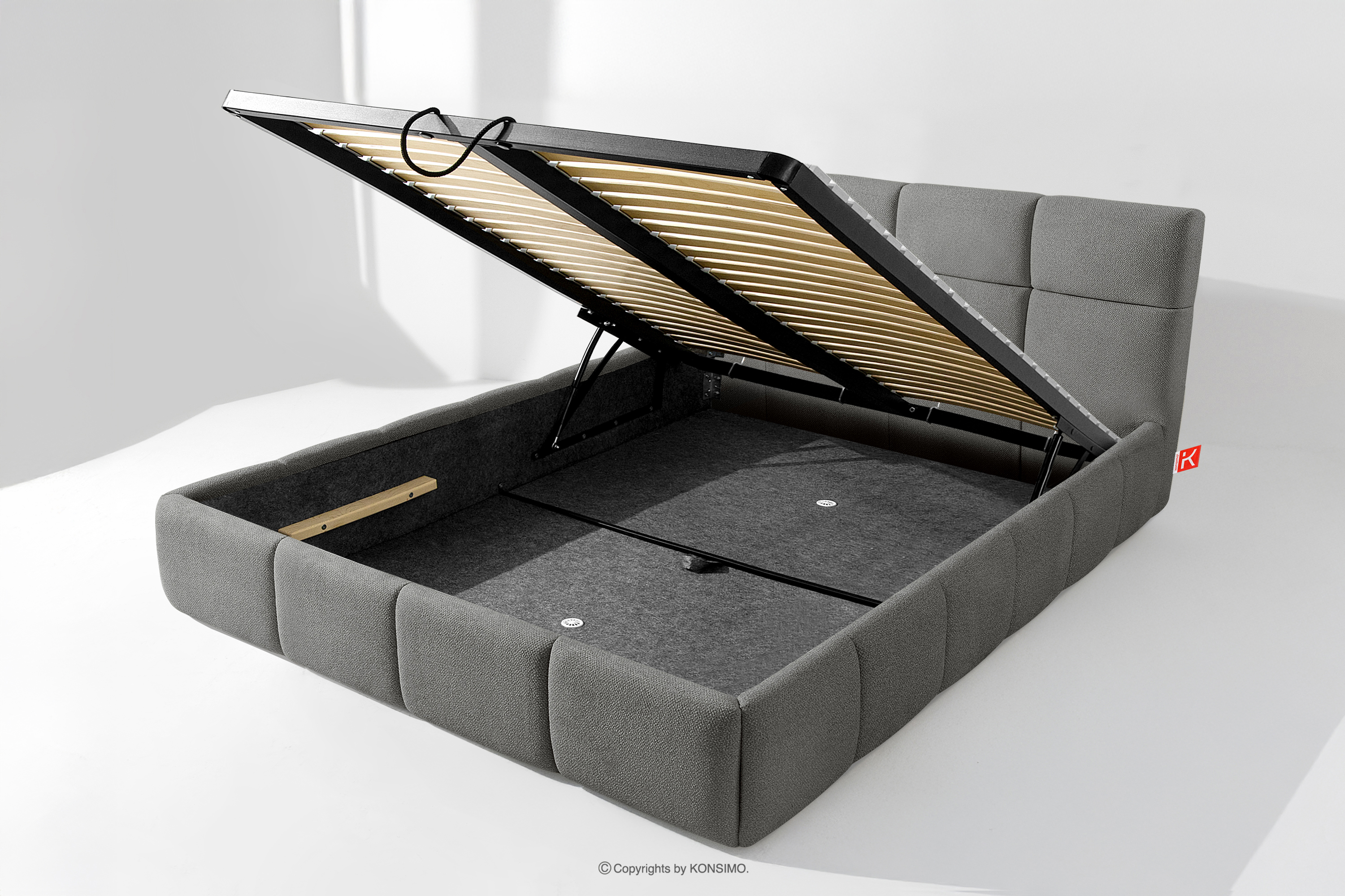 Tkanina, którą pokryte jest łóżko, to materiał najwyższej jakości – nie tylko pięknie się prezentuje, dodając wnętrzu elegancji, ale również jest wysoce funkcjonalna. Odporna na przetarcia i codzienne zużycie. Tkanina doskonale pasuje do nowoczesnych i skandynawskich wnętrz, gdzie prostota idzie w parze z funkcjonalnością. Podłoga w skrzyni łóżka jest wyjmowana, co ułatwia sprzątanie pod meblem. Dodatkowo ściany i płyta podłogowa skrzyni wykończone są filcem, który zapobiega ślizganiu się pościeli i innych przechowywanych rzeczy, zachowując przy tym porządek i estetykę.