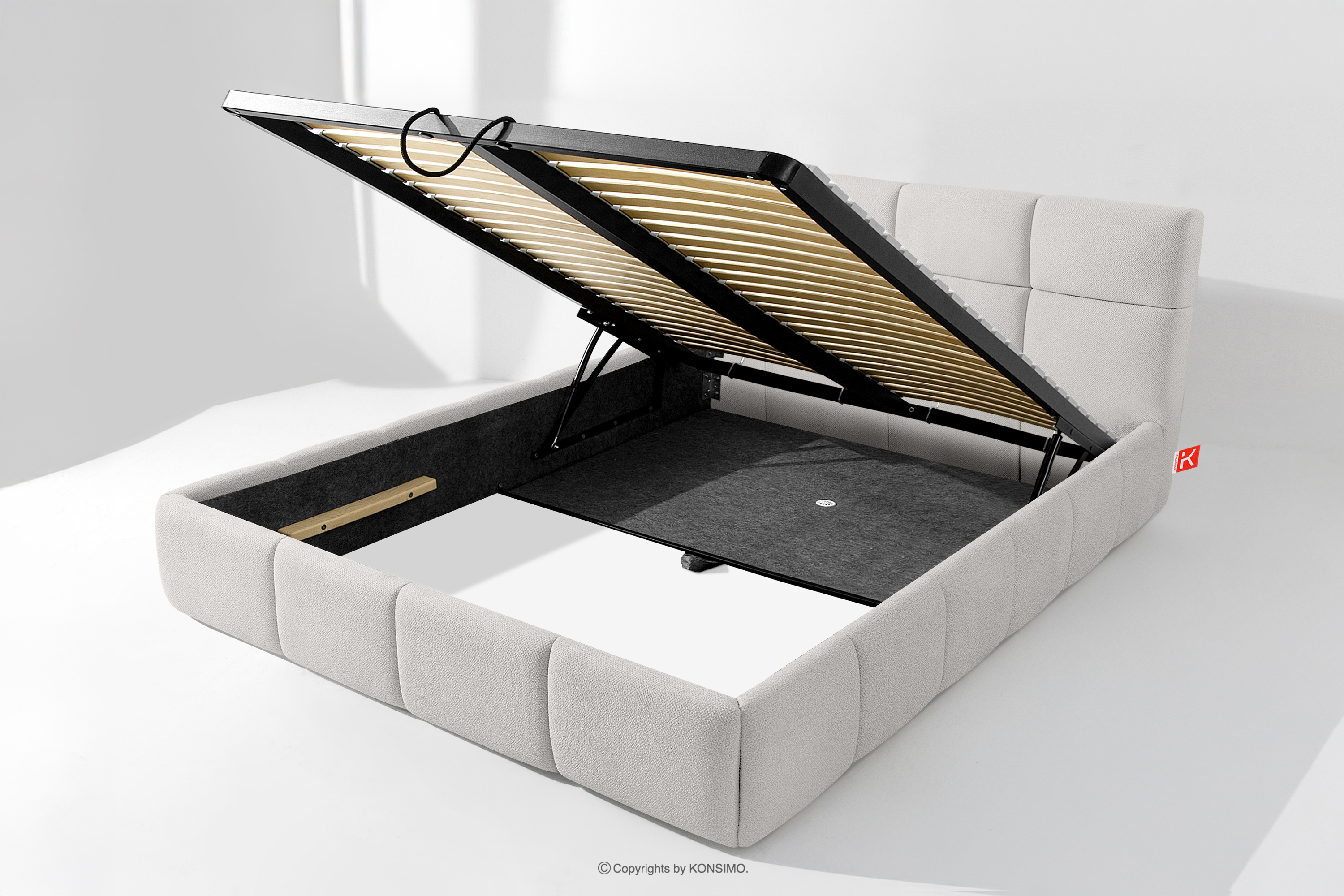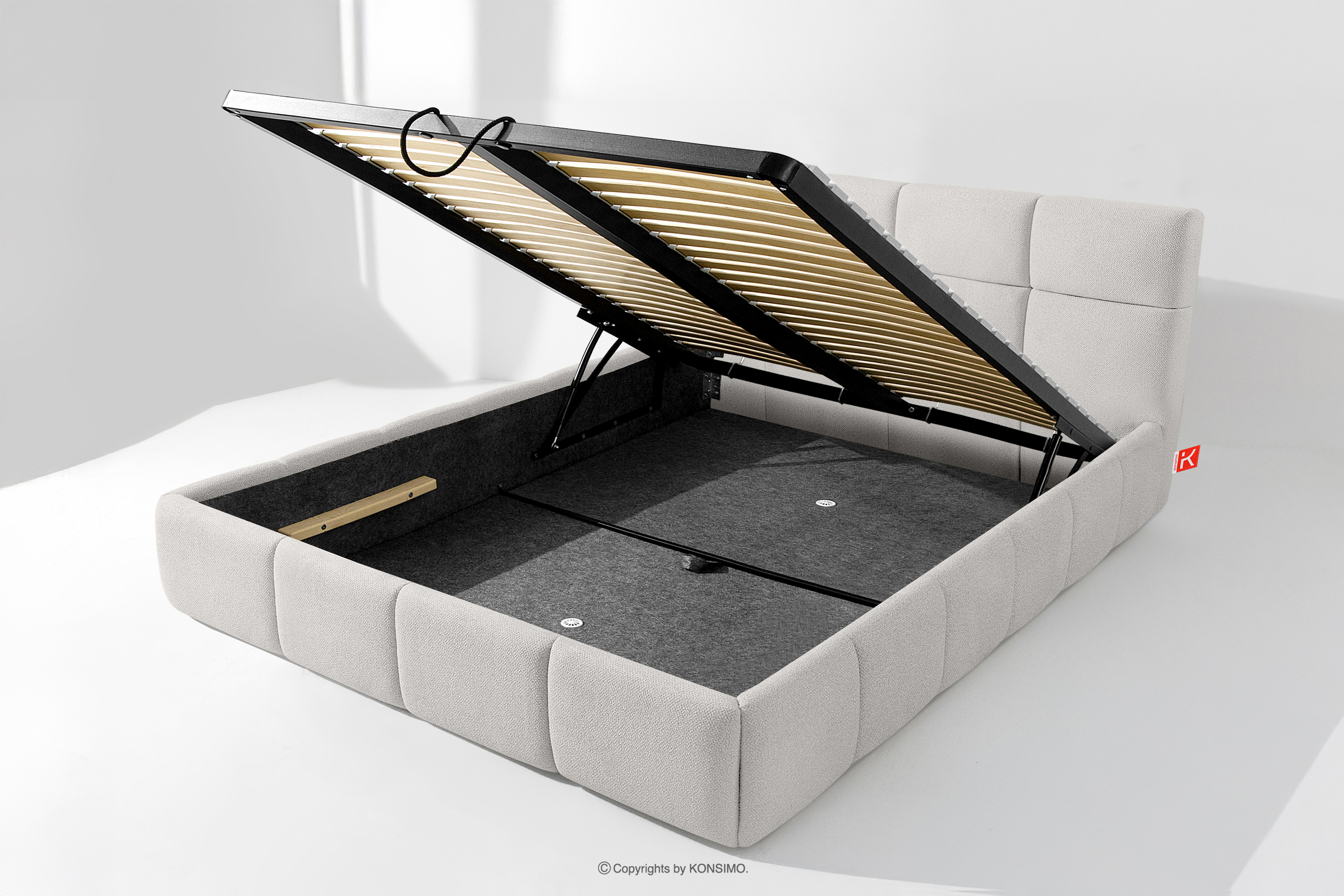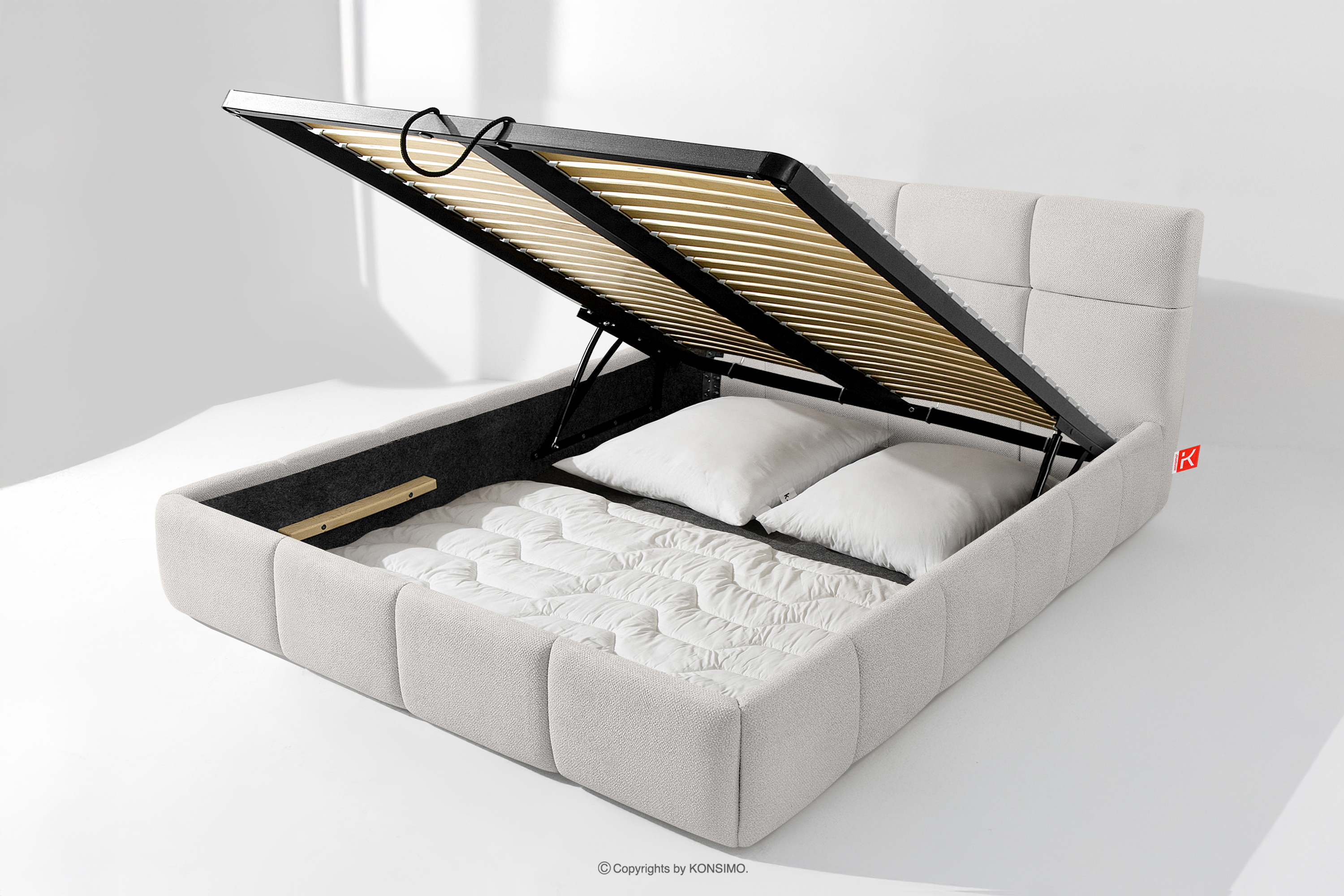 Co więcej, użytkownik ma możliwość personalizacji twardości łóżka – dzięki wyjmowanym listwom można uzyskać bardziej miękkie lub twardsze podłoże. Kolejnym udogodnieniem jest wygodny pojemnik na pościel, który otwiera się dzięki nowoczesnym siłownikom gazowym – bez wysiłku i z pełnym automatem. To praktyczne rozwiązanie pozwala na szybki dostęp do przechowywanej pościeli, bez konieczności podnoszenia ciężkiego materaca ręcznie.