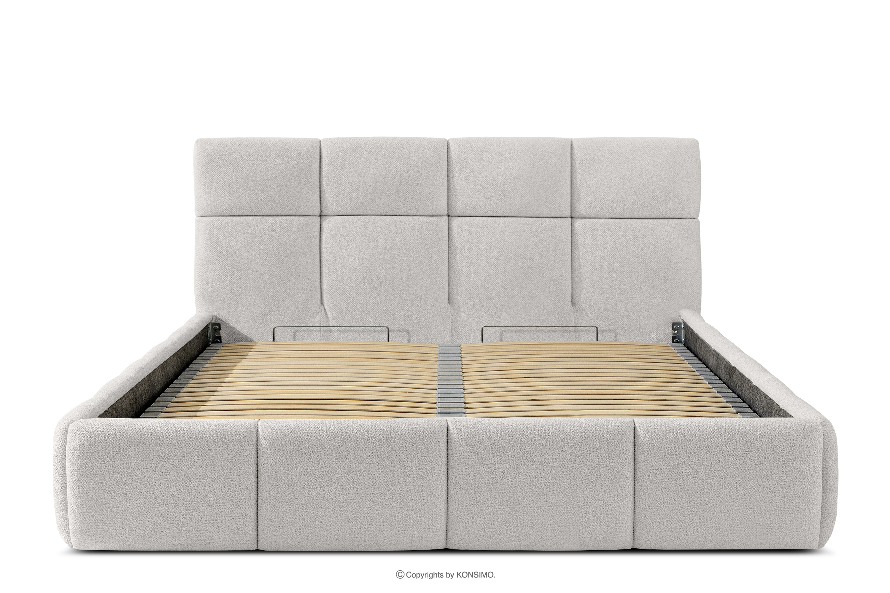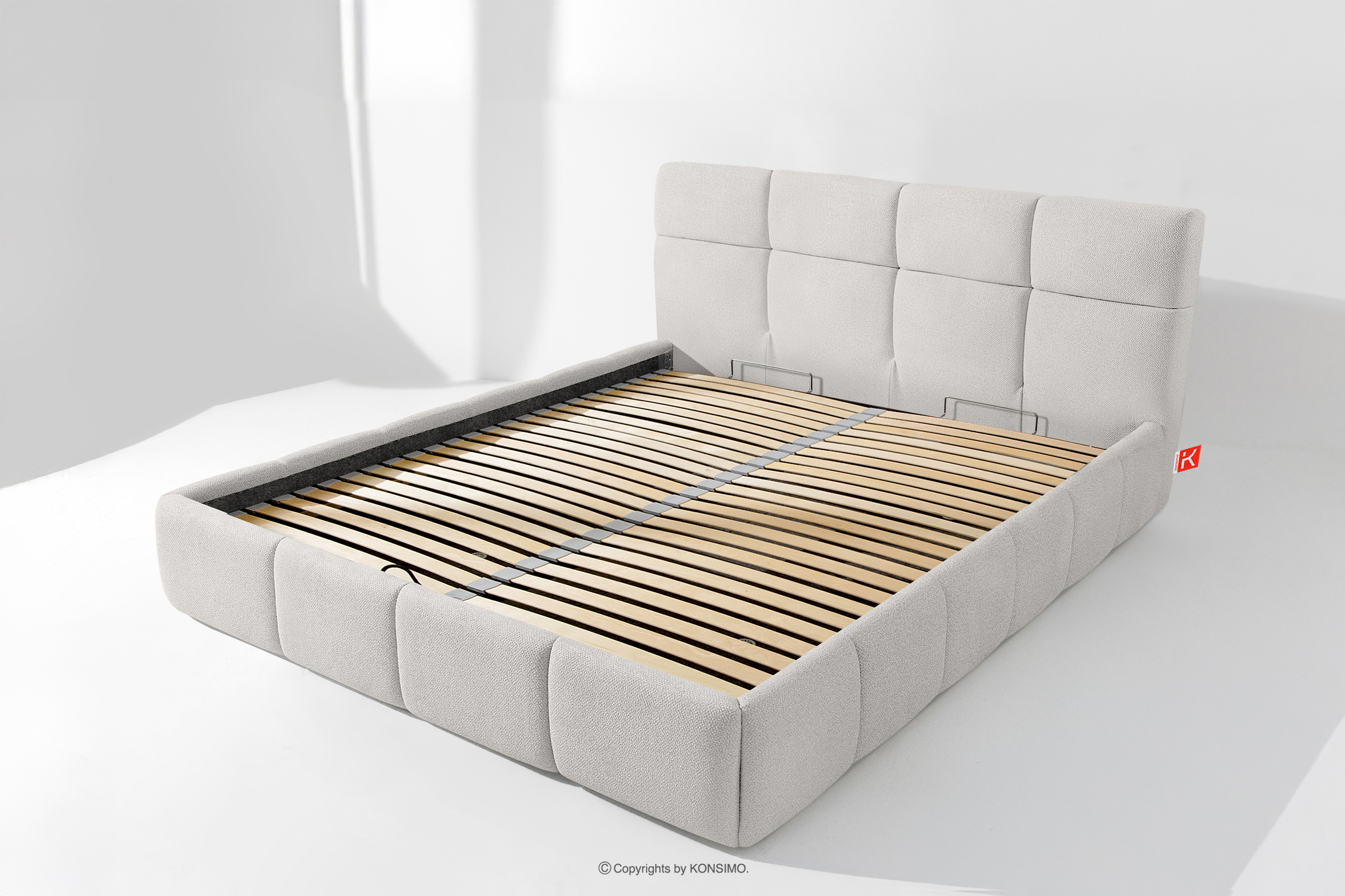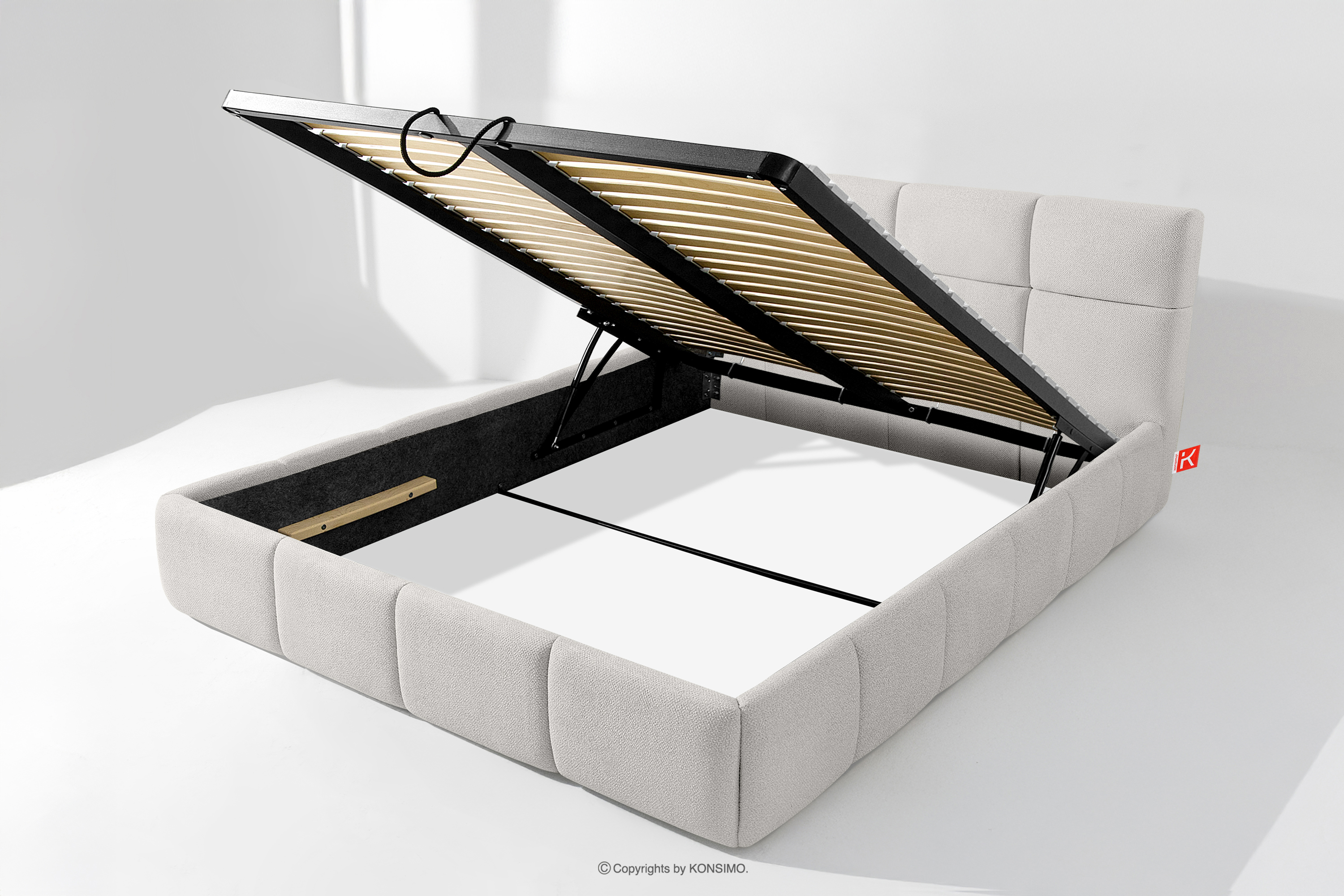 Co więcej, użytkownik ma możliwość personalizacji twardości łóżka – dzięki wyjmowanym listwom można uzyskać bardziej miękkie lub twardsze podłoże. Kolejnym udogodnieniem jest wygodny pojemnik na pościel, który otwiera się dzięki nowoczesnym siłownikom gazowym – bez wysiłku i z pełnym automatem. To praktyczne rozwiązanie pozwala na szybki dostęp do przechowywanej pościeli, bez konieczności podnoszenia ciężkiego materaca ręcznie.