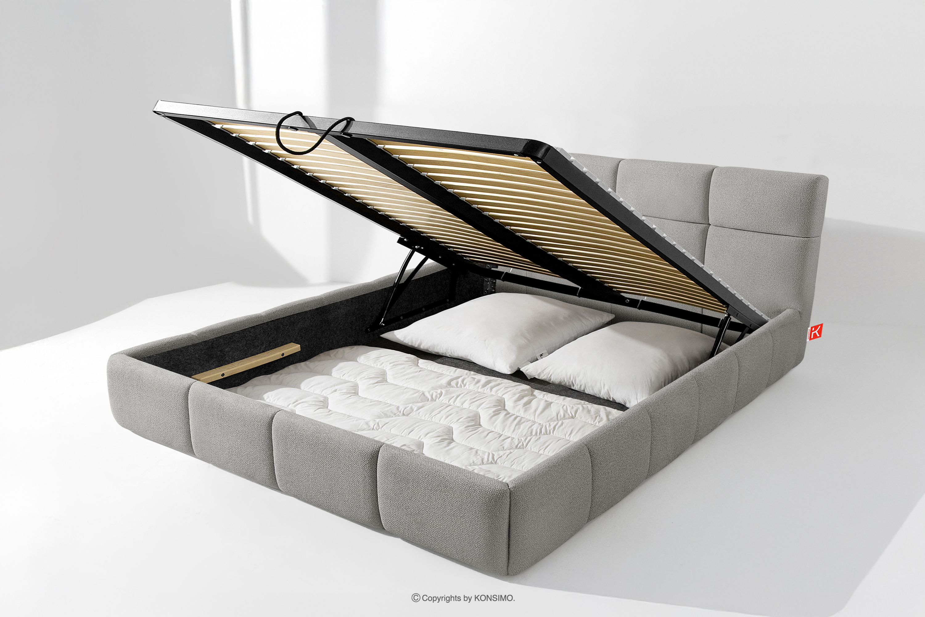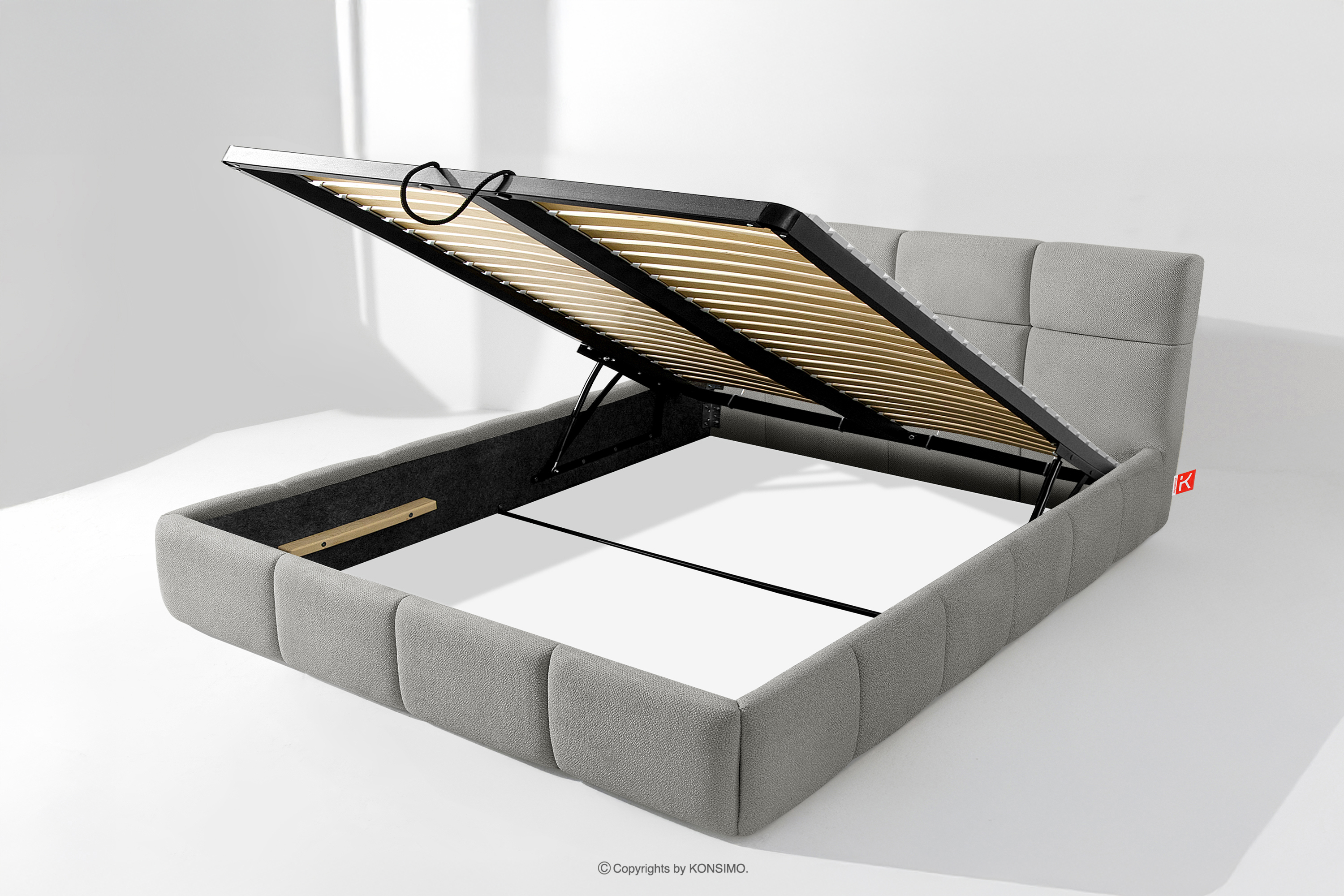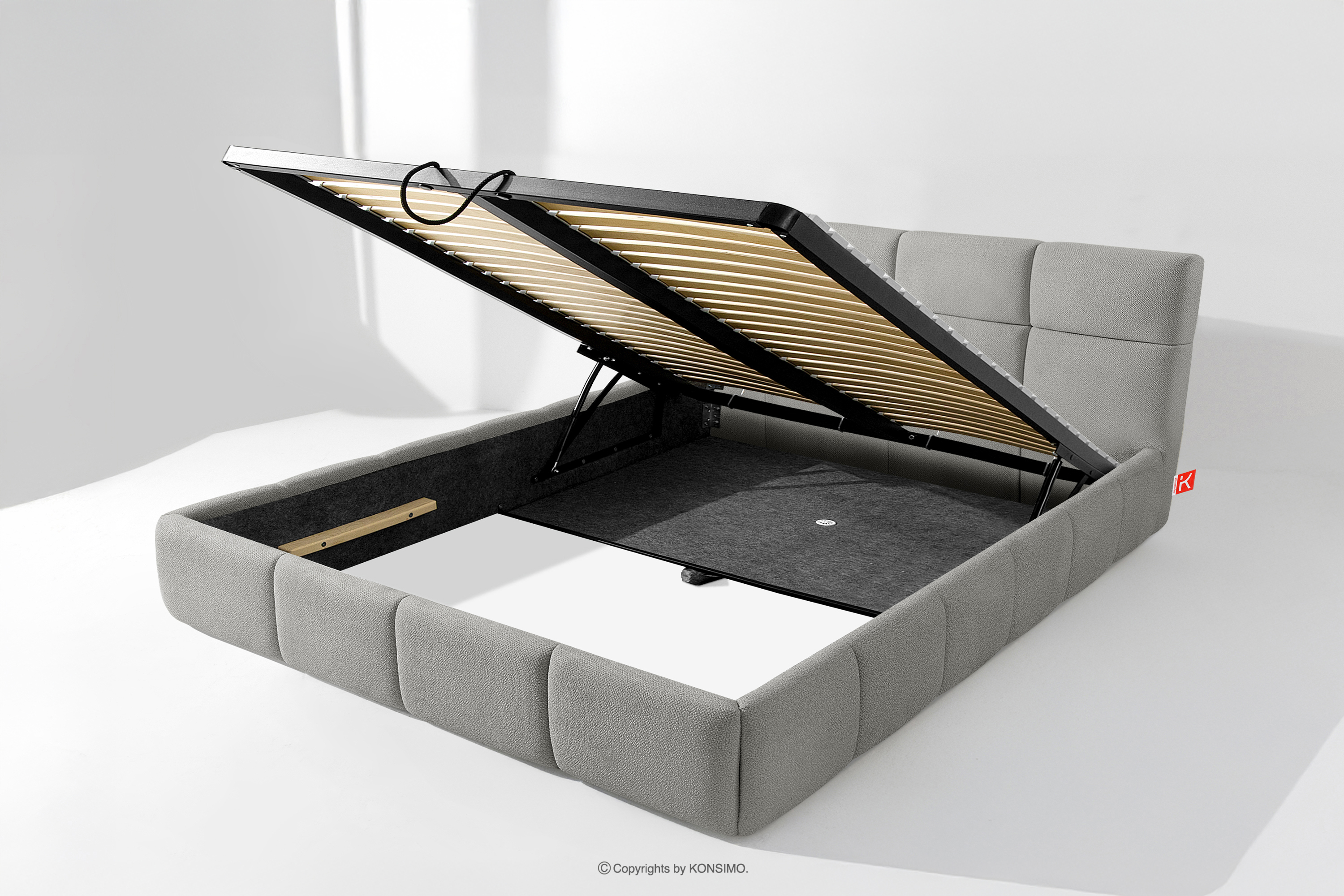 Co więcej, użytkownik ma możliwość personalizacji twardości łóżka – dzięki wyjmowanym listwom można uzyskać bardziej miękkie lub twardsze podłoże. Kolejnym udogodnieniem jest wygodny pojemnik na pościel, który otwiera się dzięki nowoczesnym siłownikom gazowym – bez wysiłku i z pełnym automatem. To praktyczne rozwiązanie pozwala na szybki dostęp do przechowywanej pościeli, bez konieczności podnoszenia ciężkiego materaca ręcznie.
