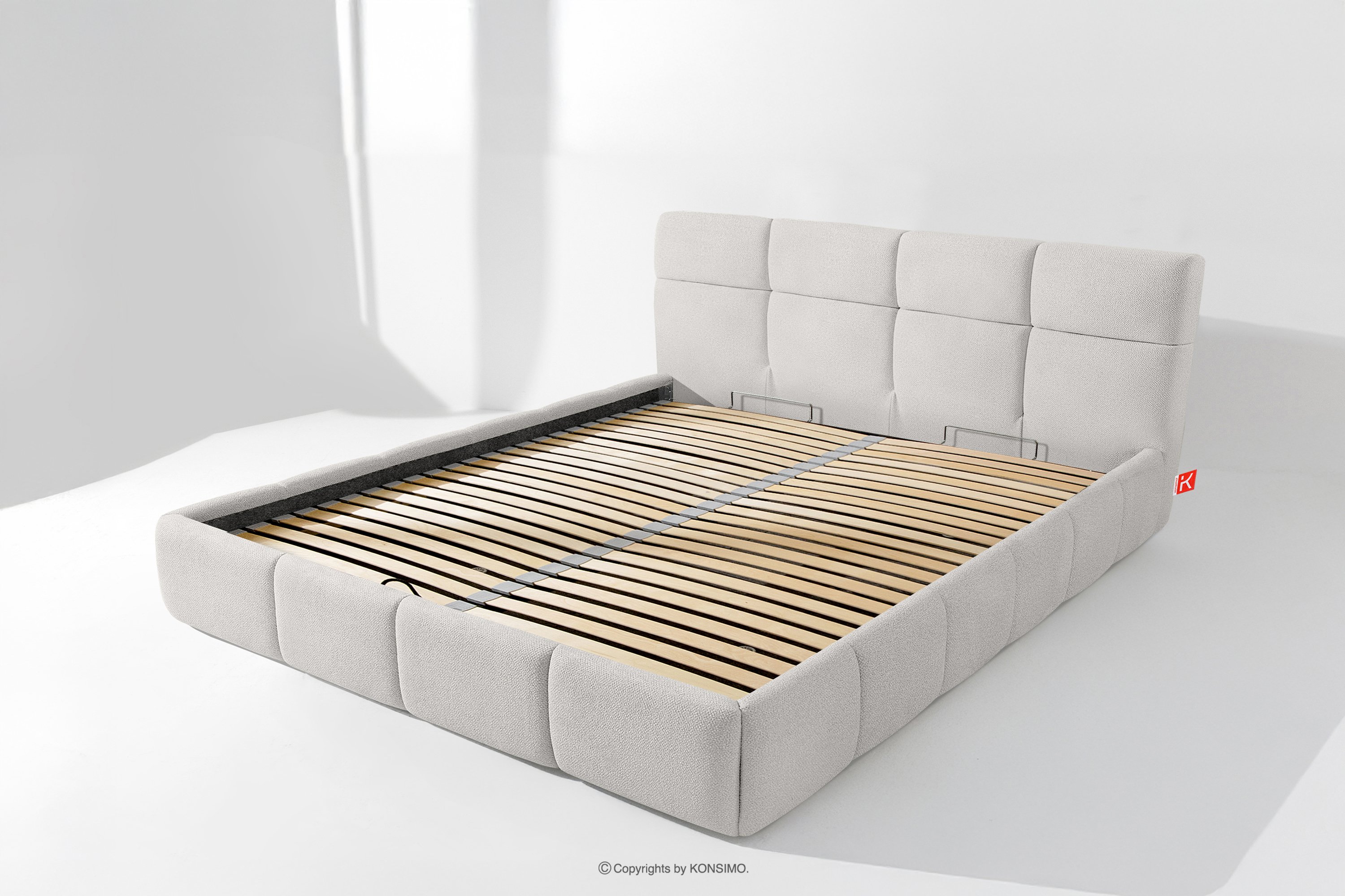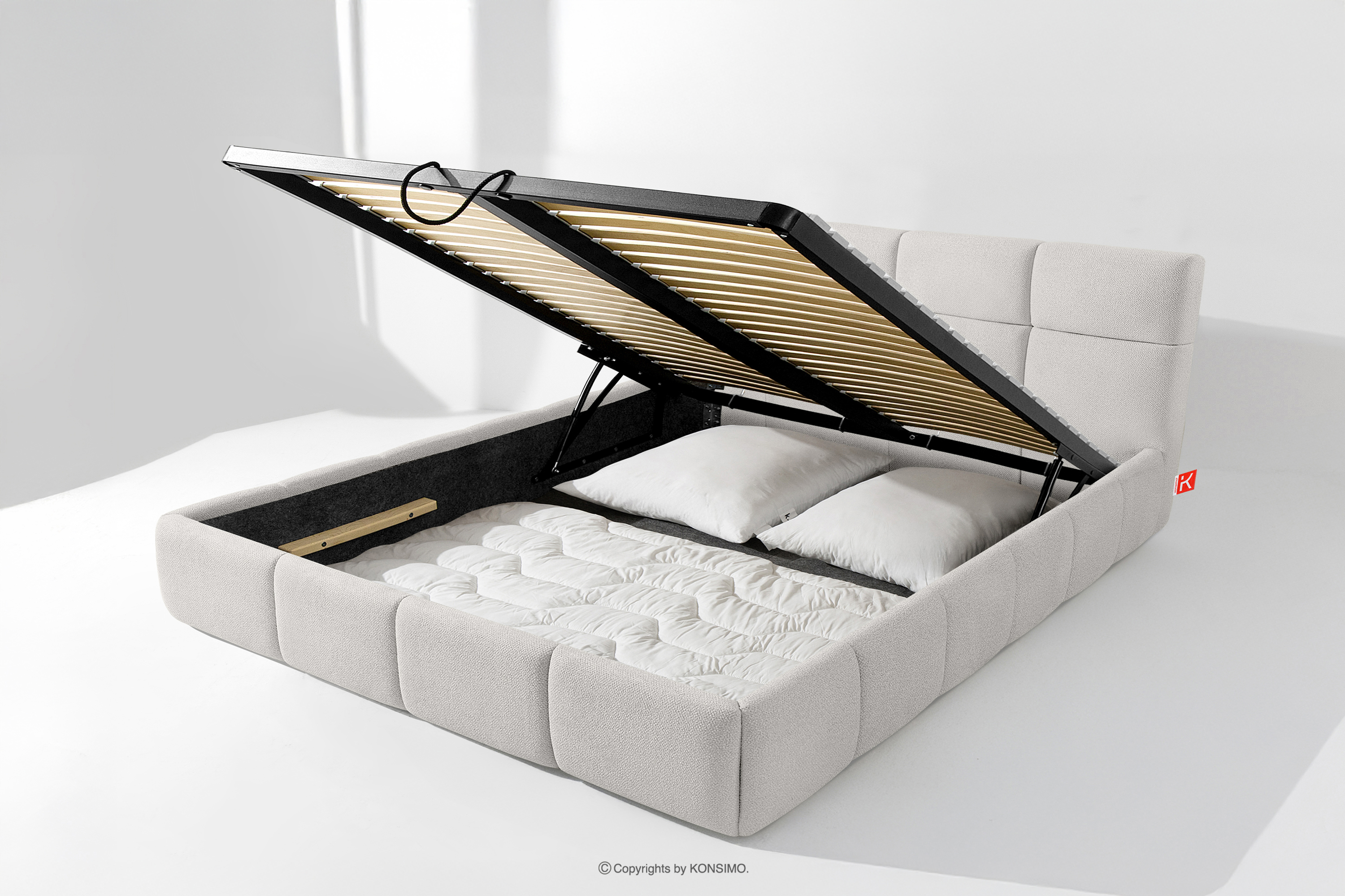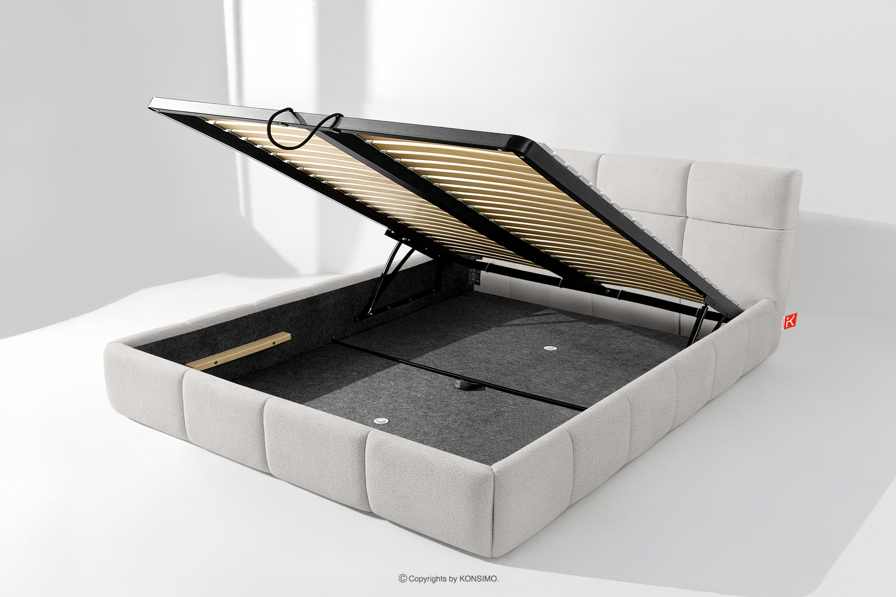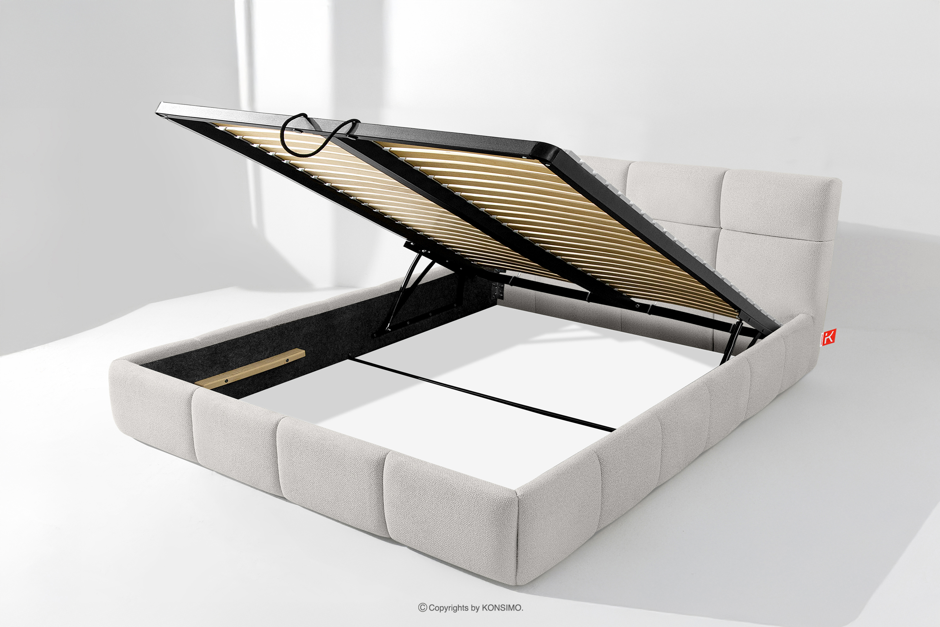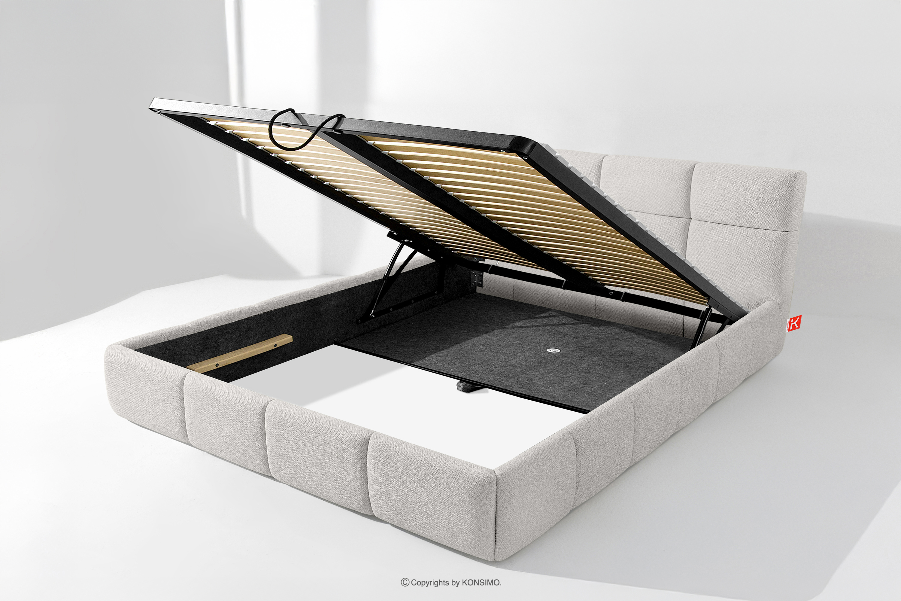 Co więcej, użytkownik ma możliwość personalizacji twardości łóżka – dzięki wyjmowanym listwom można uzyskać bardziej miękkie lub twardsze podłoże. Kolejnym udogodnieniem jest wygodny pojemnik na pościel, który otwiera się dzięki nowoczesnym siłownikom gazowym – bez wysiłku i z pełnym automatem. To praktyczne rozwiązanie pozwala na szybki dostęp do przechowywanej pościeli, bez konieczności podnoszenia ciężkiego materaca ręcznie.