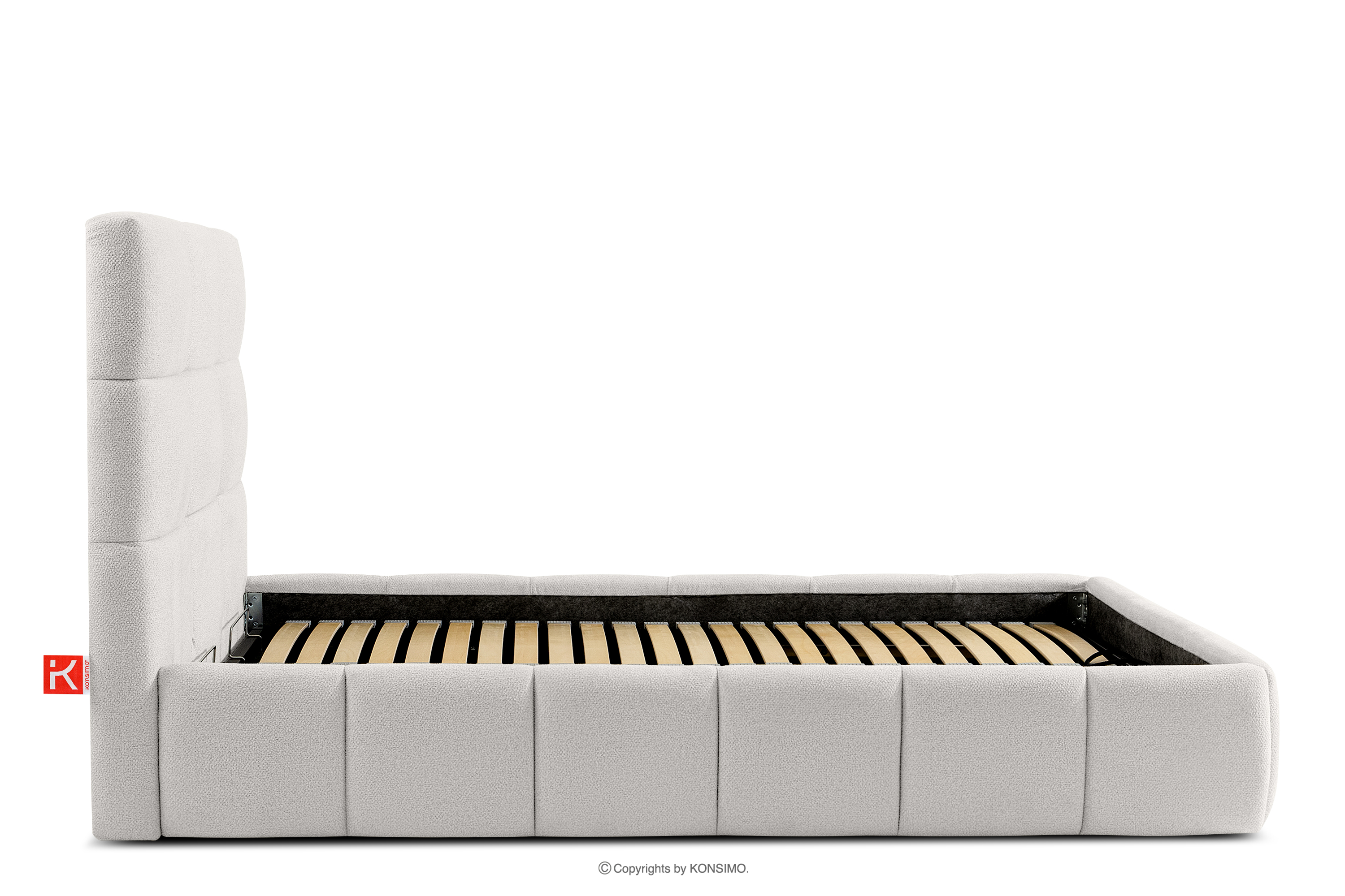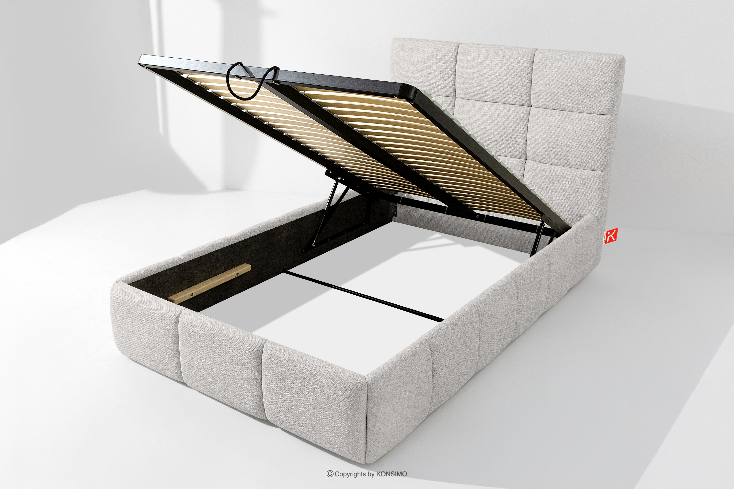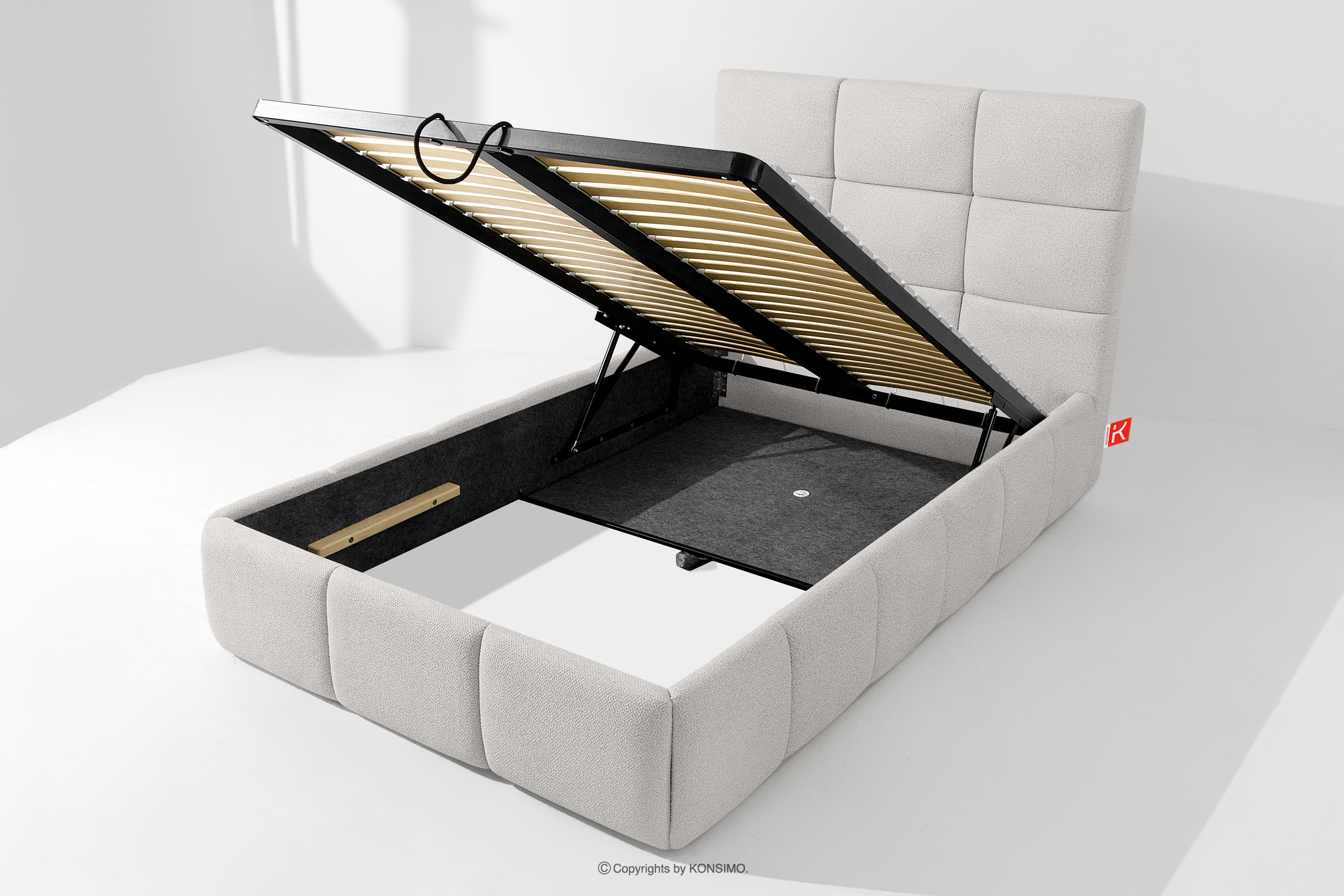Tkanina, którą pokryte jest łóżko, to materiał najwyższej jakości – nie tylko pięknie się prezentuje, dodając wnętrzu elegancji, ale również jest wysoce funkcjonalna. Odporna na przetarcia i codzienne zużycie. Tkanina doskonale pasuje do nowoczesnych i skandynawskich wnętrz, gdzie prostota idzie w parze z funkcjonalnością. Podłoga w skrzyni łóżka jest wyjmowana, co ułatwia sprzątanie pod meblem. Dodatkowo ściany i płyta podłogowa skrzyni wykończone są filcem, który zapobiega ślizganiu się pościeli i innych przechowywanych rzeczy, zachowując przy tym porządek i estetykę.