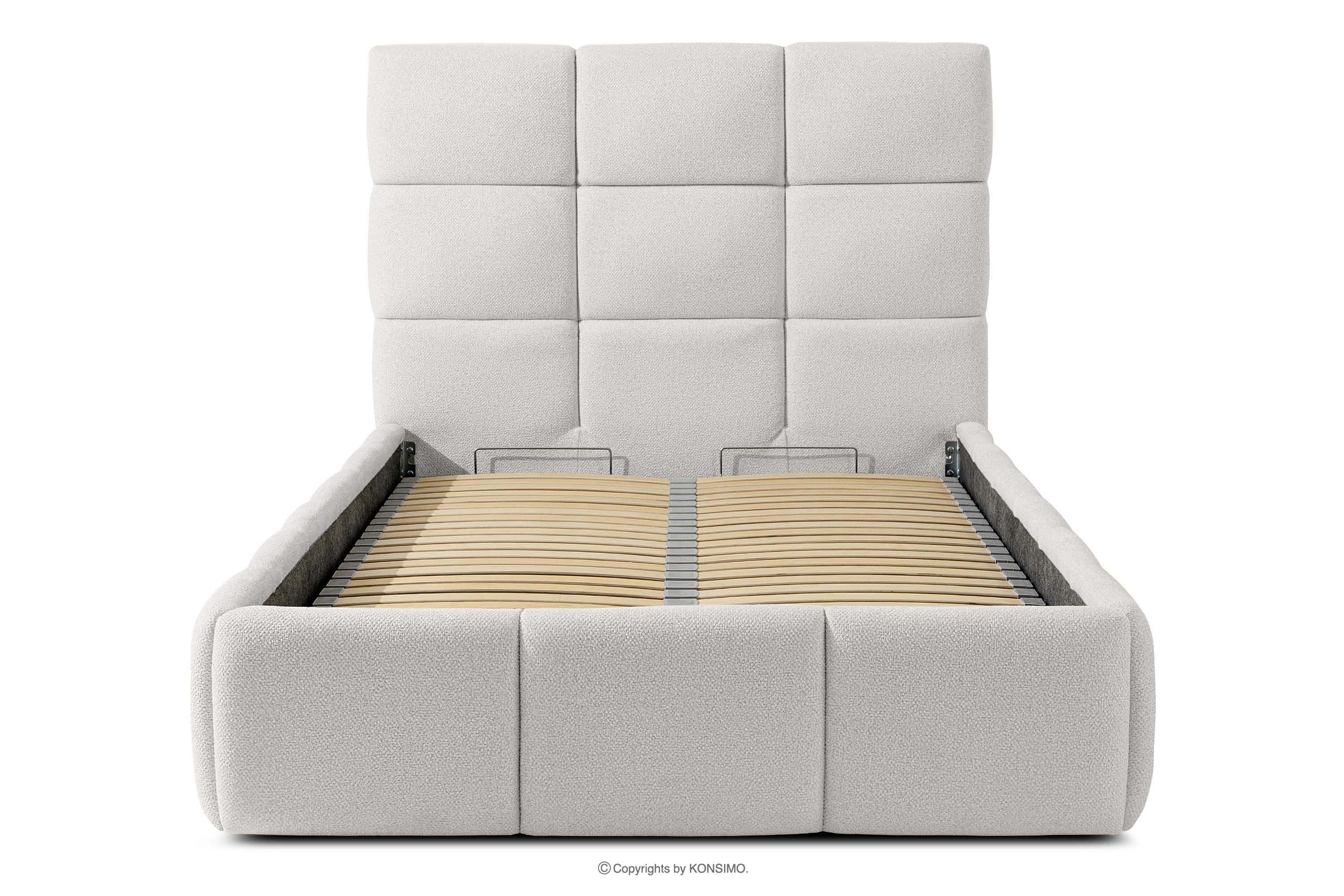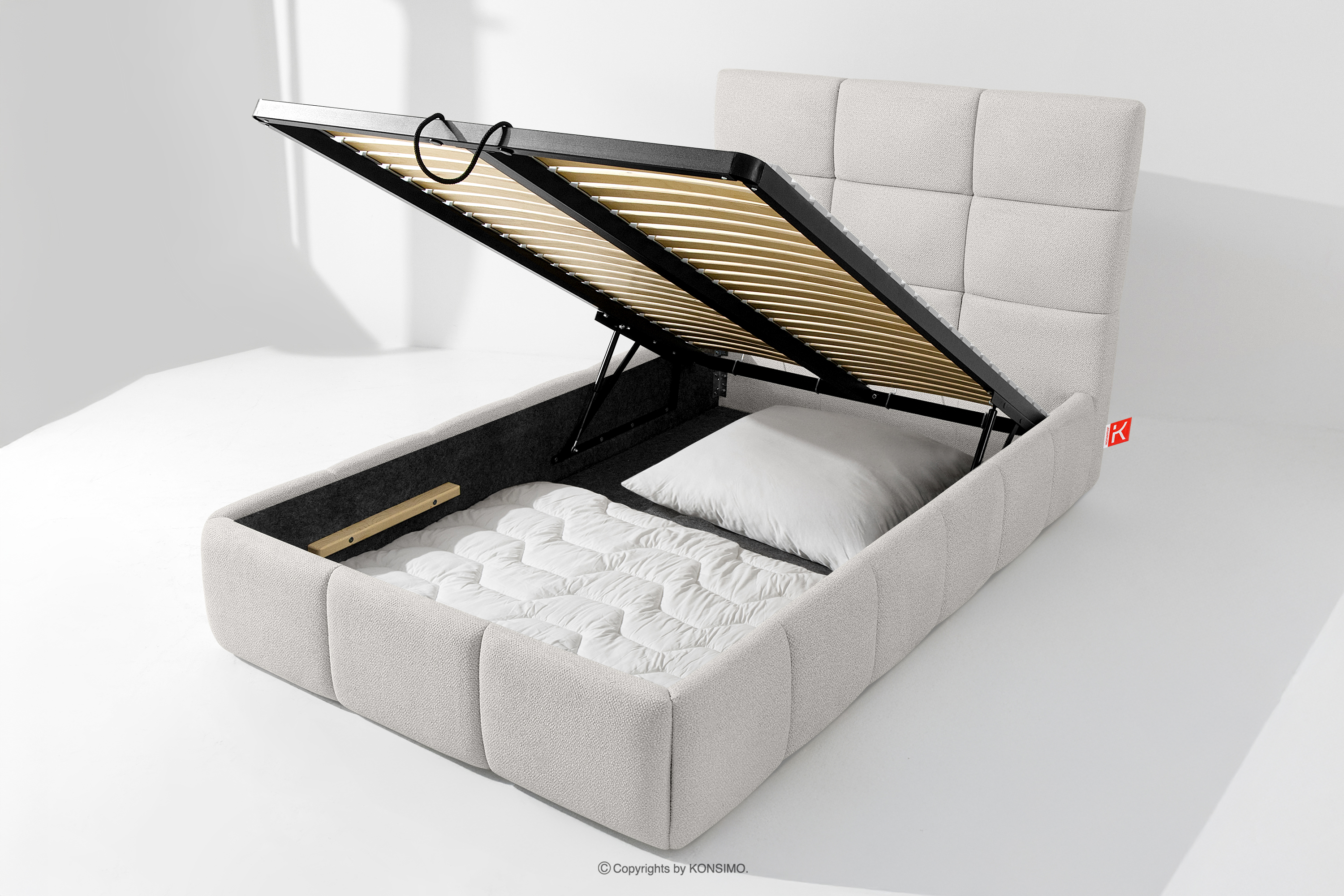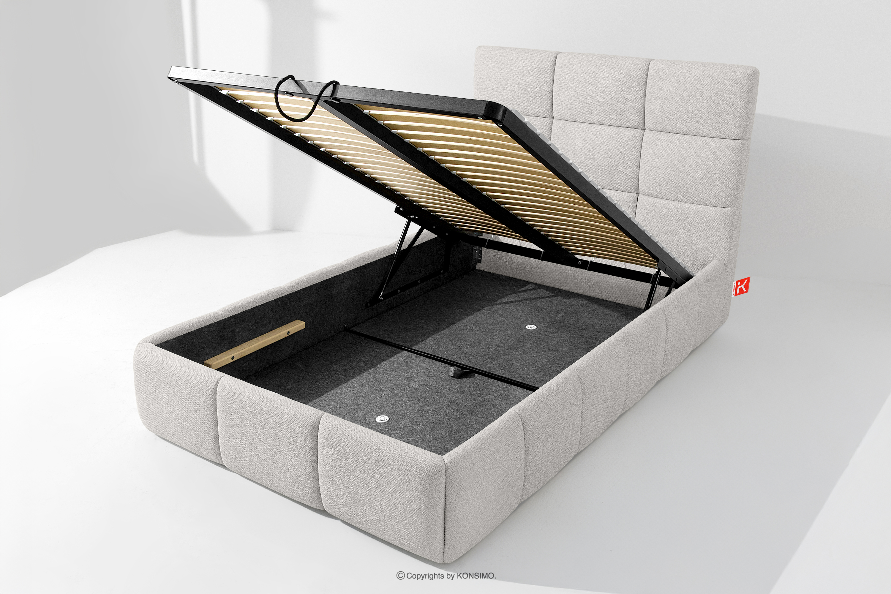 Tkanina, którą pokryte jest łóżko, to materiał najwyższej jakości – nie tylko pięknie się prezentuje, dodając wnętrzu elegancji, ale również jest wysoce funkcjonalna. Odporna na przetarcia i codzienne zużycie. Tkanina doskonale pasuje do nowoczesnych i skandynawskich wnętrz, gdzie prostota idzie w parze z funkcjonalnością. Podłoga w skrzyni łóżka jest wyjmowana, co ułatwia sprzątanie pod meblem. Dodatkowo ściany i płyta podłogowa skrzyni wykończone są filcem, który zapobiega ślizganiu się pościeli i innych przechowywanych rzeczy, zachowując przy tym porządek i estetykę.