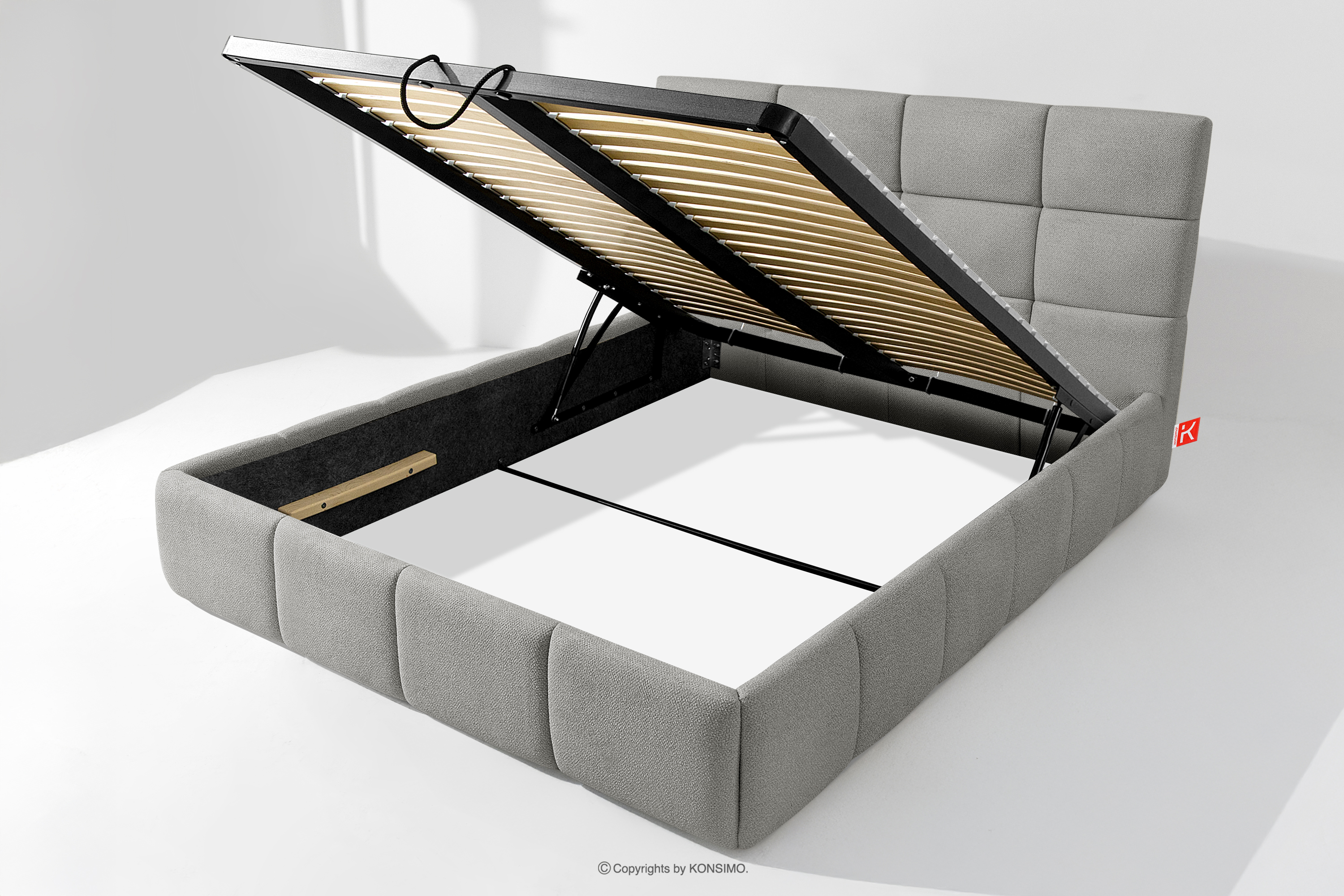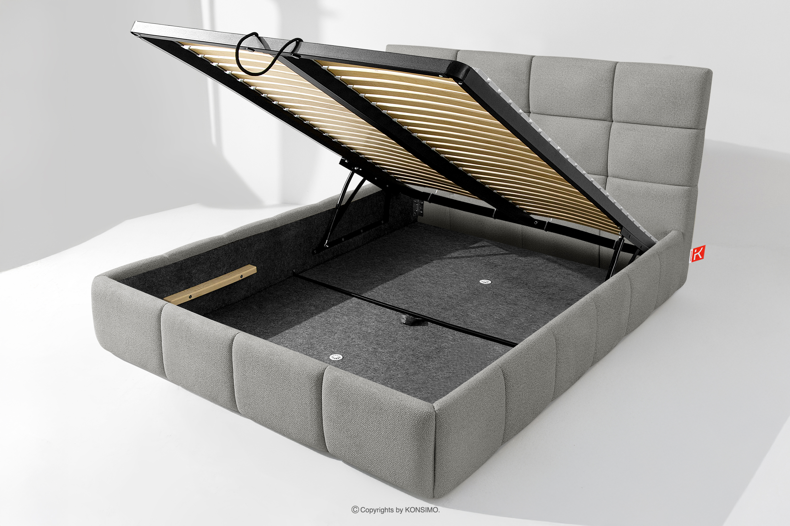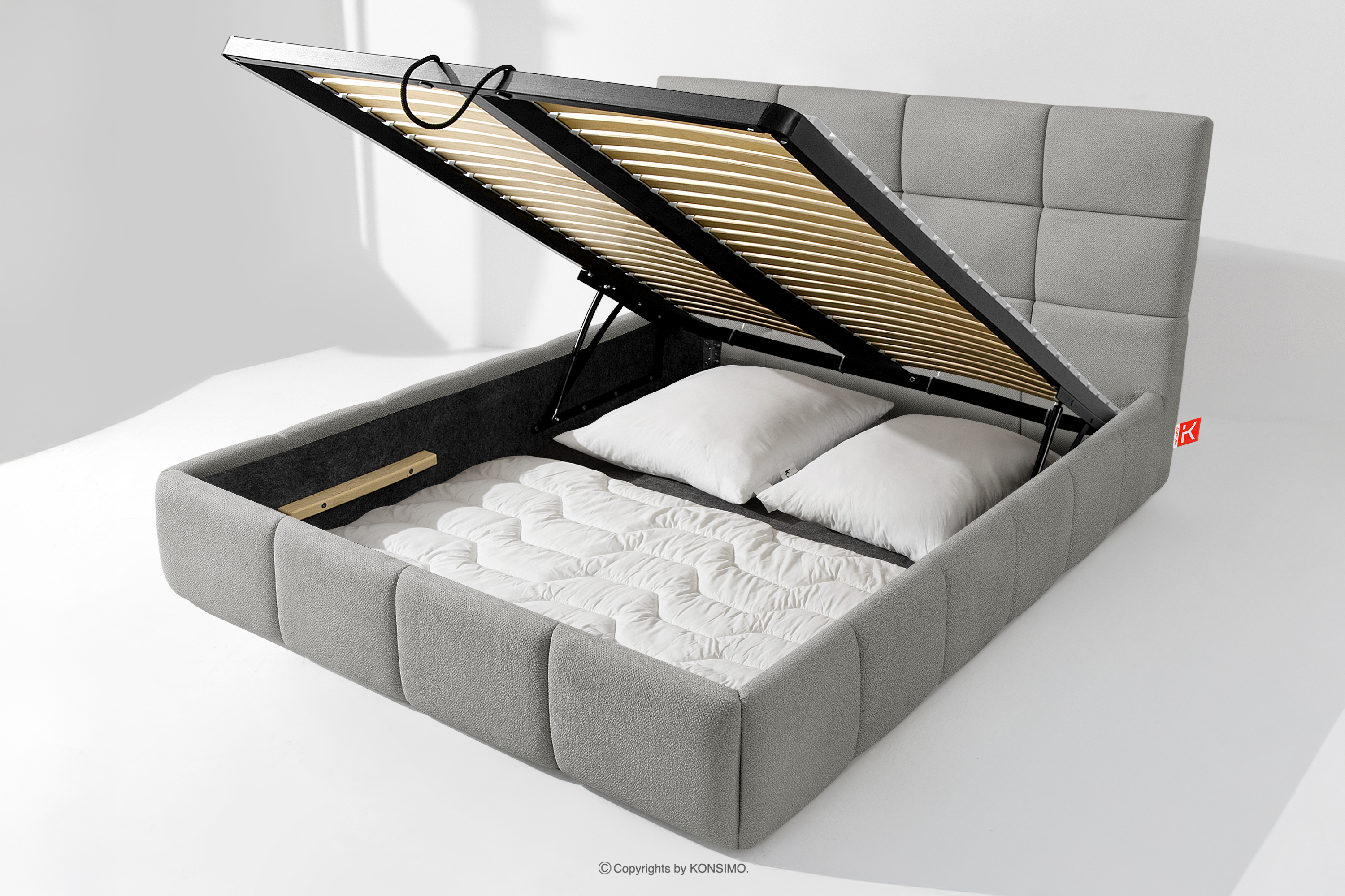 Co więcej, użytkownik ma możliwość personalizacji twardości łóżka – dzięki wyjmowanym listwom można uzyskać bardziej miękkie lub twardsze podłoże. Kolejnym udogodnieniem jest wygodny pojemnik na pościel, który otwiera się dzięki nowoczesnym siłownikom gazowym – bez wysiłku i z pełnym automatem. To praktyczne rozwiązanie pozwala na szybki dostęp do przechowywanej pościeli, bez konieczności podnoszenia ciężkiego materaca ręcznie.