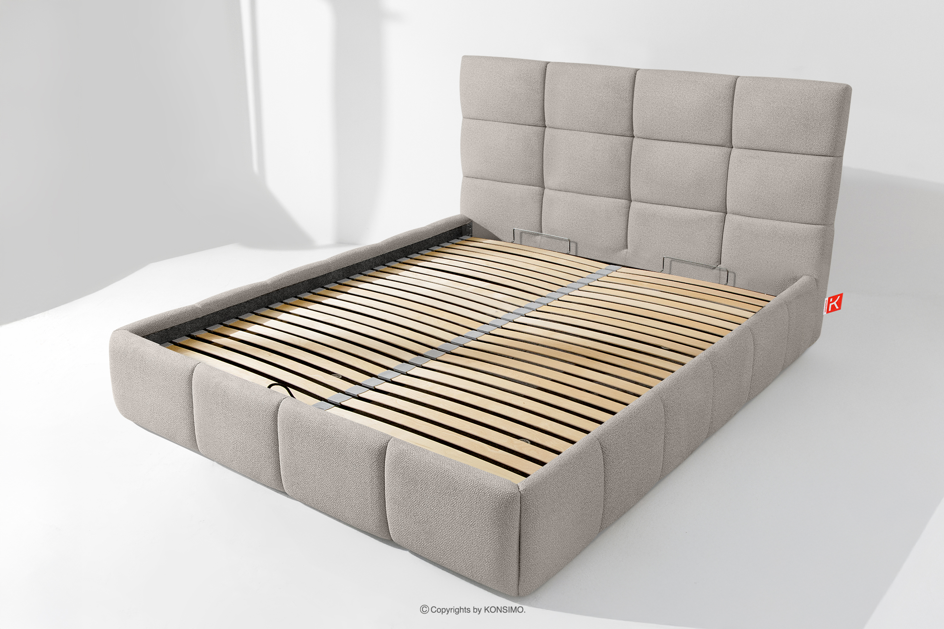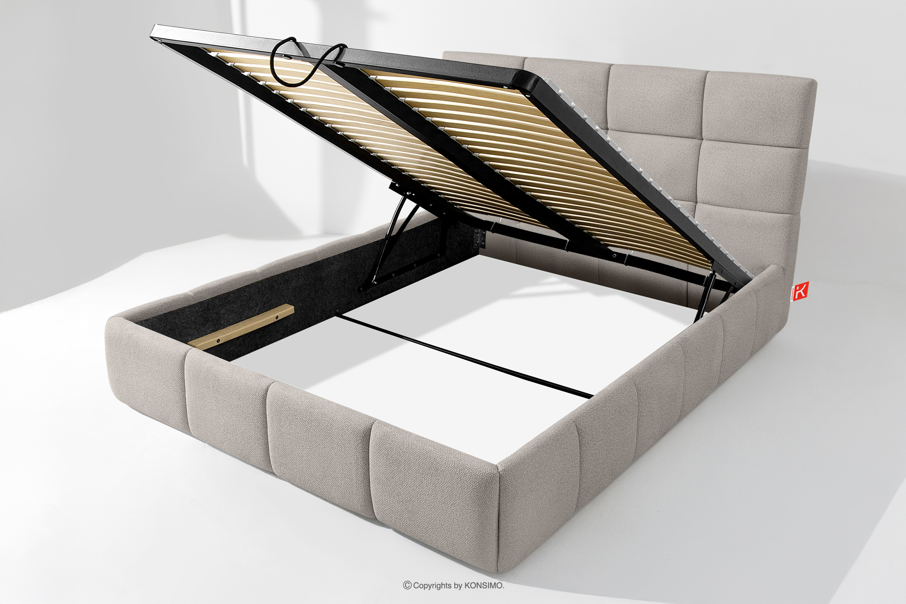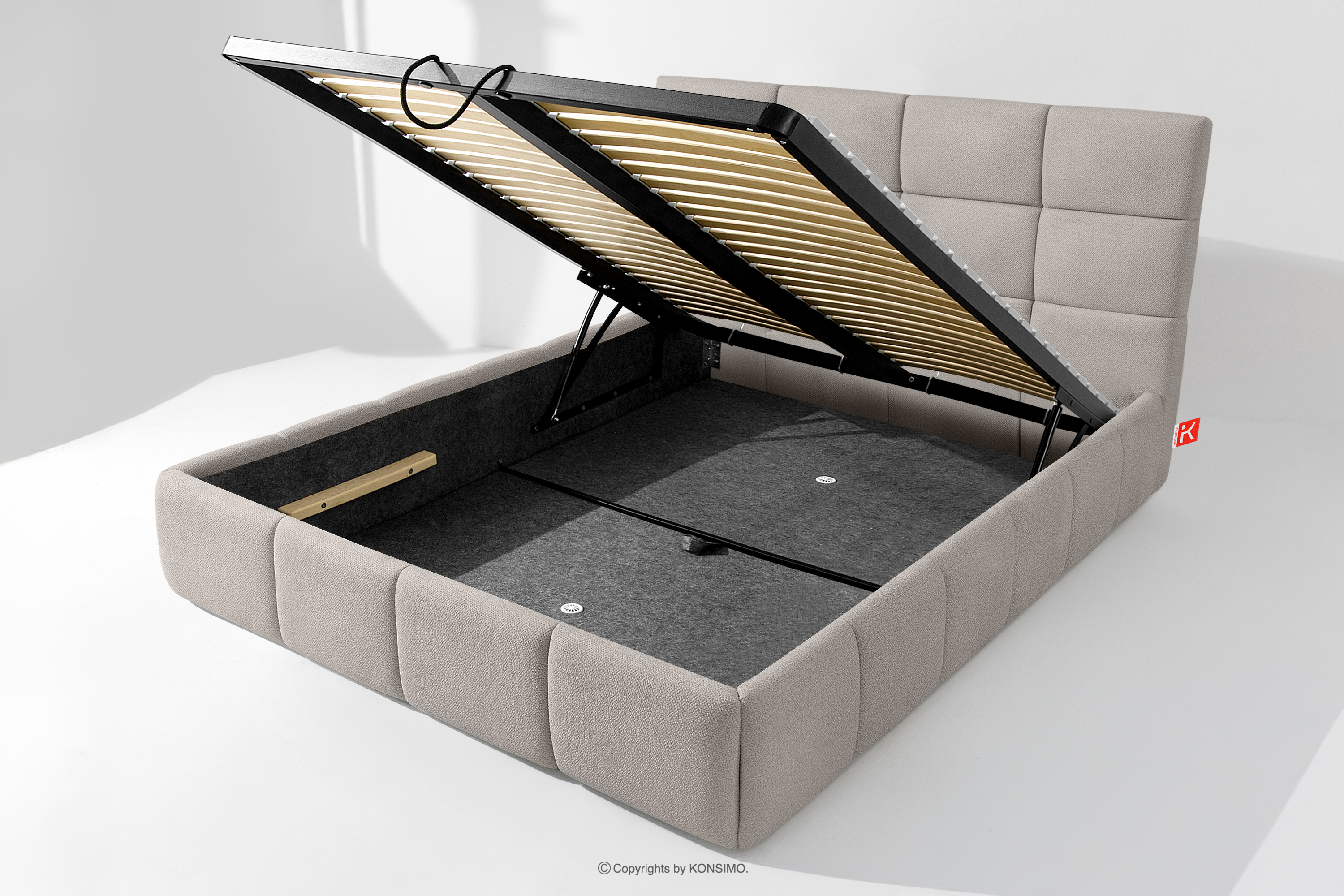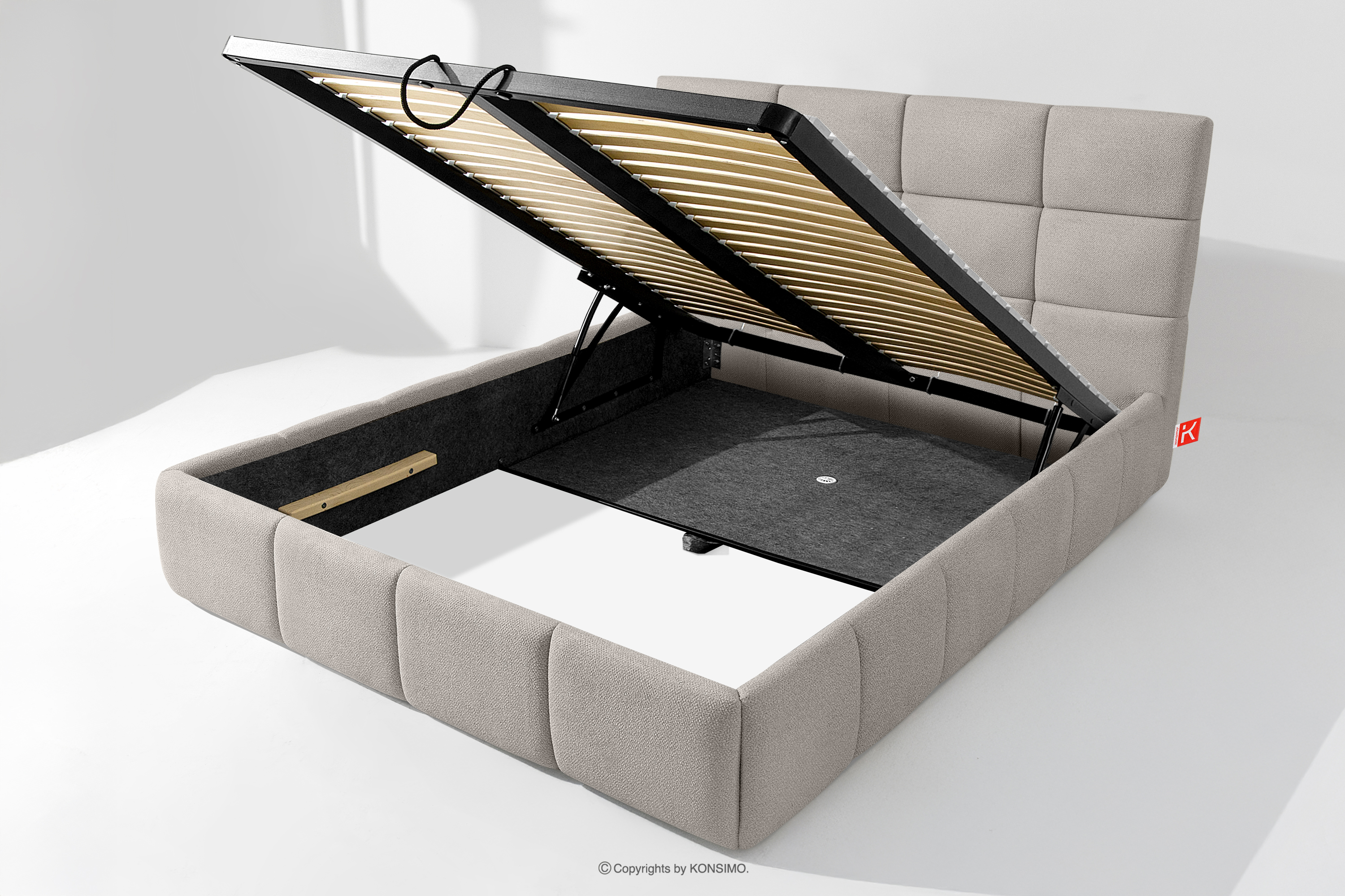 Tkanina, którą pokryte jest łóżko, to materiał najwyższej jakości – nie tylko pięknie się prezentuje, dodając wnętrzu elegancji, ale również jest wysoce funkcjonalna. Odporna na przetarcia i codzienne zużycie. Tkanina doskonale pasuje do nowoczesnych i skandynawskich wnętrz, gdzie prostota idzie w parze z funkcjonalnością. Podłoga w skrzyni łóżka jest wyjmowana, co ułatwia sprzątanie pod meblem. Dodatkowo ściany i płyta podłogowa skrzyni wykończone są filcem, który zapobiega ślizganiu się pościeli i innych przechowywanych rzeczy, zachowując przy tym porządek i estetykę.