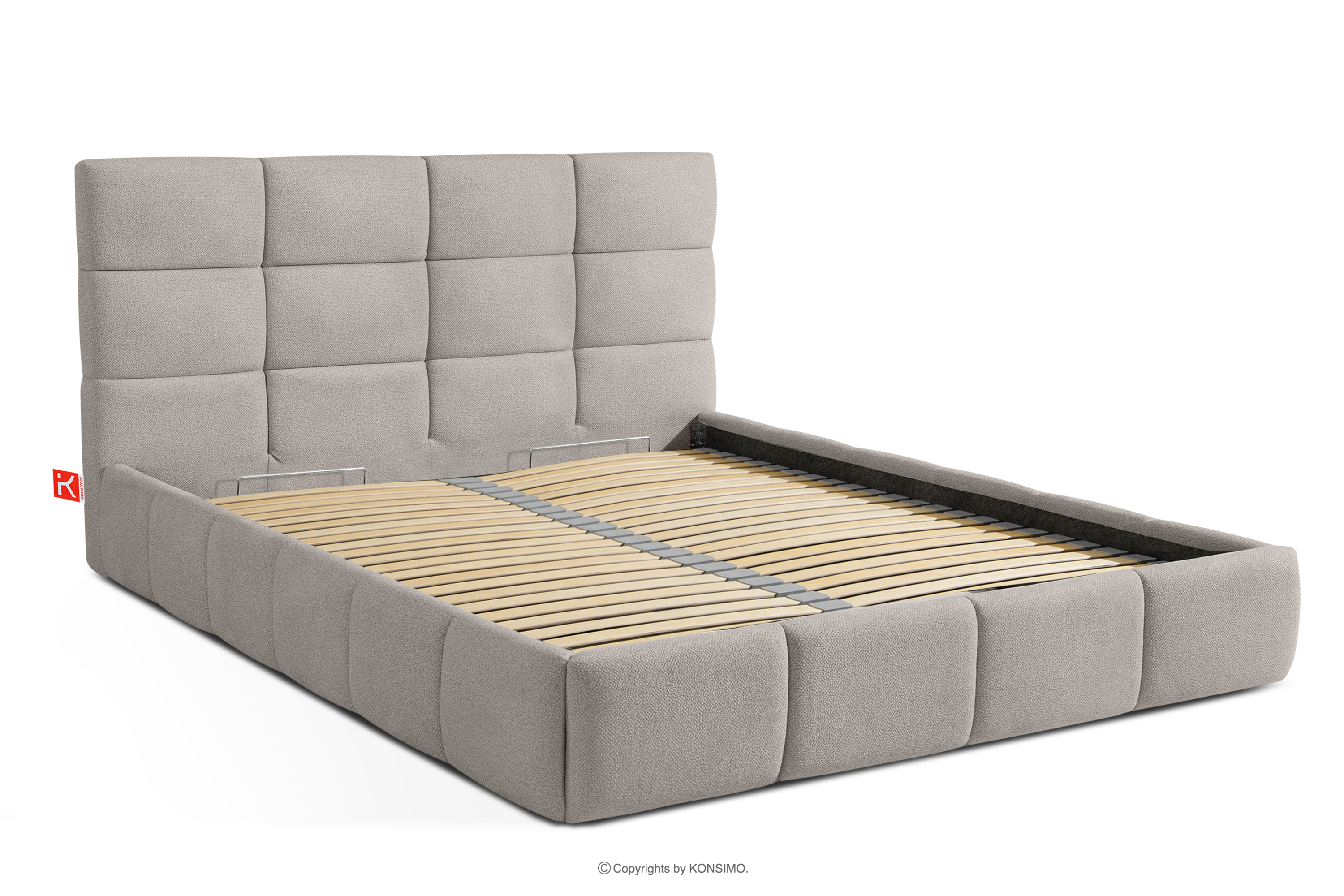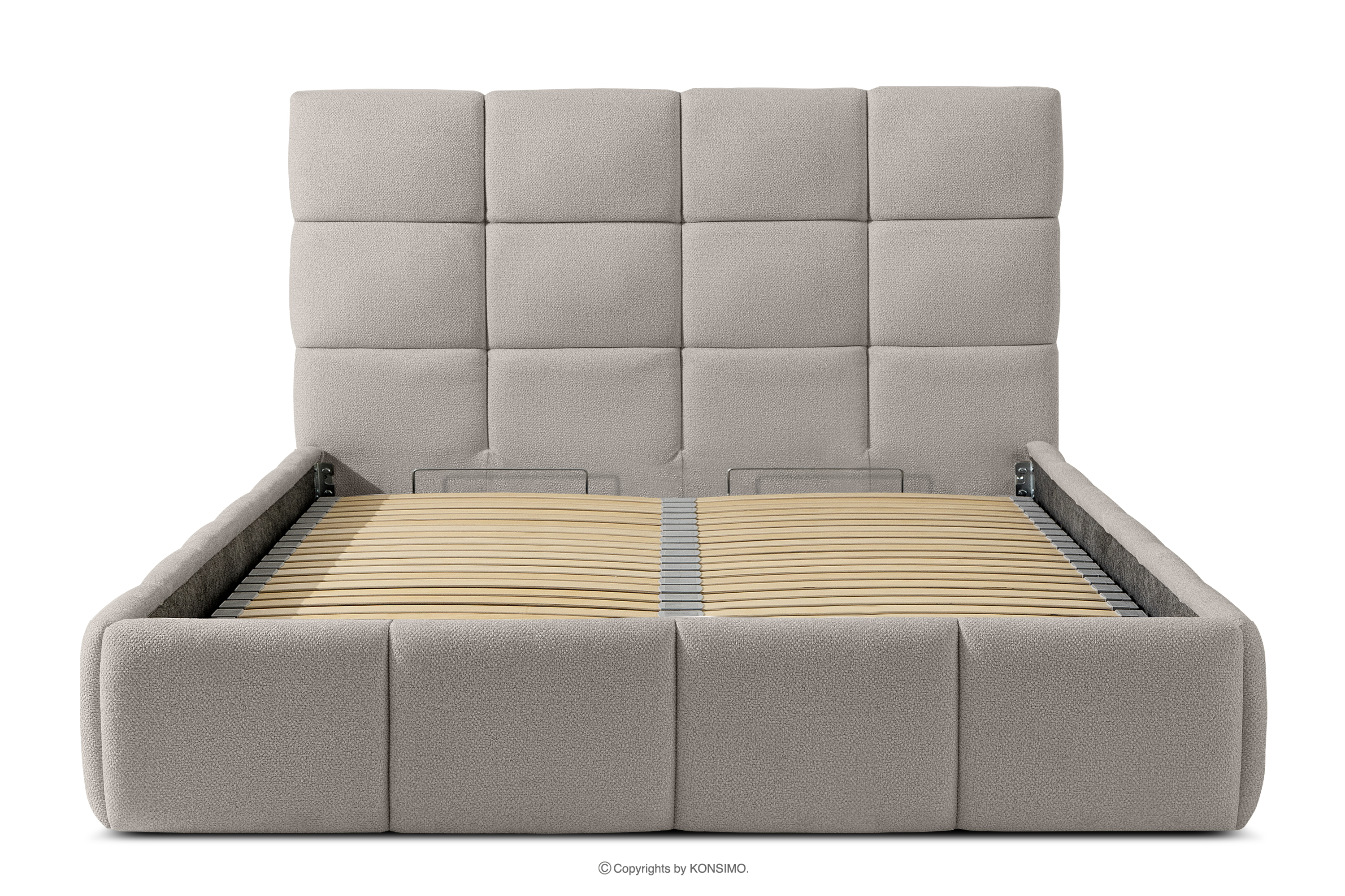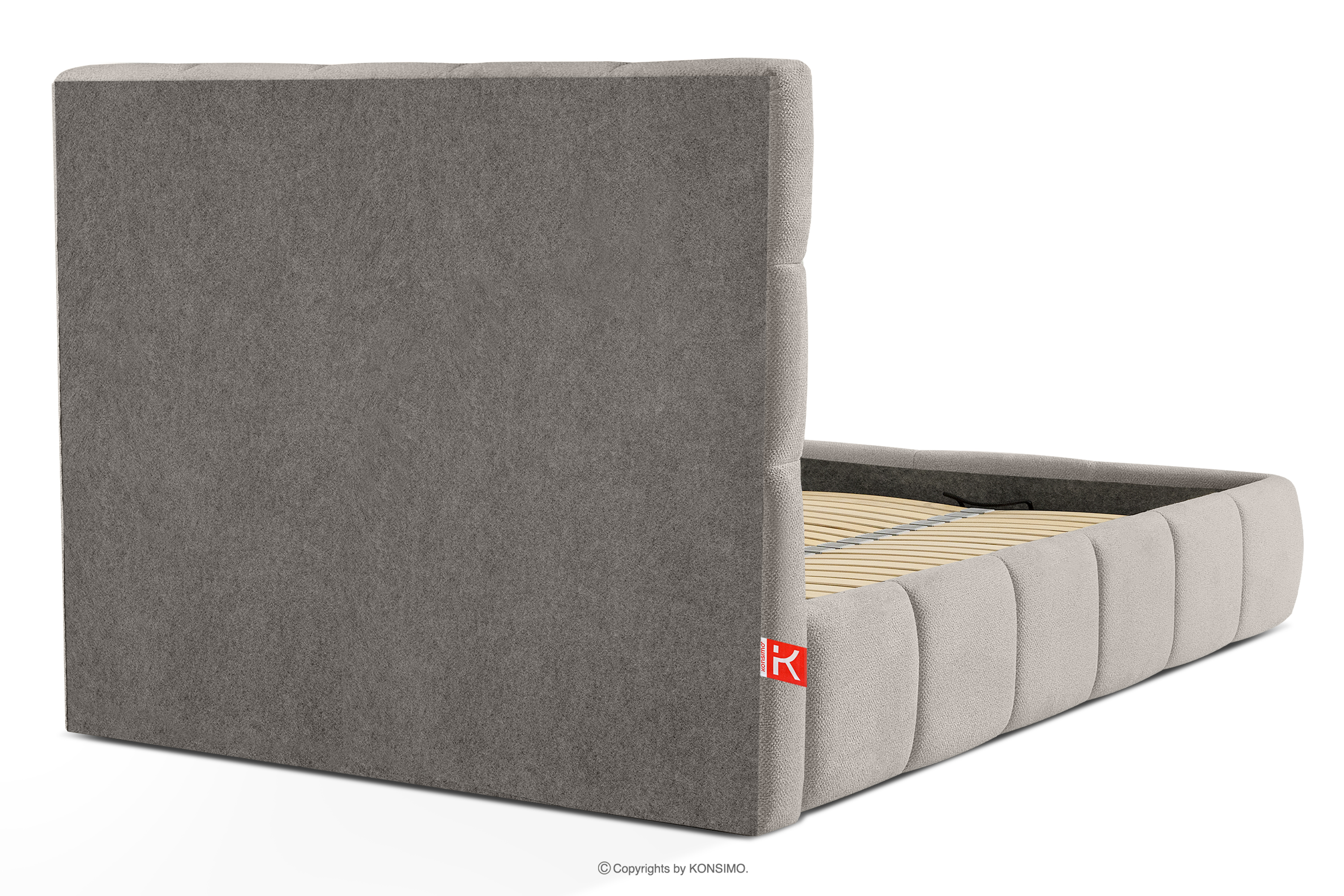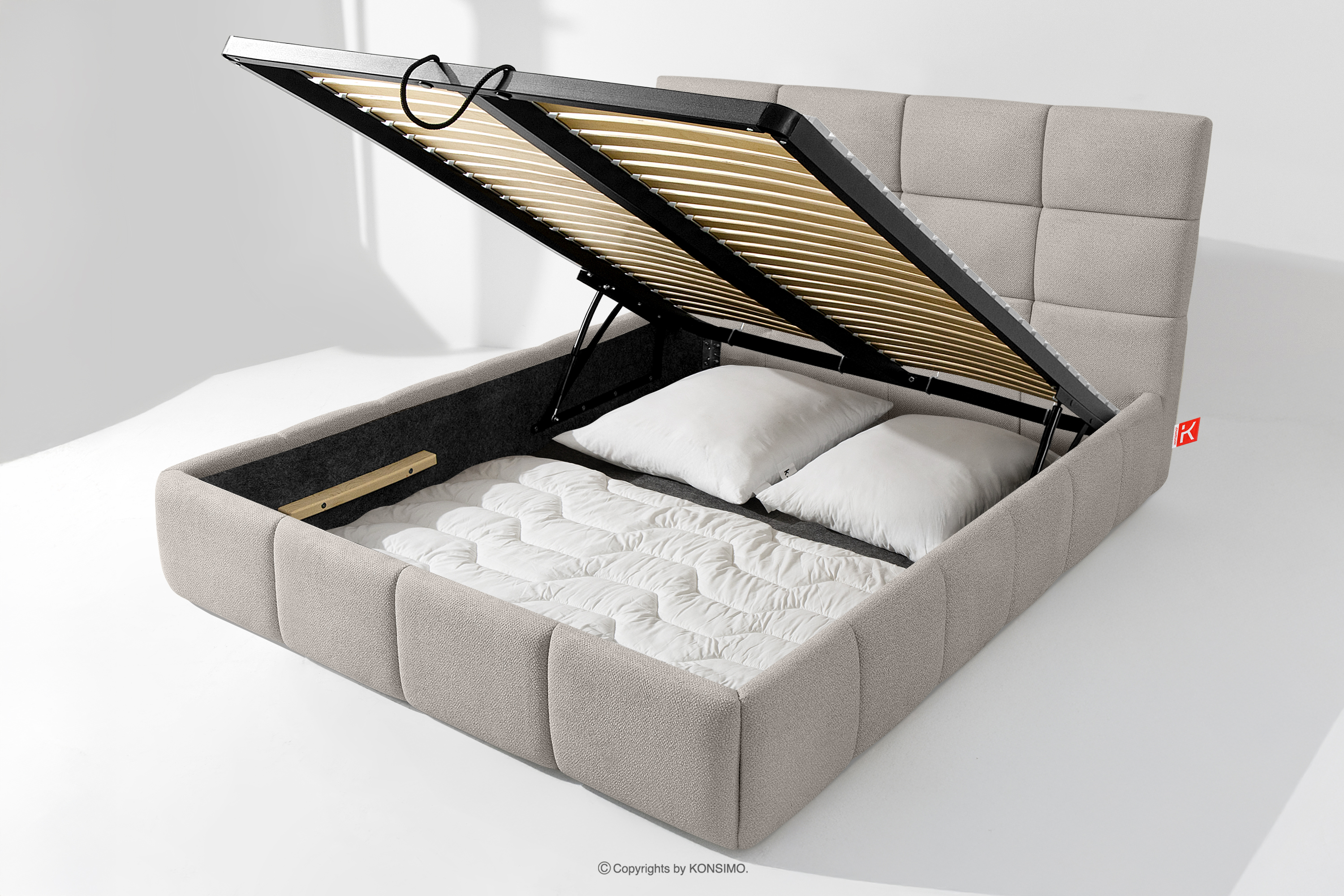 Tkanina, którą pokryte jest łóżko, to materiał najwyższej jakości – nie tylko pięknie się prezentuje, dodając wnętrzu elegancji, ale również jest wysoce funkcjonalna. Odporna na przetarcia i codzienne zużycie. Tkanina doskonale pasuje do nowoczesnych i skandynawskich wnętrz, gdzie prostota idzie w parze z funkcjonalnością. Podłoga w skrzyni łóżka jest wyjmowana, co ułatwia sprzątanie pod meblem. Dodatkowo ściany i płyta podłogowa skrzyni wykończone są filcem, który zapobiega ślizganiu się pościeli i innych przechowywanych rzeczy, zachowując przy tym porządek i estetykę.