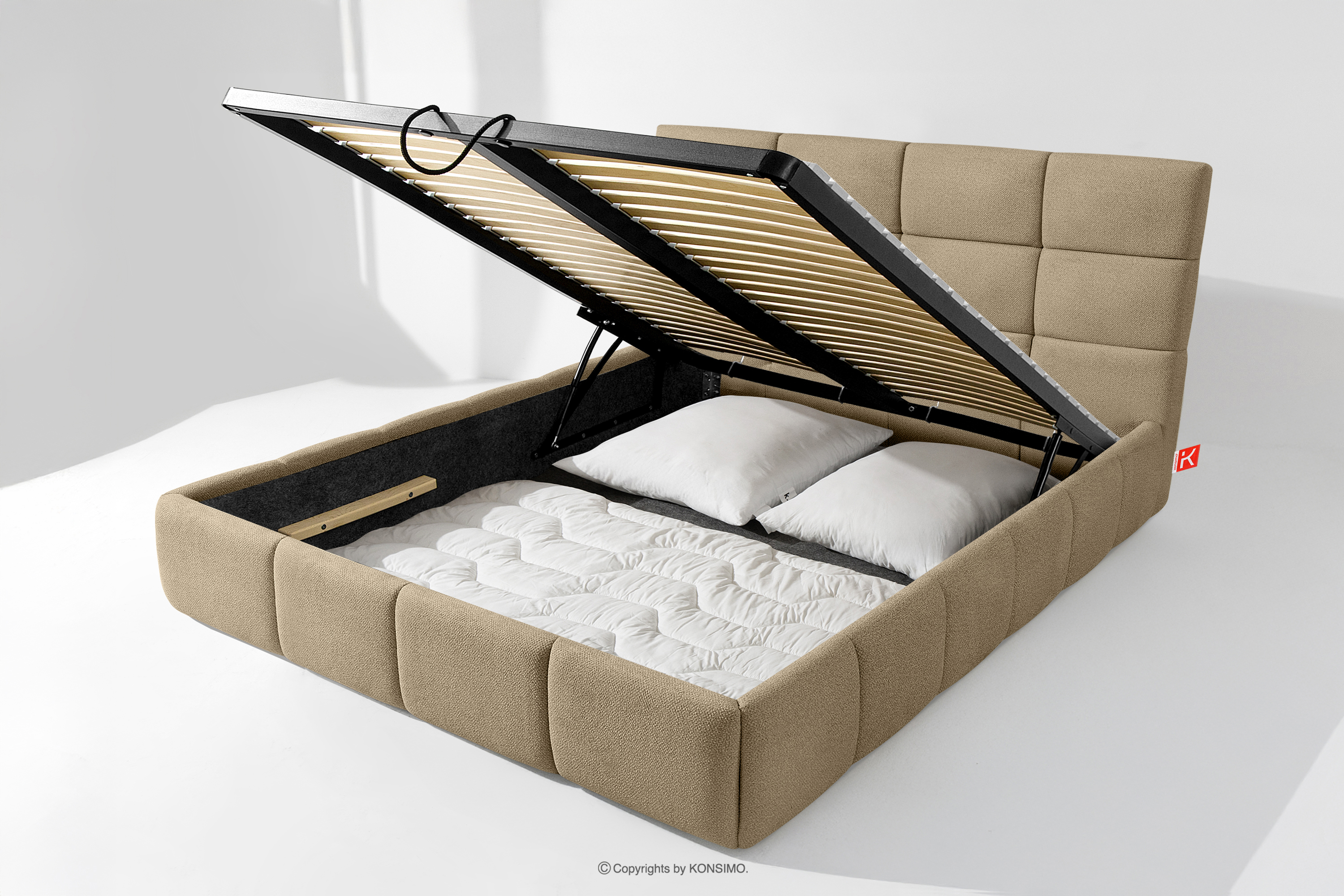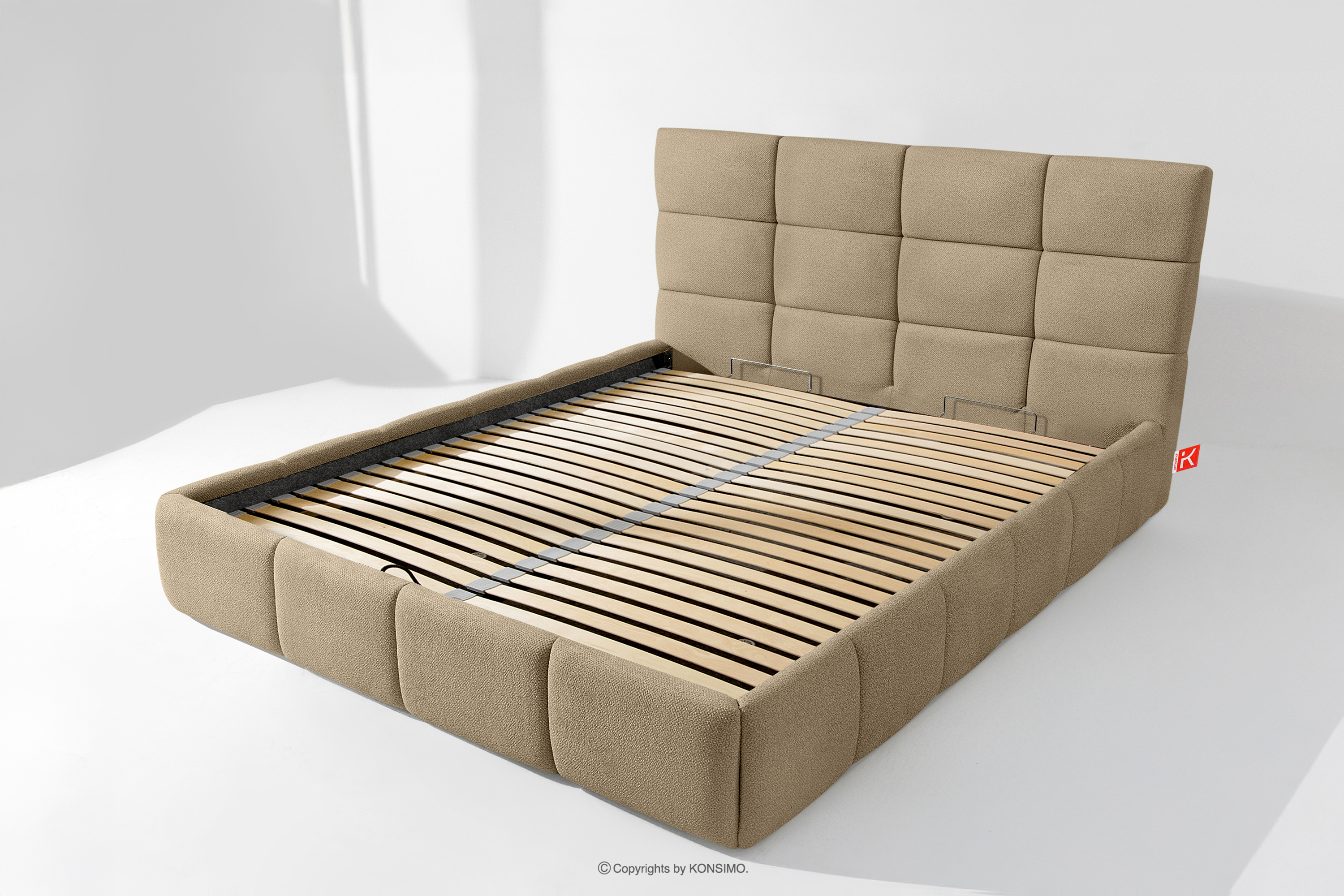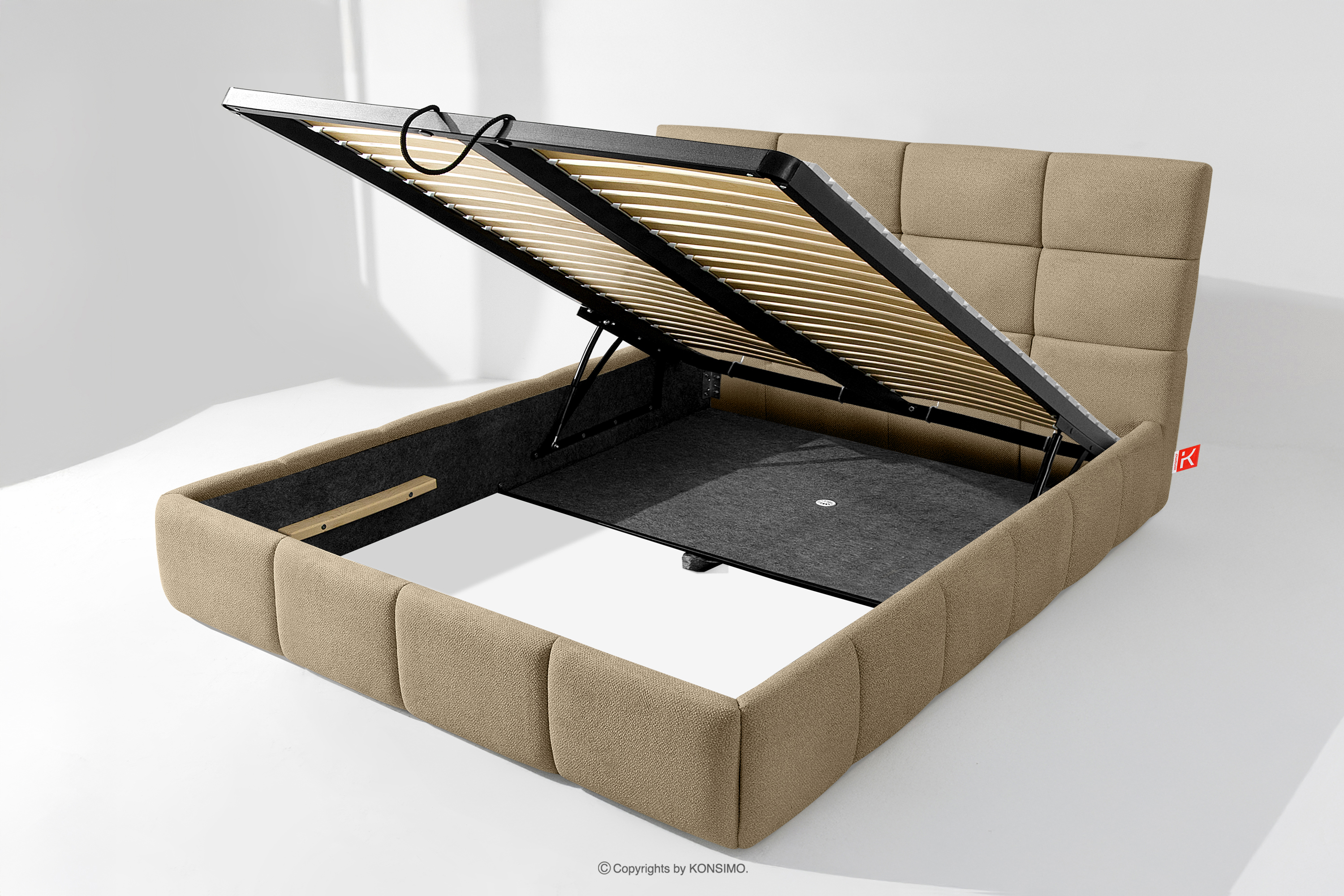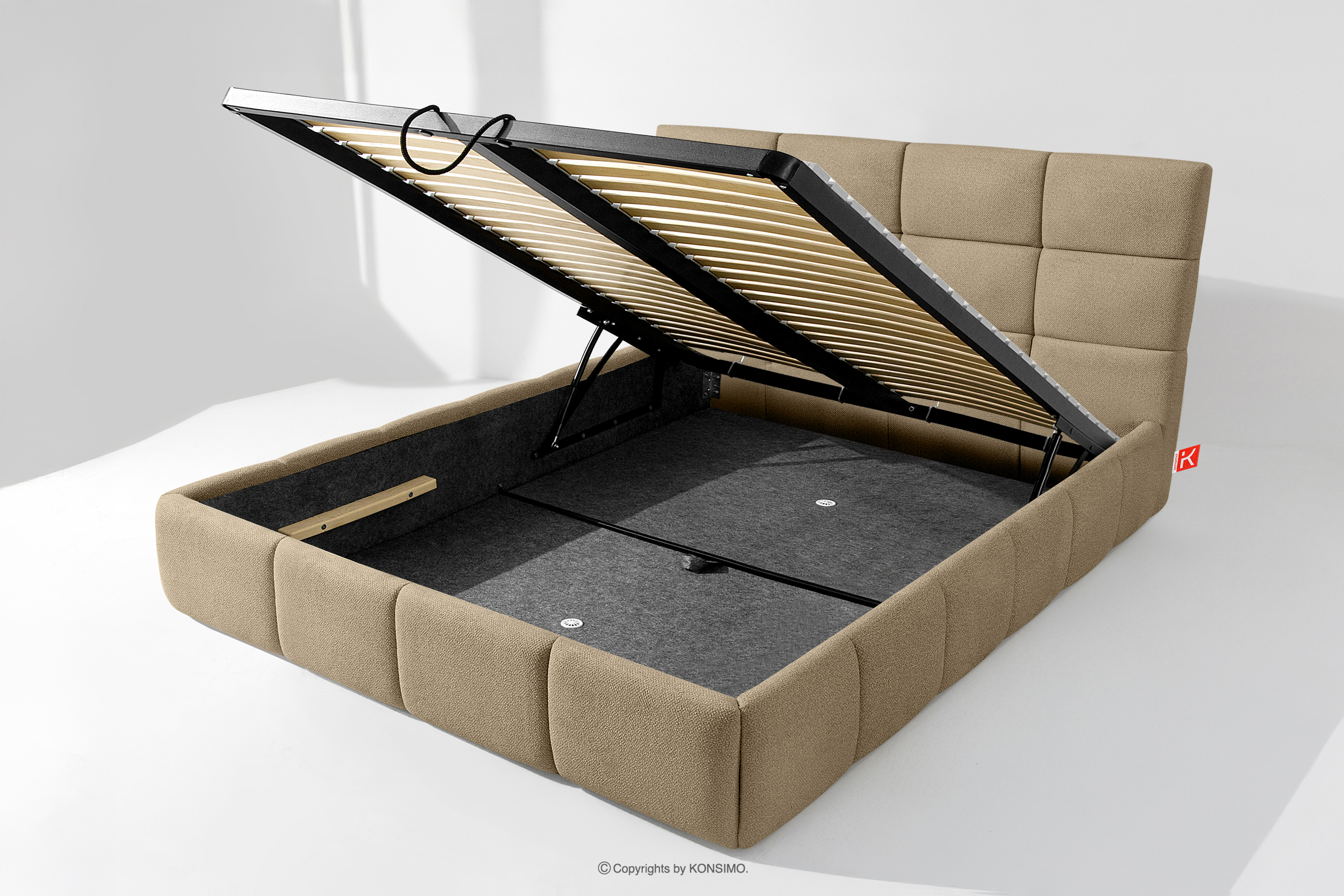 Tkanina, którą pokryte jest łóżko, to materiał najwyższej jakości – nie tylko pięknie się prezentuje, dodając wnętrzu elegancji, ale również jest wysoce funkcjonalna. Odporna na przetarcia i codzienne zużycie. Tkanina doskonale pasuje do nowoczesnych i skandynawskich wnętrz, gdzie prostota idzie w parze z funkcjonalnością. Podłoga w skrzyni łóżka jest wyjmowana, co ułatwia sprzątanie pod meblem. Dodatkowo ściany i płyta podłogowa skrzyni wykończone są filcem, który zapobiega ślizganiu się pościeli i innych przechowywanych rzeczy, zachowując przy tym porządek i estetykę.