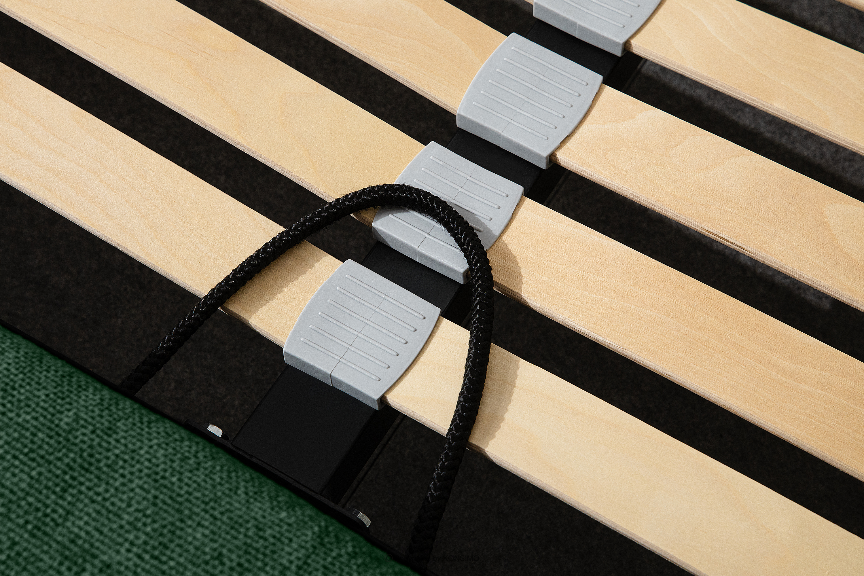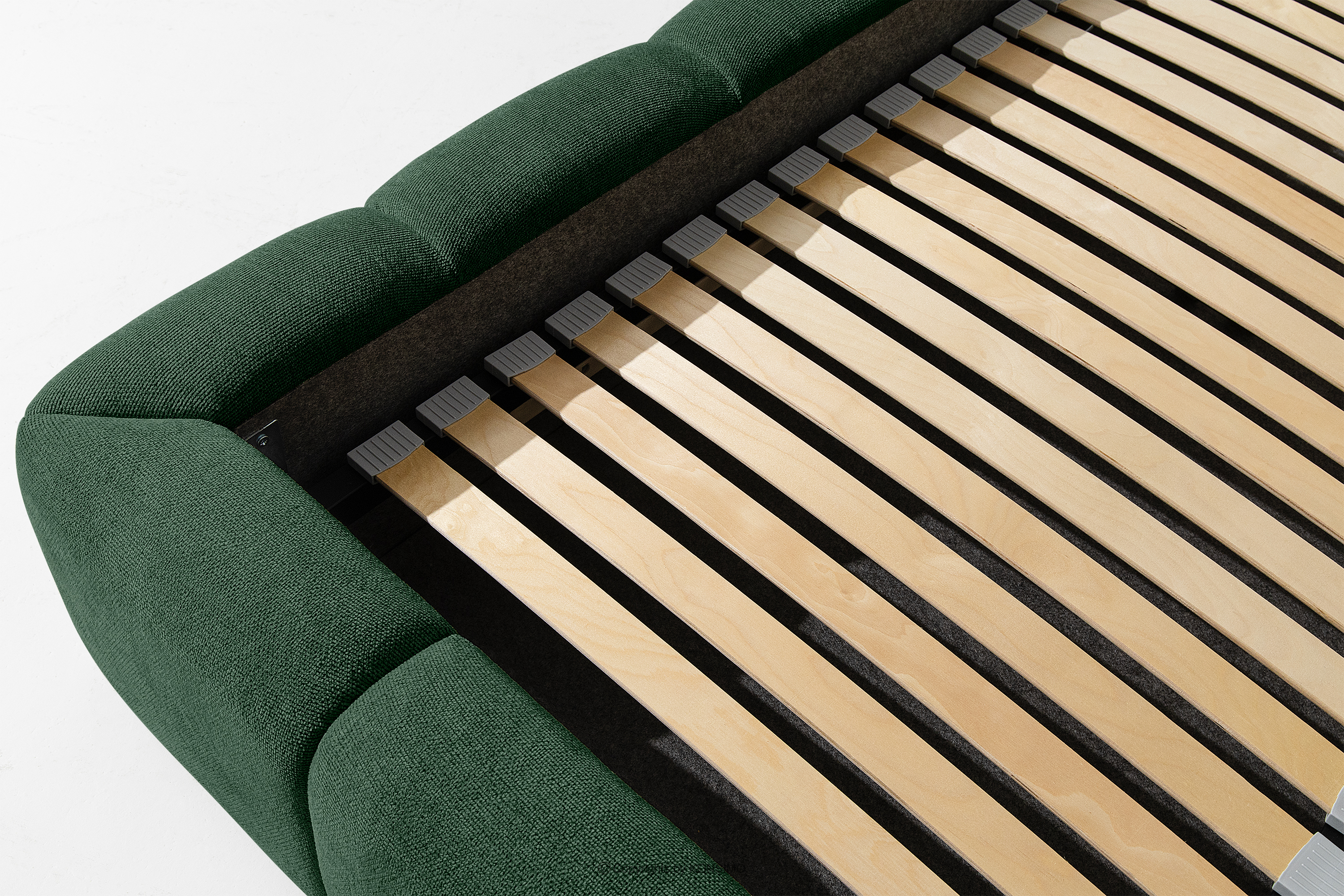 Łóżko 180 z zagłówkiem ciemny zielony to harmonijne połączenie prostoty skandynawskiego stylu z wyjątkową wygodą użytkowania. Jego unikalna forma, inspirowana kształtem chmurki, przyciąga uwagę swoim oryginalnym wyglądem, a jednocześnie zapewnia komfort na najwyższym poziomie. Konstrukcja opiera się na elastycznym stelażu z drewnianych listew, których dodatkowym atutem jest możliwość regulacji twardości łóżka – dzięki wyjmowanym listwom, można dostosować poziom miękkości do indywidualnych preferencji.