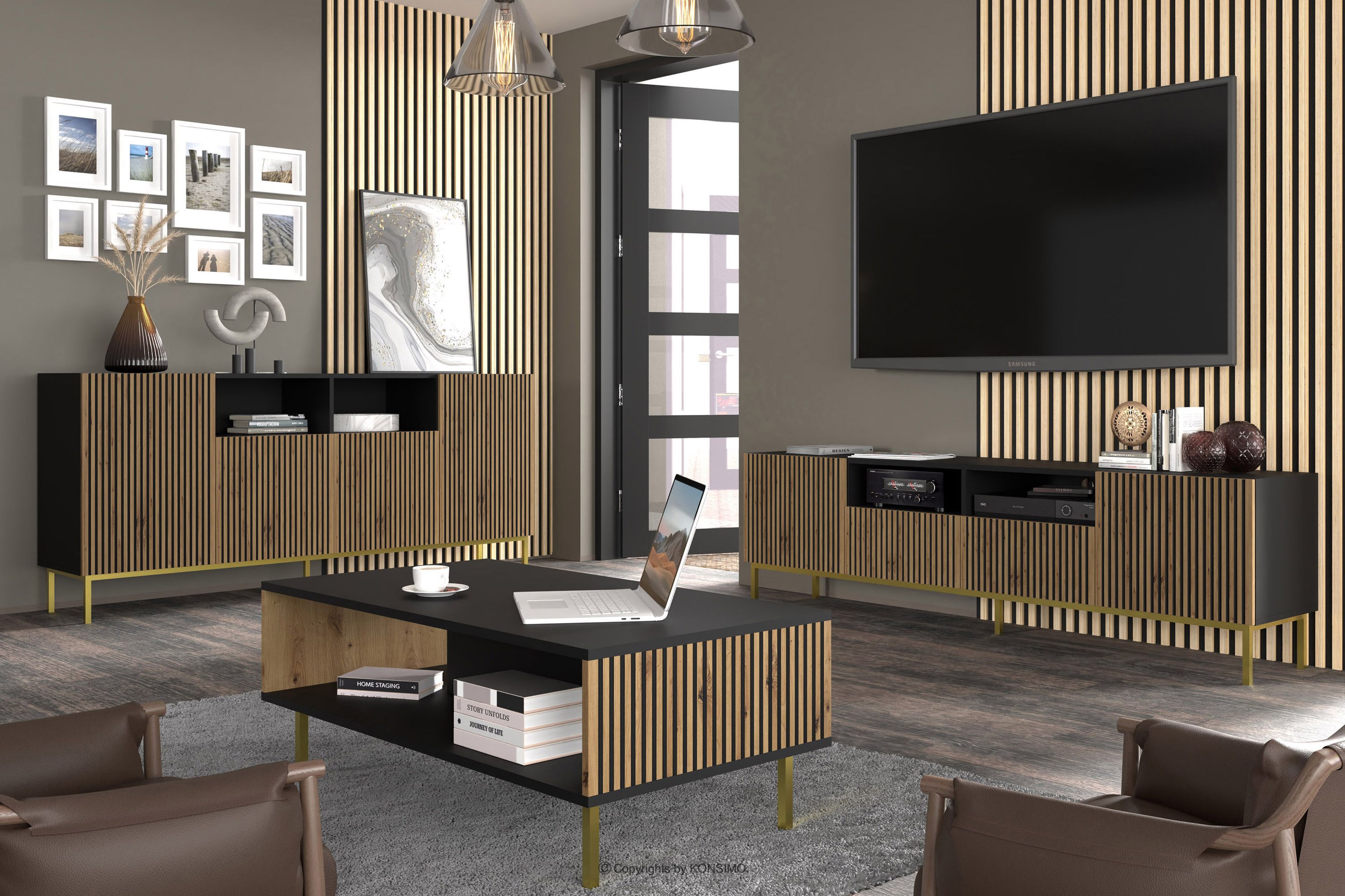 REMO zobacz całą kolekcję Stolik kawowy na złotych nóżkach z lamelami czarny/dąb artisan- kolor czarny/dąb artisan