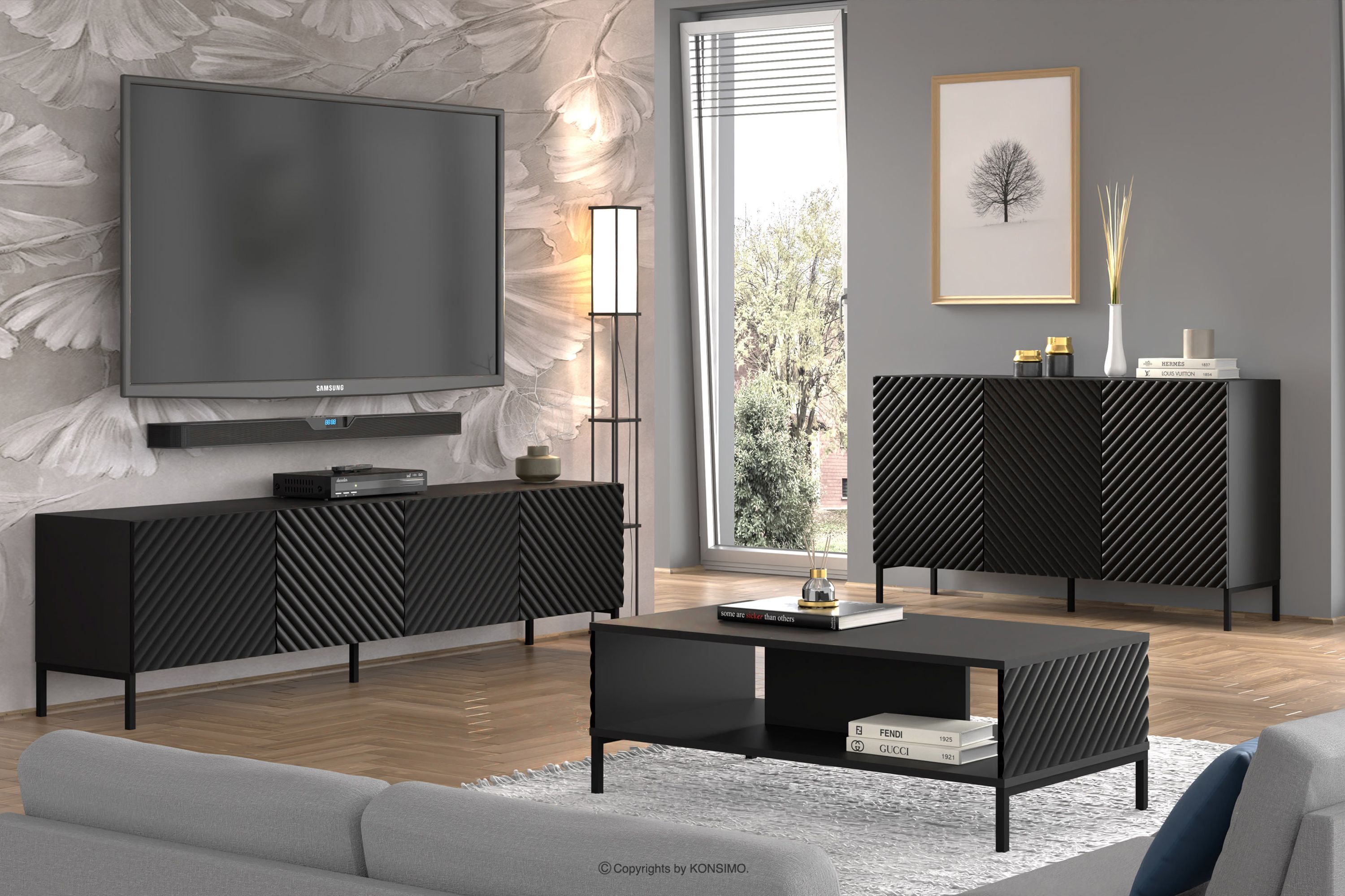 Duża nowoczesna czarna szafka pod telewizor na nóżkach to połączenie wyjątkowego designu, solidnego wykonania i funkcjonalności. Zostały stworzone z myślą o osobach ceniących estetykę i komfort w codziennym użytkowaniu. Proste, minimalistyczne formy wzbogacone subtelnymi detalami wpisują się w najnowsze trendy wnętrzarskie, pozwalając na harmonijne dopasowanie ich do różnorodnych aranżacji. Te meble to doskonały wybór dla każdego, kto pragnie stworzyć nowoczesne, a jednocześnie przytulne wnętrze, w którym komfort i styl idą w parze.