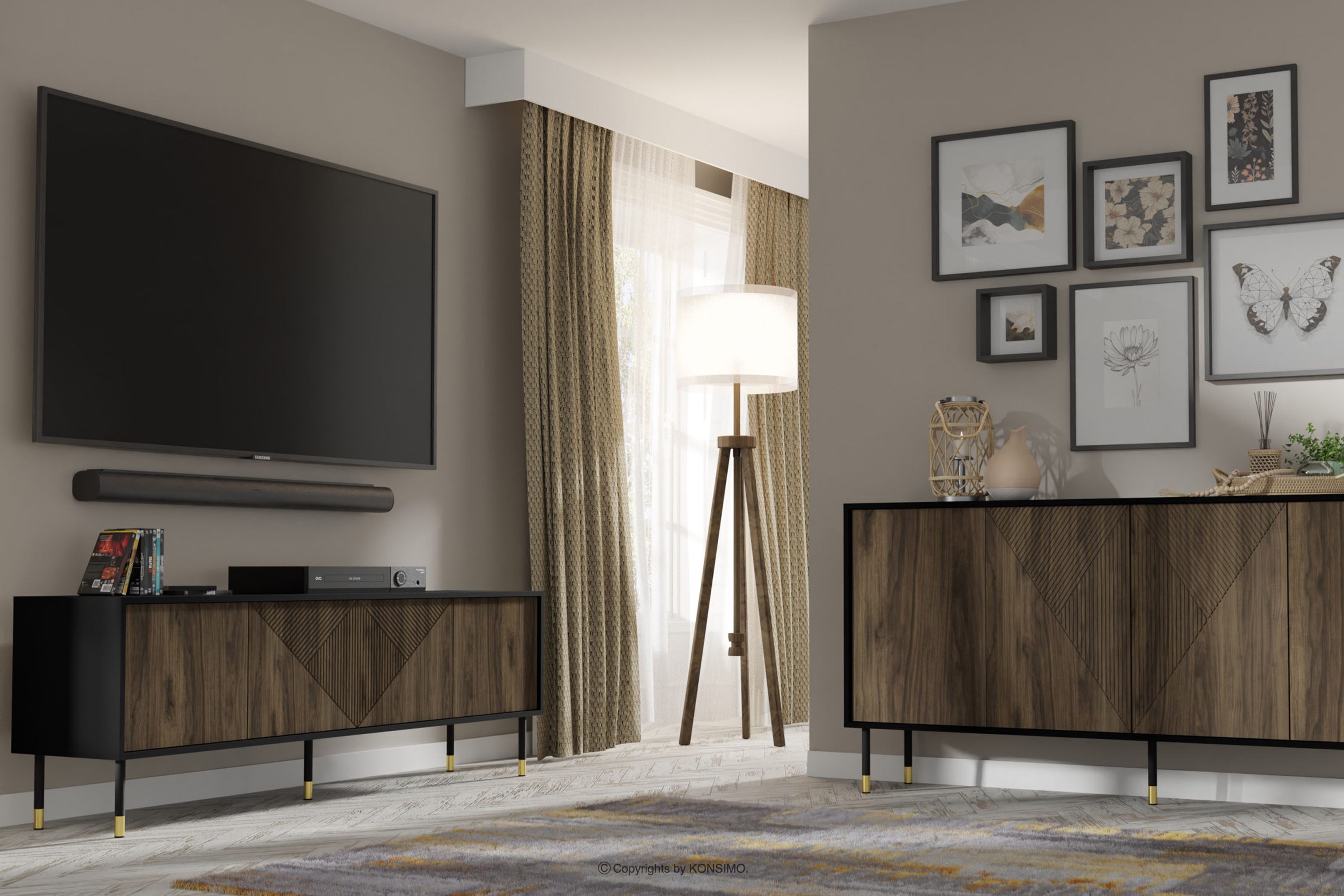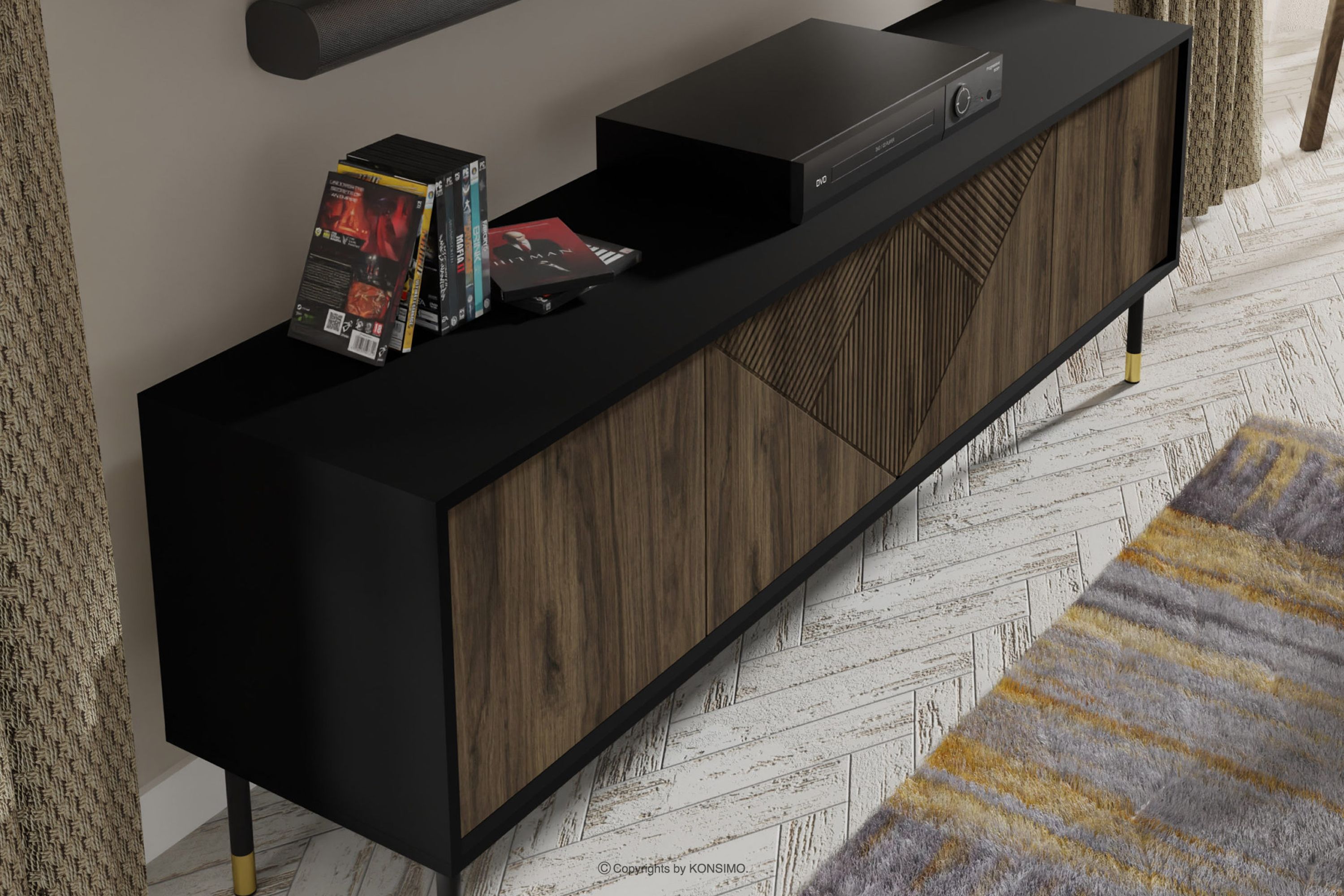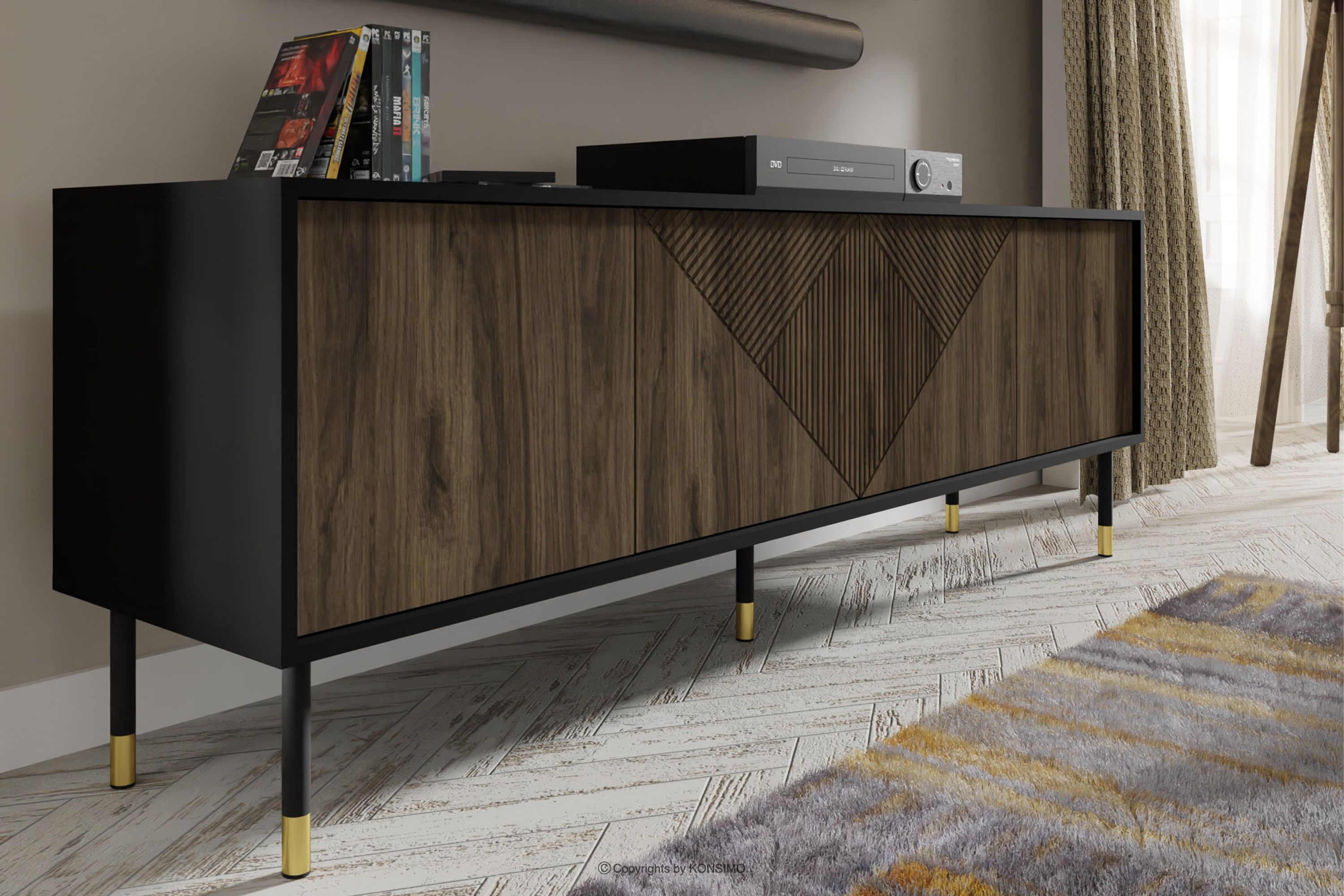 Szafka RTV pod telewizor czarny/orzech to połączenie wyjątkowego designu, solidnego wykonania i funkcjonalności. Zostały stworzone z myślą o osobach ceniących estetykę i komfort w codziennym użytkowaniu. Proste, minimalistyczne formy wzbogacone subtelnymi detalami wpisują się w najnowsze trendy wnętrzarskie, pozwalając na harmonijne dopasowanie ich do różnorodnych aranżacji. Te meble to doskonały wybór dla każdego, kto pragnie stworzyć nowoczesne, a jednocześnie przytulne wnętrze, w którym komfort i styl idą w parze.