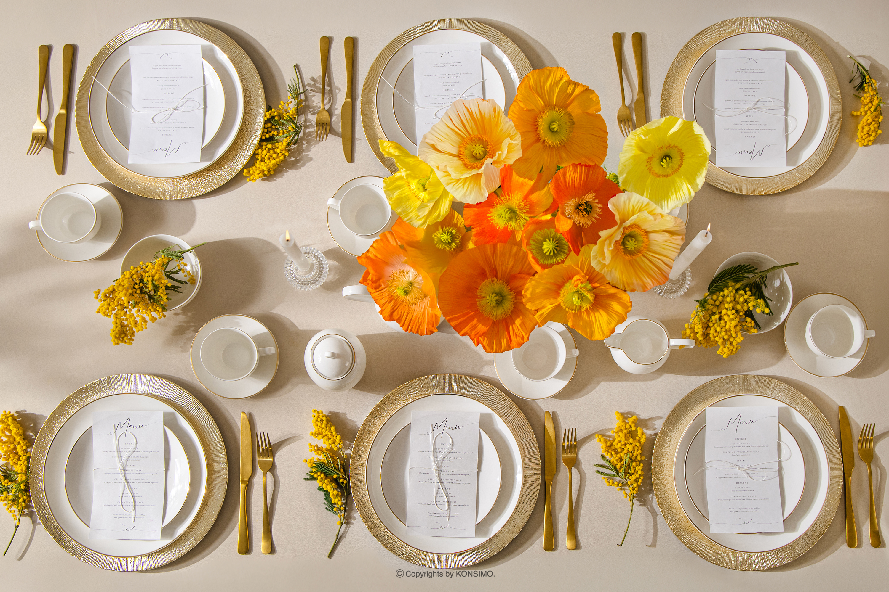 Zestaw herbaciany twarda porcelana ecru/złoty 6 os. (12 el.) - klasyka, elegancja i wyjątkowa trwałość. Nasza kolekcja to połączenie klasycznej elegancji, niezawodnej trwałości i najwyższej jakości wykonania. To idealny wybór dla osób, które cenią sobie piękno nakrycia stołu oraz funkcjonalność w codziennym użytkowaniu. Ciepła, lekko kremowa barwa zastawy stołowej doskonale komponuje się z różnymi aranżacjami stołu, pasując zarówno do klasycznych, jak i nowoczesnych wnętrz.