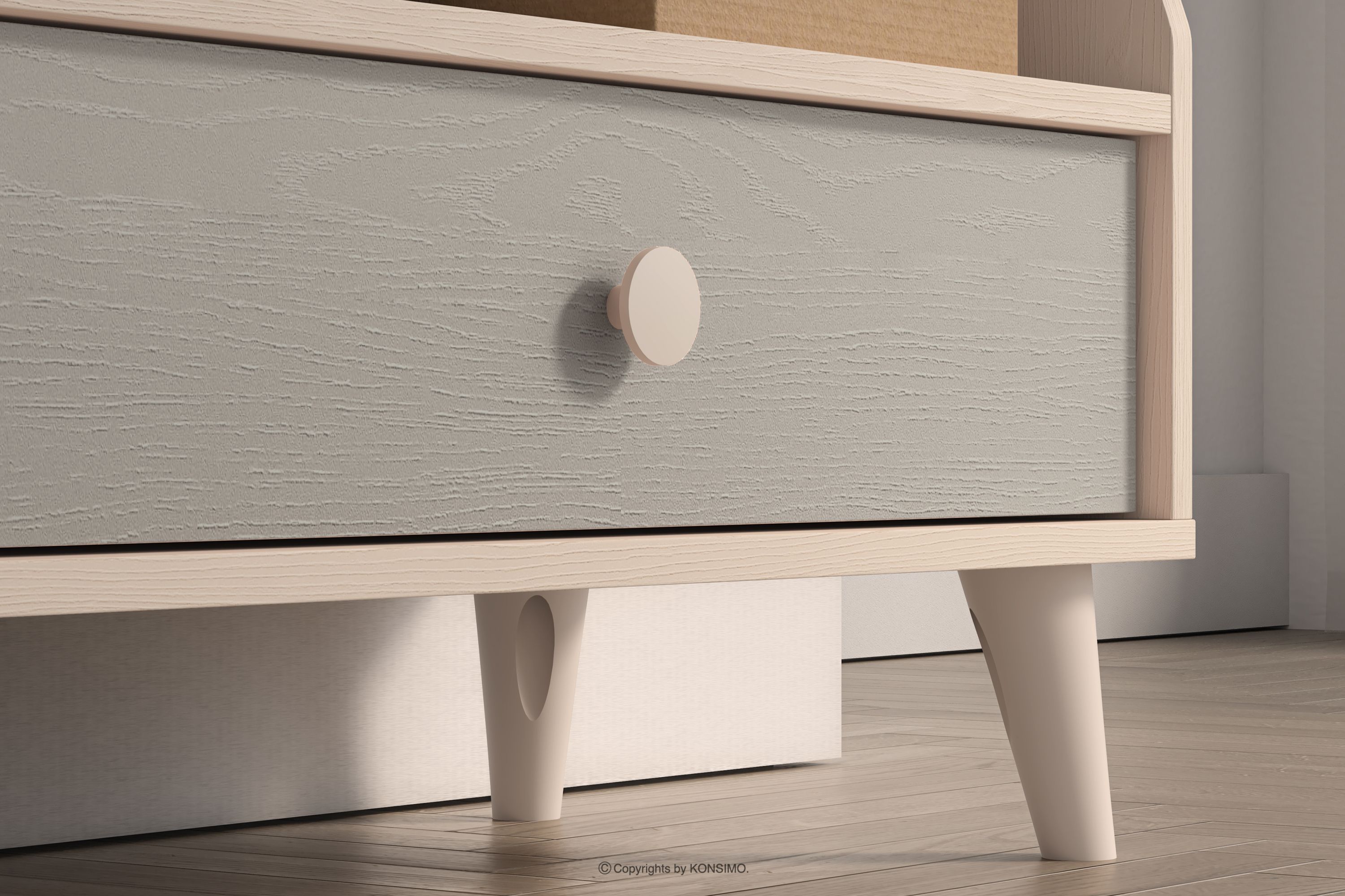 Korpus wykonany jest z wysokiej jakości płyty laminowanej, co zapewnia trwałość i odporność na uszkodzenia. Tylną ścianę stanowi płyta HDF, która dodatkowo wzmacnia całą konstrukcję. Dużą zaletą są także krawędzie, które zostały zabezpieczone obrzeżem ABS o grubości 8 mm, co zwiększa ich odporność na uszkodzenia oraz poprawia bezpieczeństwo użytkowania. Dzięki temu meble są nie tylko trwałe, ale także estetycznie wykończone. Szuflady osadzone są na prowadnicach kulkowych z pełnym wysuwem i systemem cichego domyku, co gwarantuje płynną i wygodną pracę. Dodatkowe wzmocnienie dna zwiększa ich ładowność, dzięki czemu pomieszczą jeszcze więcej dziecięcych skarbów.