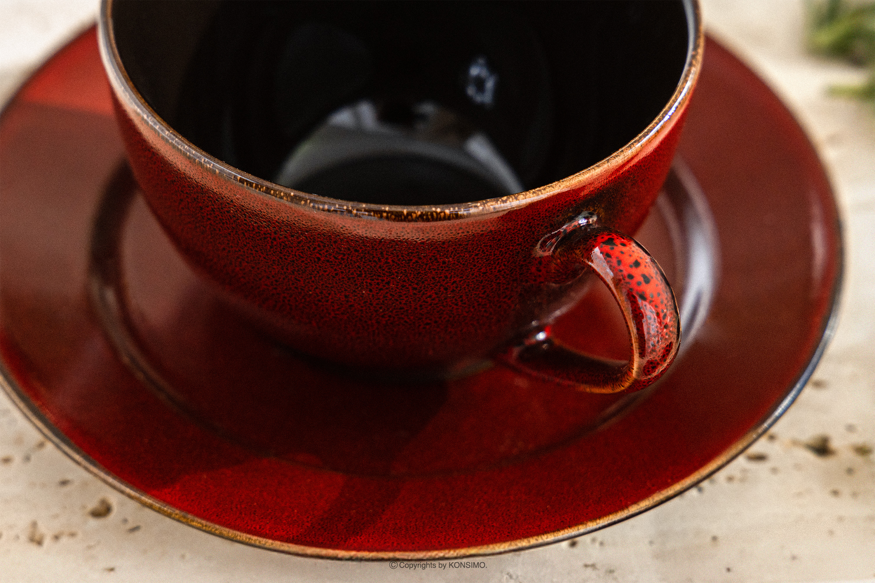 Zestaw kawowy ceramika / szkliwo reaktywne czerwony/czarny połysk 6 os. (18 el.) doskonale sprawdzą się na co dzień oraz podczas uroczystych kolacji i rodzinnych spotkań. Charakterystyczne przejścia kolorystyczne, delikatne refleksy świetlne i głębia odcieni nadają wyjątkowego charakteru. Szkło reaktywne to materiał, który pod wpływem wysokiej temperatury tworzy niepowtarzalne efekty kolorystyczne, każda sztuka ma unikalny wygląd – żadne naczynia nie są identyczne.
