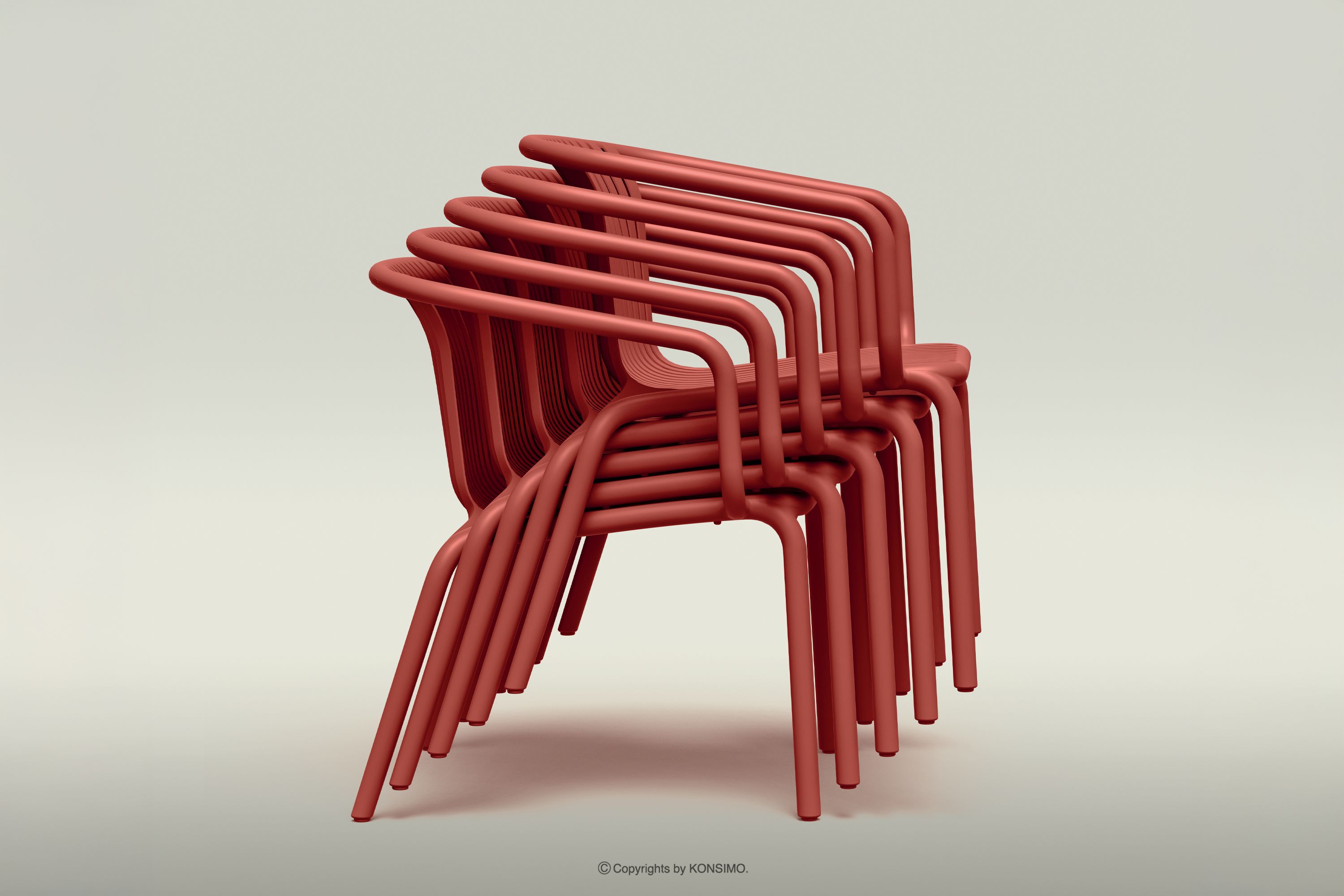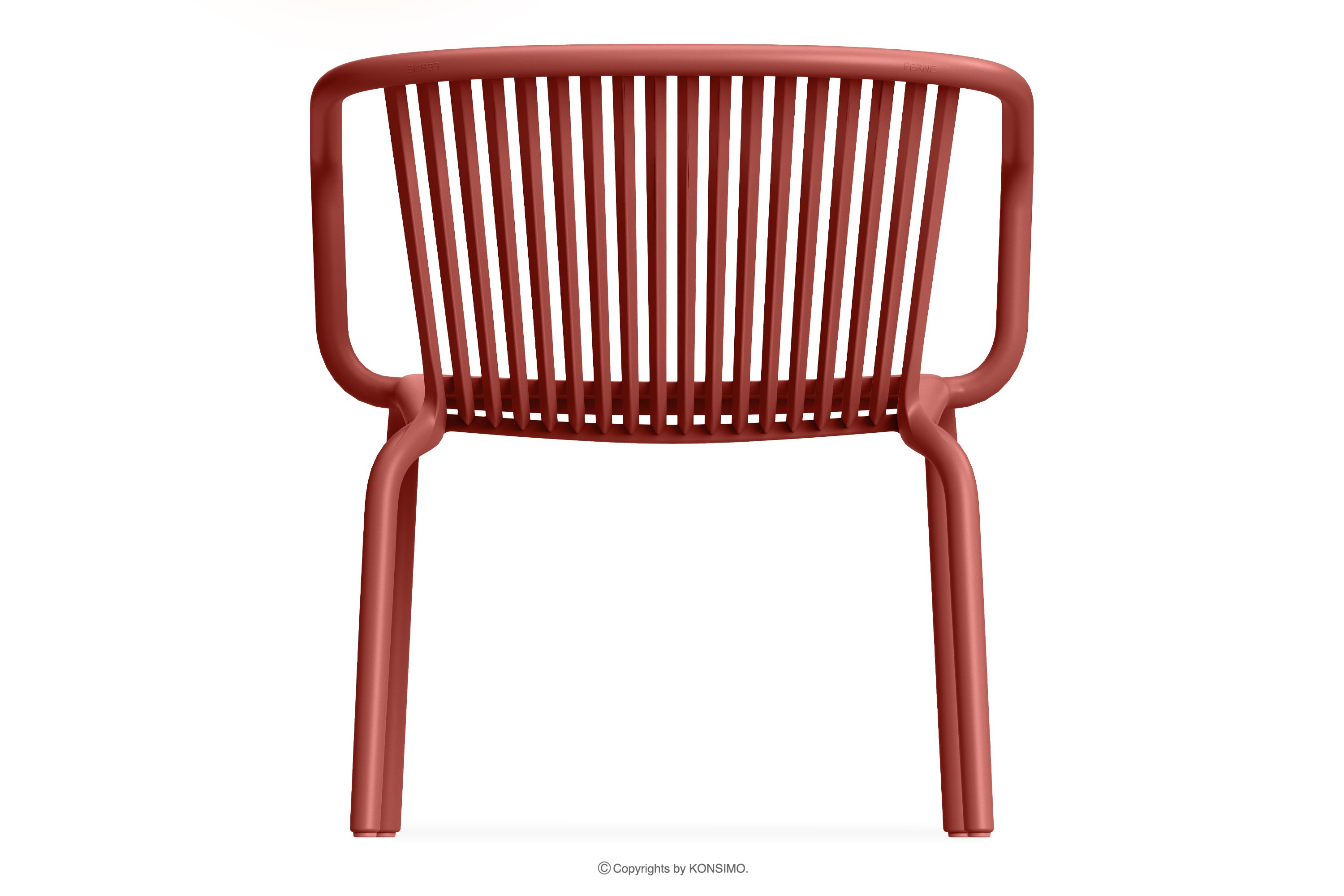 Zestaw mebli na ogród fotele i stolik kawowy czerwony 2 os. idealnie łączy minimalistyczną estetykę z wyjątkową funkcjonalnością. Wykonana z wysokogatunkowego tworzywa sztucznego - specjalnej mieszanki polipropylenu wzbogaconej włóknem szklanym - gwarantuje niezrównaną trwałość i odporność na zmienne warunki atmosferyczne. Innowacyjna konstrukcja każdego elementu zapobiega gromadzeniu się wody deszczowej, dzięki czemu meble błyskawicznie wysychają nawet po intensywnych opadach.