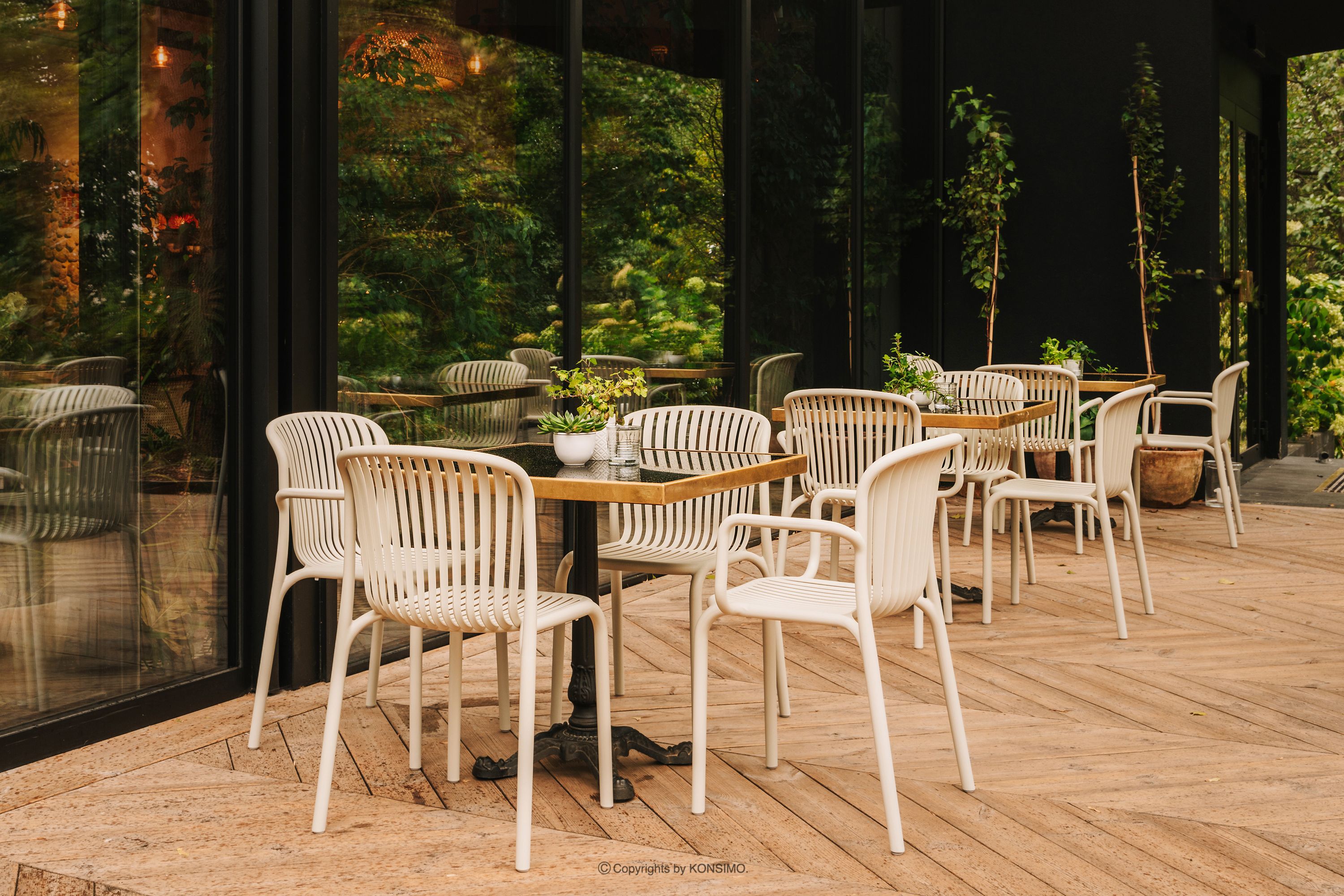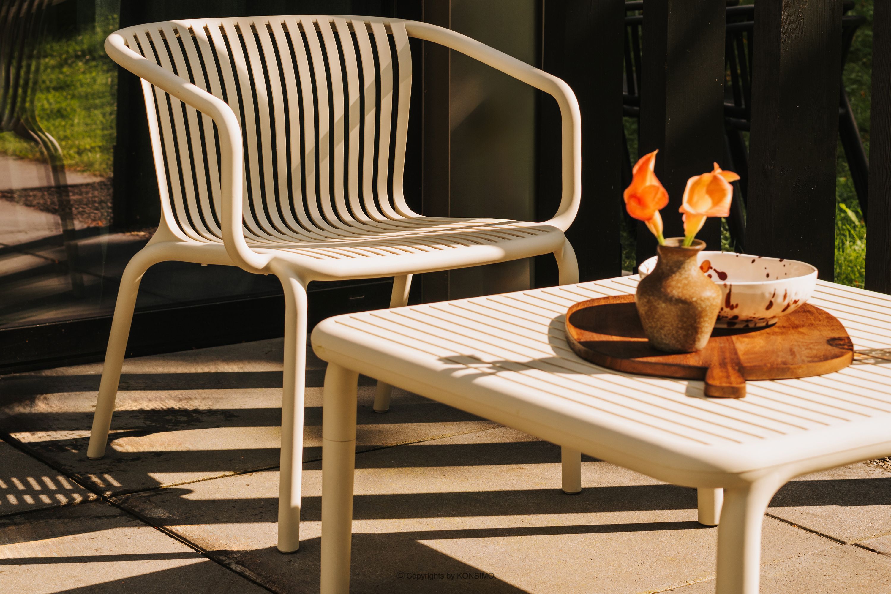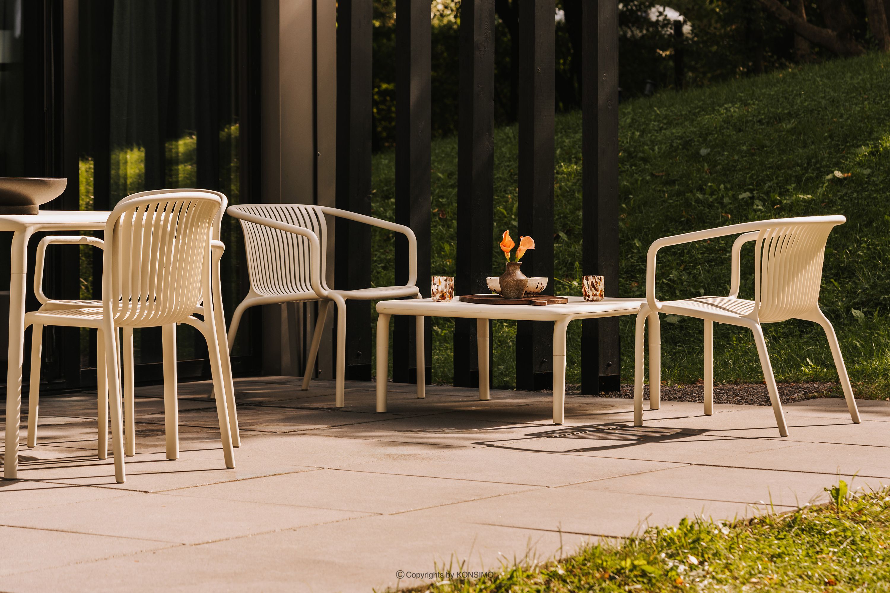 Fotele i stolik na ogród beżowy 4 os. idealnie łączy minimalistyczną estetykę z wyjątkową funkcjonalnością. Wykonana z wysokogatunkowego tworzywa sztucznego - specjalnej mieszanki polipropylenu wzbogaconej włóknem szklanym - gwarantuje niezrównaną trwałość i odporność na zmienne warunki atmosferyczne. Innowacyjna konstrukcja każdego elementu zapobiega gromadzeniu się wody deszczowej, dzięki czemu meble błyskawicznie wysychają nawet po intensywnych opadach.