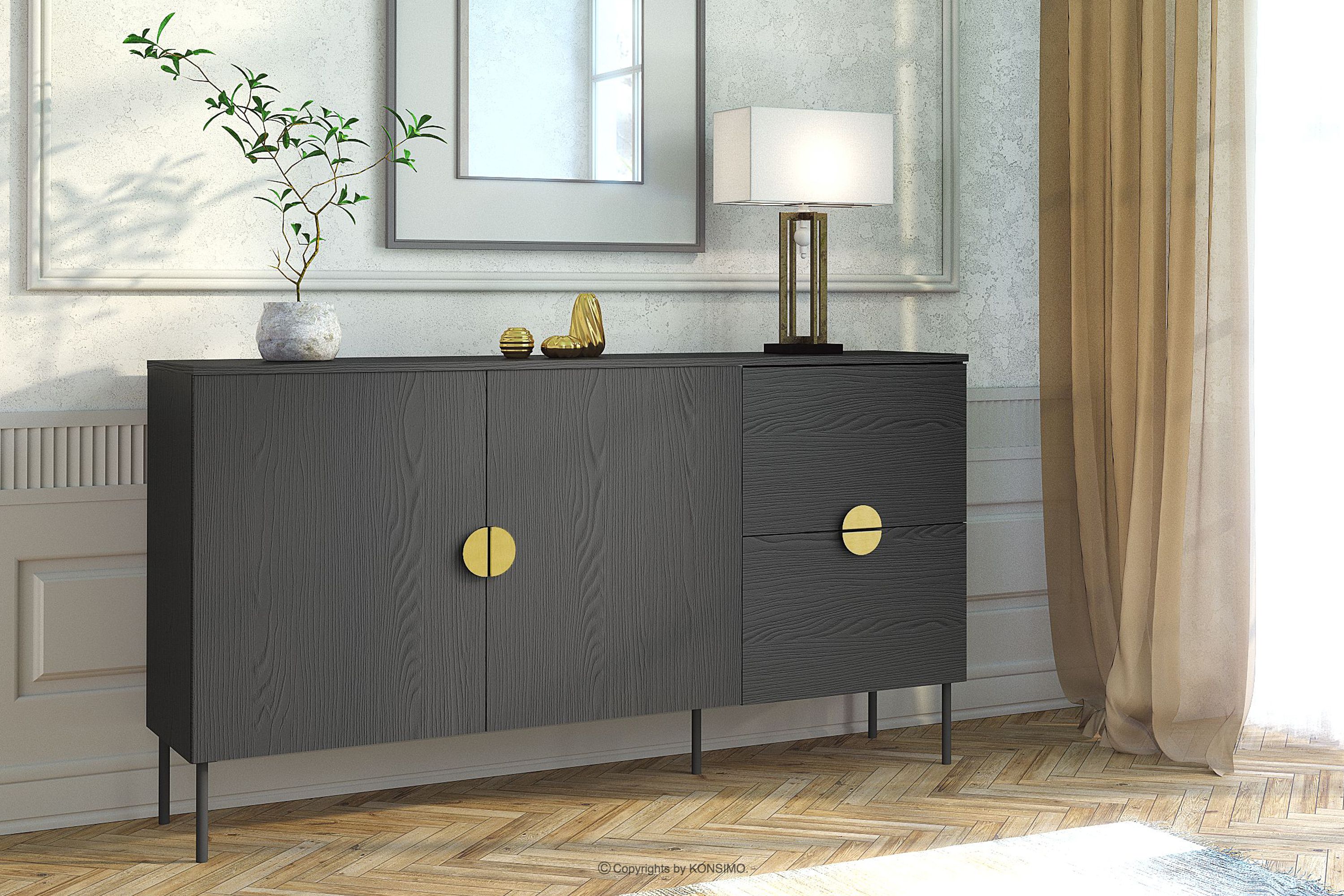 Duża nowoczesna komoda do salonu czarny łączy minimalistyczną formę z funkcjonalnością. Wykonana z płyty laminowanej o grubości 16 mm, prezentuje się lekko dzięki smukłym, czarnym, metalowym nóżkom. Komoda nie tylko przyciąga wzrok, ale również oferuje praktyczne rozwiązania do przechowywania, idealnie wpisując się w potrzeby współczesnych wnętrz. Charakterystyczne złote, metalowe uchwyty tworzą wyrazisty kontrast z czarnym korpusem, podkreślając geometryczną czystość bryły.