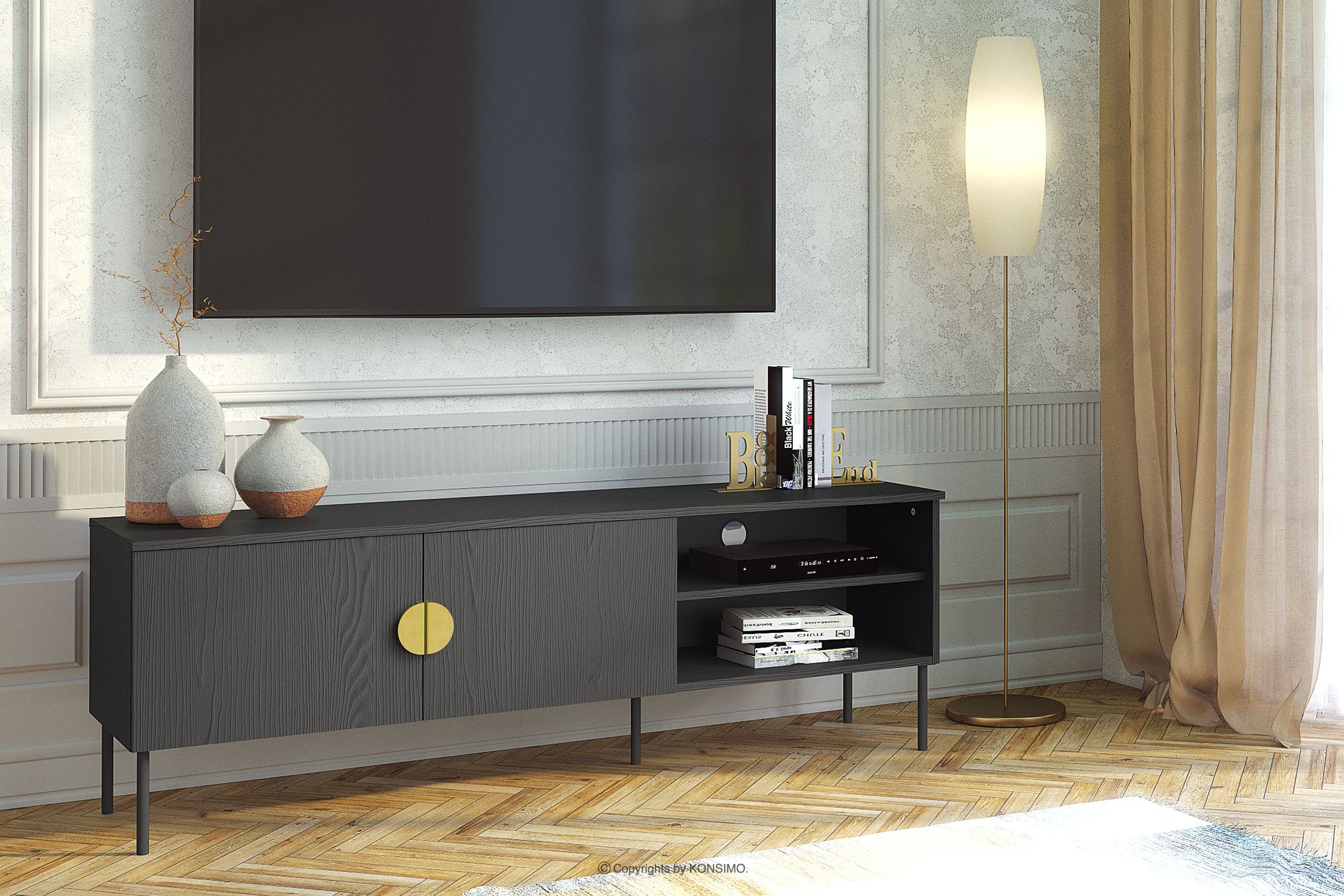 Nowoczesna szafka RTV z półkami czarny łączy minimalistyczną formę z funkcjonalnością. Wykonana z płyty laminowanej o grubości 16 mm, prezentuje się lekko dzięki smukłym, czarnym, metalowym nóżkom. Szafka RTV nie tylko przyciąga wzrok, ale również oferuje praktyczne rozwiązania do przechowywania, idealnie wpisując się w potrzeby współczesnych wnętrz. Charakterystyczne złote, metalowe uchwyty tworzą wyrazisty kontrast z czarnym korpusem, podkreślając geometryczną czystość bryły.