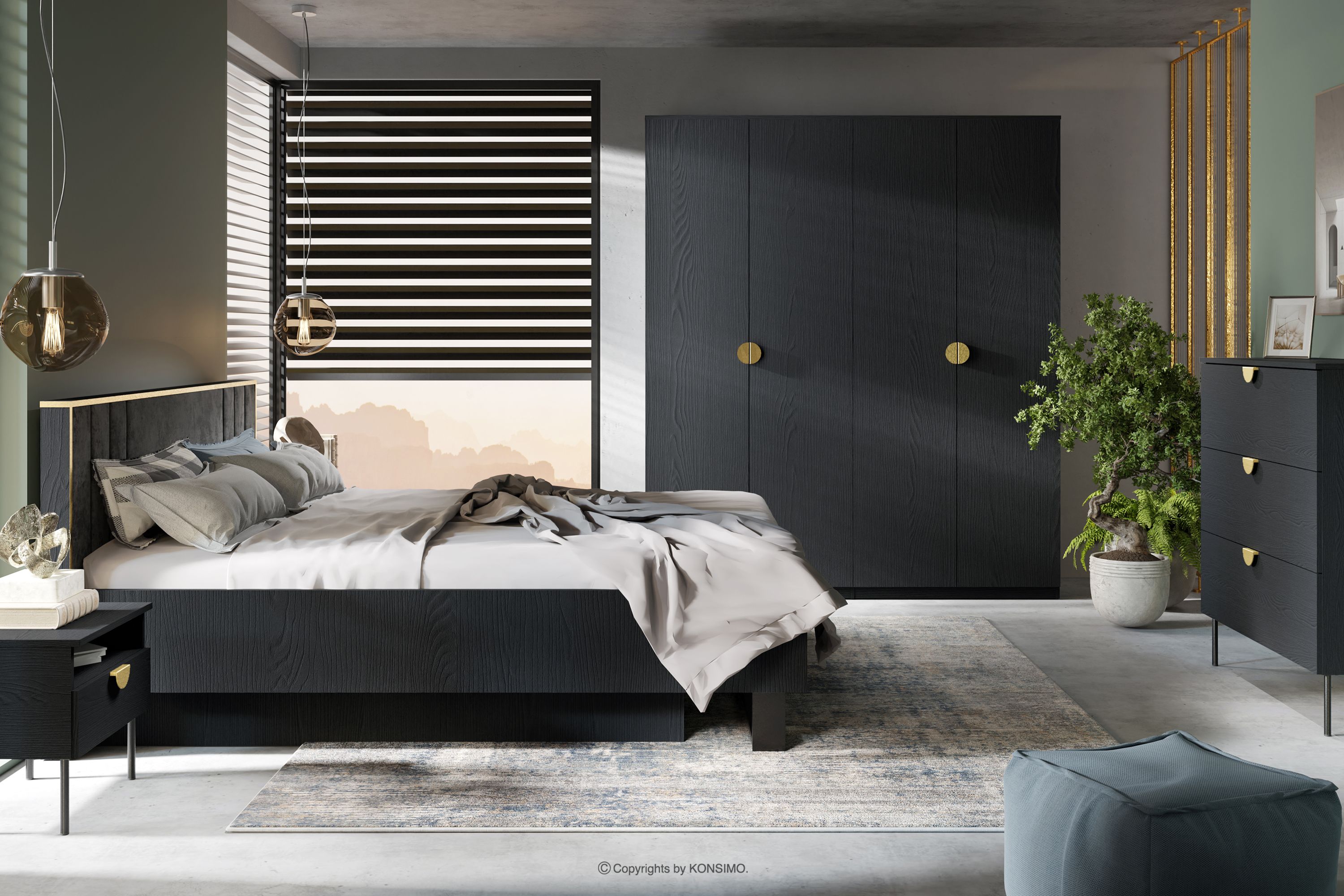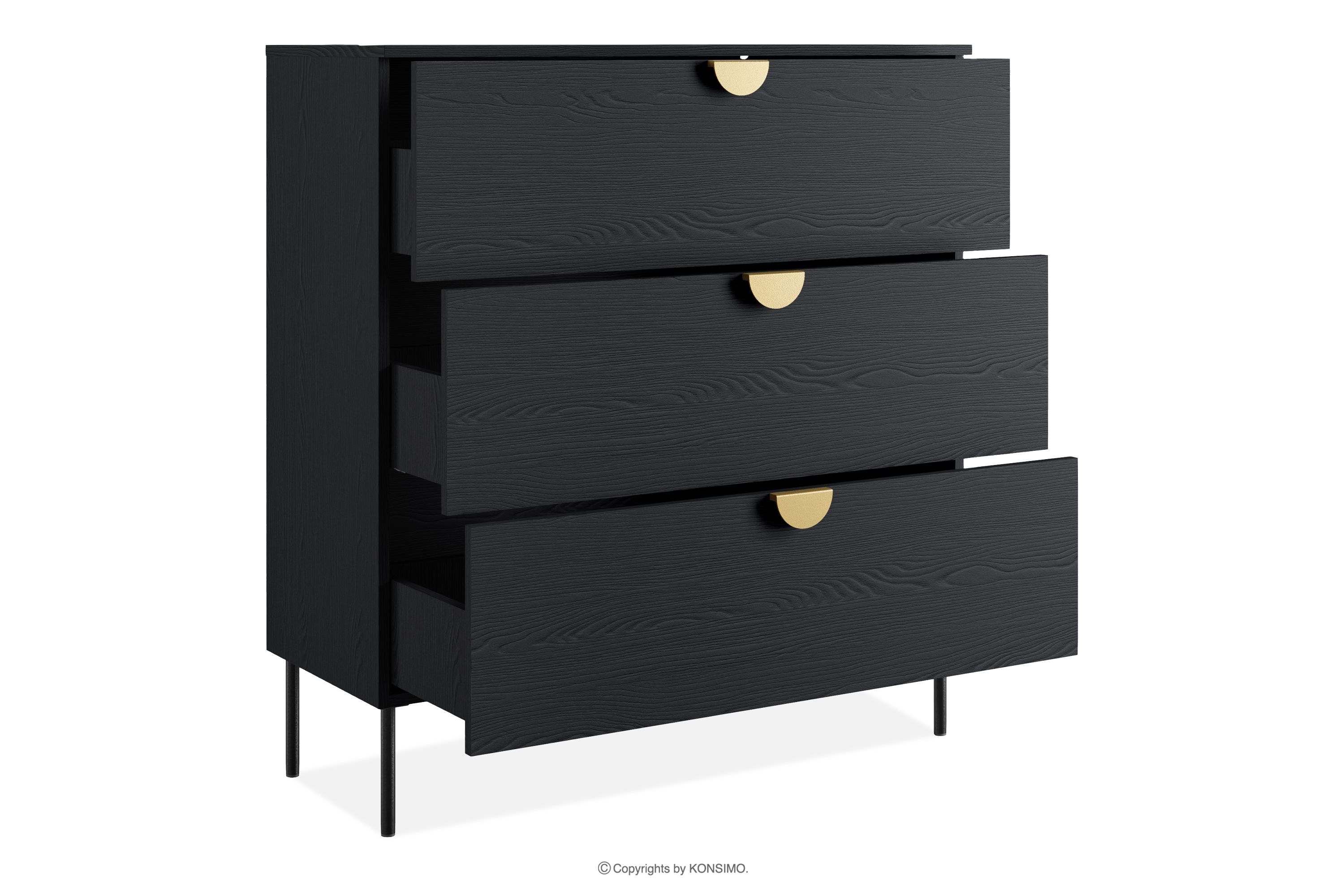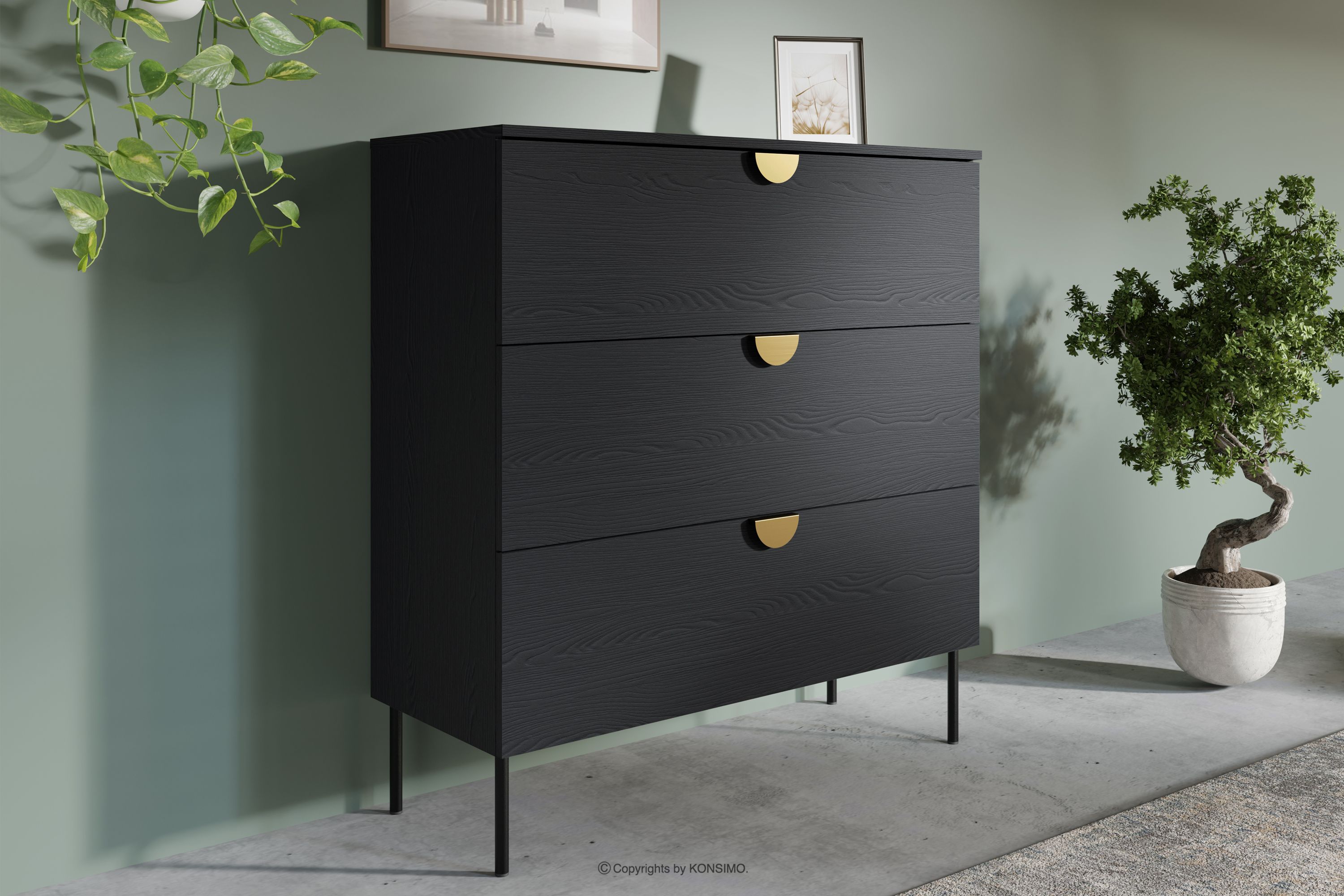 Czarna komoda z szufladami łączy minimalistyczną formę z funkcjonalnością. Wykonana z płyty laminowanej o grubości 16 mm, prezentuje się lekko dzięki smukłym, czarnym, metalowym nóżkom. Komoda nie tylko przyciąga wzrok, ale również oferuje praktyczne rozwiązania do przechowywania, idealnie wpisując się w potrzeby współczesnych wnętrz. Charakterystyczne złote, metalowe uchwyty tworzą wyrazisty kontrast z czarnym korpusem, podkreślając geometryczną czystość bryły.