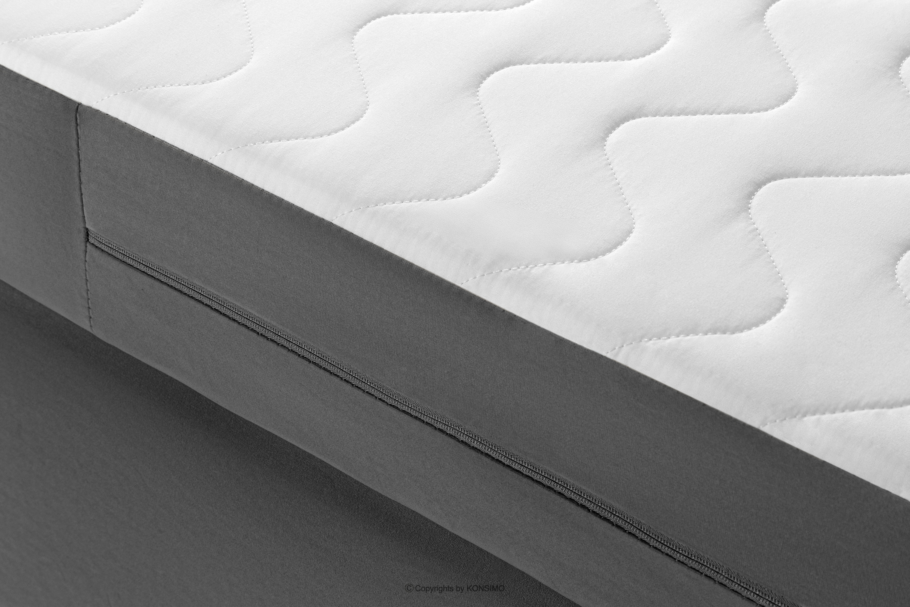 Komfort użytkowania tego łóżka gwarantuje wielowarstwowa konstrukcja z wymiennym materacem w pokrowcu dopasowanym kolorystycznie do tapicerki. Materac zawiera 196 sprężyn kieszeniowych na metr kwadratowy (o średnicy drutu 1,8 mm) oraz piankę T25 o grubości 3 cm z góry i dołu, a także na bokach 8 cm grubości które idealnie dopasowują się do kształtu ciała, zapewniając średnią twardość - optymalną dla większości użytkowników. Dodatkowo, skrzynia łóżka wyposażona jest w 120 sprężyn bonelowych na metr kwadratowy (o średnicy drutu 2,2 mm), które zapewniają dodatkowe wsparcie i przedłużają żywotność mebla. Dodatkowo na samej górze znajduje się toper o grubości 3 cm z pianki T25 pokryty tkaniną pikowaną na owacie stanowi idealne wykończenie, zapewniając dodatkowy komfort. Skrzynia obita jest od góry tkaniną antypoślizgową, która skutecznie zapobiega przesuwaniu się materaca podczas użytkowania.