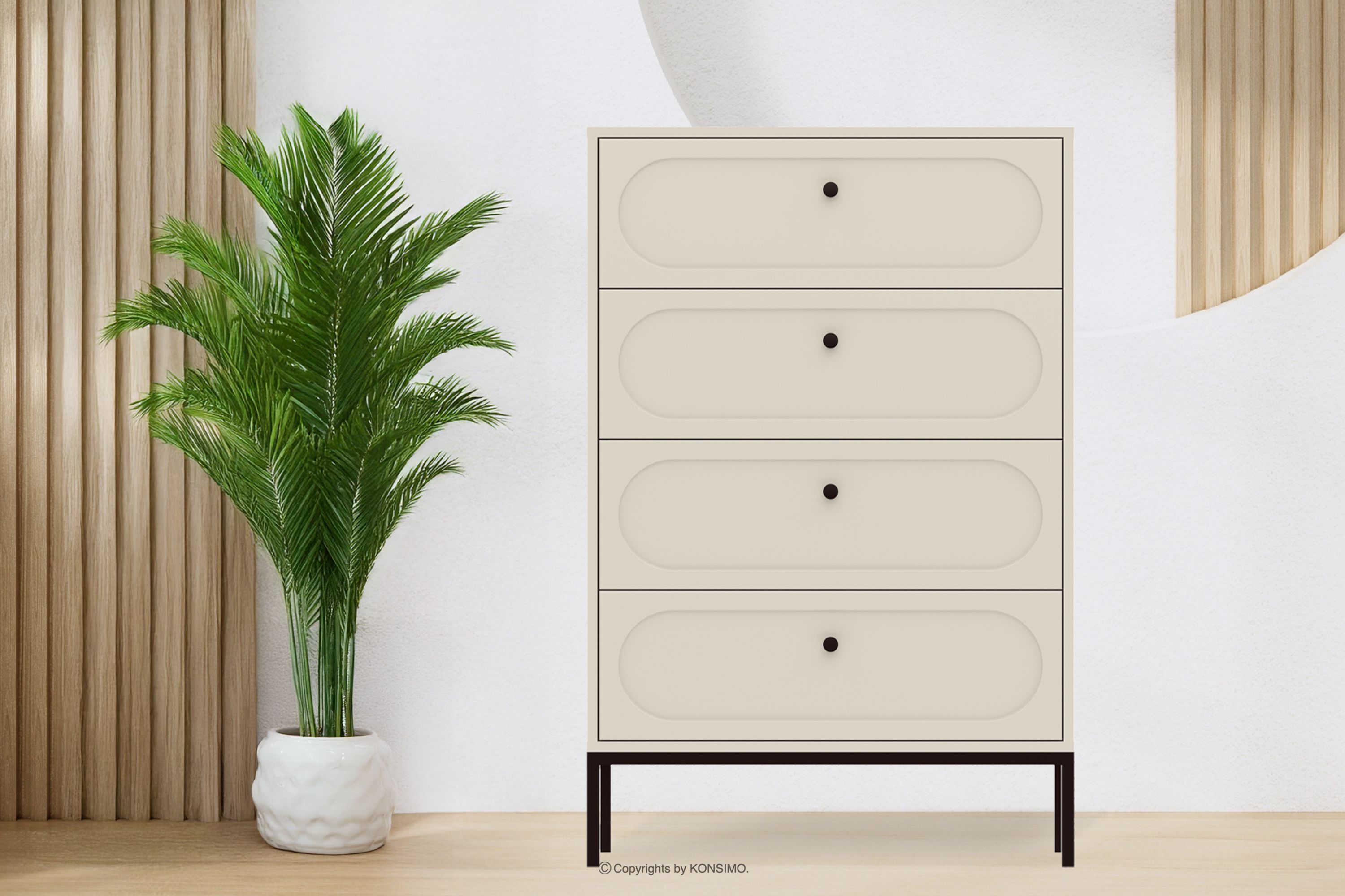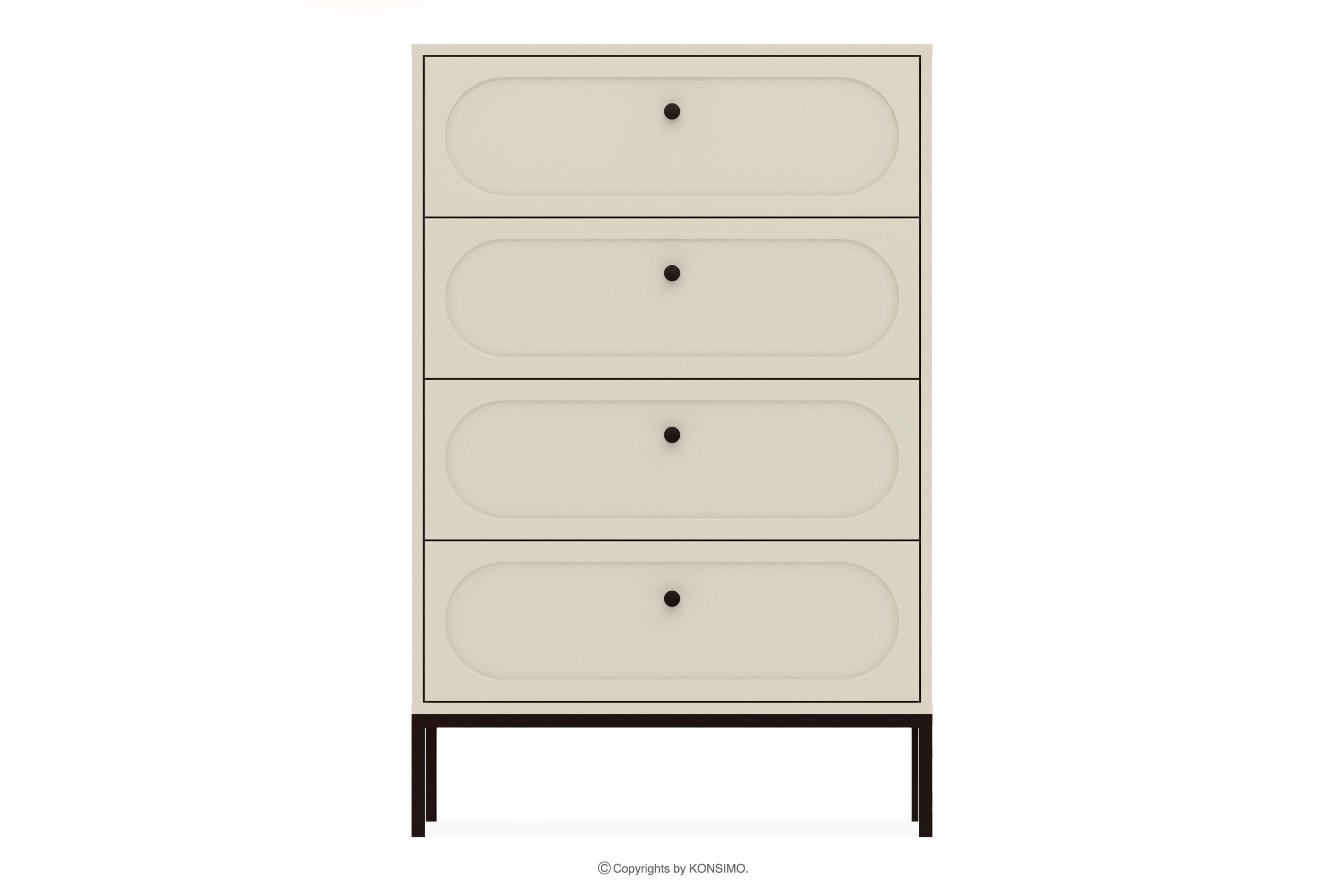 Wysoka kremowa komoda z szufladami to kwintesencja nowoczesnego designu, który harmonijnie łączy funkcjonalność z wyrafinowaną estetyką. Czarna kolorystyka wprowadza do wnętrza nutę nowoczesności i elegancji, jednocześnie zapewniając uniwersalność, która pozwala na swobodne komponowanie z różnorodnymi stylami aranżacyjnymi. Fronty wykonane z 18-milimetrowego MDF-u o idealnie gładkiej powierzchni tworzą minimalistyczną formę z drobnymi zdobieniami, która stanowi doskonałe tło dla starannie dobranych czarnych uchwytów.