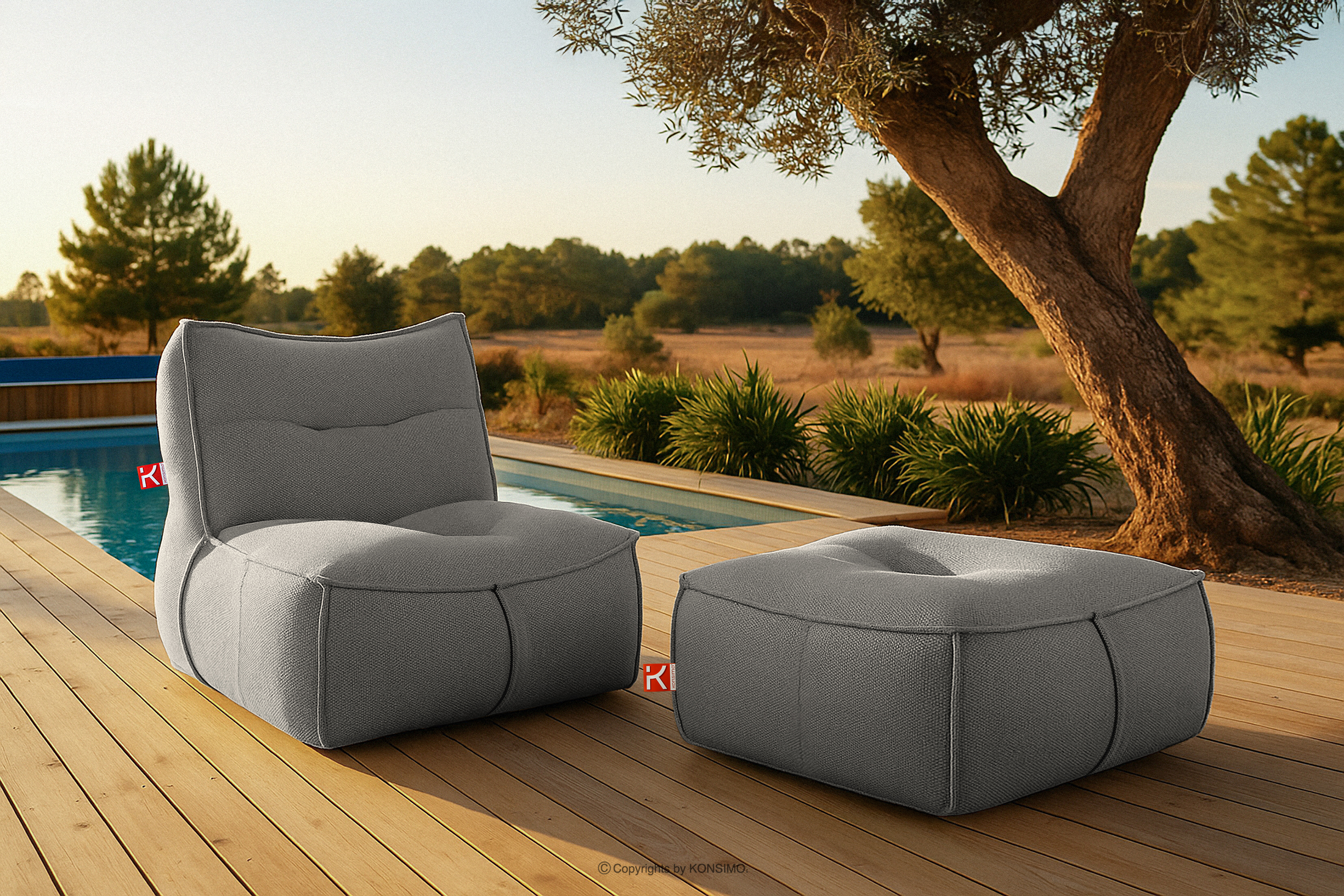 - Dodatkowe informacje: pokrowiec zewnętrzny z tkaniny wodoodpornej wszyty w stukturę mebla, chowany do środka i zamykany na zamek, spód mebla z tkaniny antypoślizgowej, uchwyt z pasa tapicerskiego ułatwiający przenoszenie, wszyta gumka w pokrowiec zapobiegająca zsuwaniu się z mebla