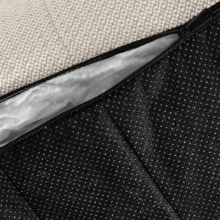 To, co wyróżnia mebel na tle innych, to przemyślana konstrukcja i innowacyjne podejście do funkcjonalności. Pokrowiec zewnętrzny, który jest wszyty w strukturę mebla, to genialne rozwiązanie. W razie potrzeby można go łatwo schować do środka i zamykać na zamek, co jest niezwykle praktyczne i estetyczne. Na krawędziach pokrowca wszyta jest gumka zapobiegająca zsuwaniu się z mebla, co gwarantuje, że wszystko pozostanie na swoim miejscu. Pokrowiec wykonany jest z tkaniny wodoodpornej, która skutecznie zabezpiecza mebel przed kaprysami pogody, a jednocześnie jest to oddychający mikrostrukturalny materiał, który gwarantuje brak powstawania wilgoci i pleśni. Dzięki temu meble pozostają świeże i higieniczne przez cały rok. Błyskawiczne rozkładanie i zamykanie pokrowca to kolejny atut, oszczędzający Twój czas i wysiłek. Myśląc o mobilności i wygodzie przenoszenia, do mebla wszyte są uchwyty (w tej samej tkaninie co obicie), które ułatwiają relokację mebli w zależności od Twoich potrzeb. Spód mebla został wykończony tkaniną antypoślizgową, co zapewnia stabilność i bezpieczeństwo użytkowania na każdej powierzchni. Wnętrze mebla jest otwierane na zamek, co daje możliwość dołożenia wypełnienia w razie potrzeby, a to właśnie wypełnienie sprawia, że mebel nie zmienia kształtu. Siedzisko nie ubija się, pozostaje elastyczne przez lata i wraca do swojej pierwotnej formy nawet po długotrwałym nacisku. Co więcej, mebel dopasowuje się do wagi i kształtu człowieka, co w połączeniu z jego elastycznością zapewnia niezrównany komfort użytkowania.