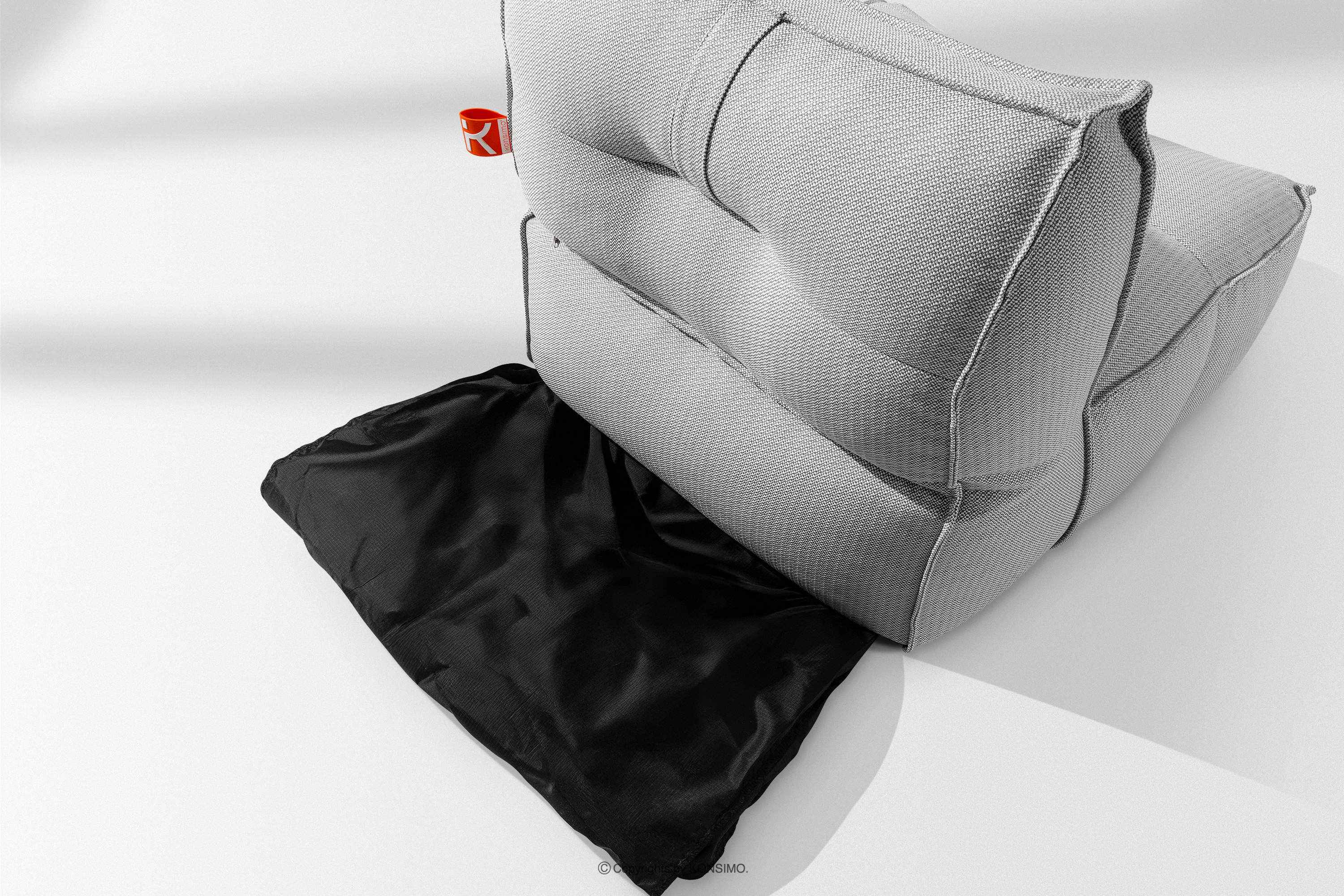 - Dodatkowe informacje: pokrowiec zewnętrzny z tkaniny wodoodpornej wszyty w stukturę mebla, chowany do środka i zamykany na zamek, spód mebla z tkaniny antypoślizgowej, uchwyt z pasa tapicerskiego ułatwiający przenoszenie, wszyta gumka w pokrowiec zapobiegająca zsuwaniu się z mebla