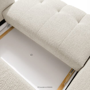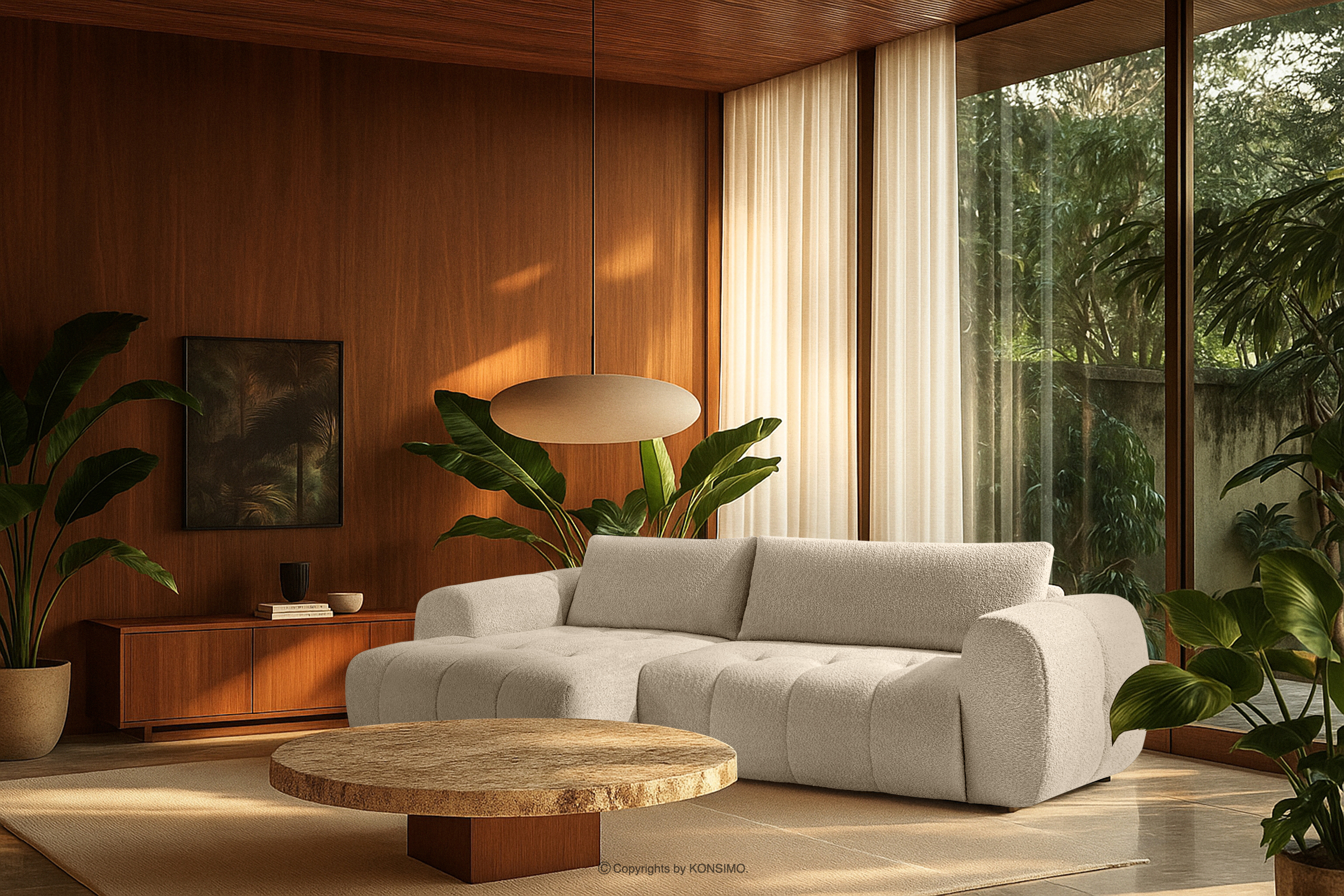 Narożnik w tkaninie boucle biały lewy doda wnętrzu elementu luksusu i przytulności. Unikalna struktura tkaniny tworzy subtelne wzory, które pięknie współgrają z naturalnym światłem, nadając meblowi głębi i charakteru. Tapicerowany luksusową tkaniną boucle, narożnik ten zachwyca swoją miękkością i przyjemnym w dotyku wykończeniem. Innowacyjny system sprężynowy DL zapewnia wyjątkową trwałość i elastyczność siedziska.