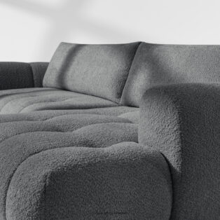 Narożnik prawy i puf boucle ciemny szary doda wnętrzu elementu luksusu i przytulności. Unikalna struktura tkaniny tworzy subtelne wzory, które pięknie współgrają z naturalnym światłem, nadając meblowi głębi i charakteru. Tapicerowana luksusową tkaniną boucle, sofa ta zachwyca swoją miękkością i przyjemnym w dotyku wykończeniem. Innowacyjny system sprężynowy DL zapewnia wyjątkową trwałość i elastyczność siedziska.