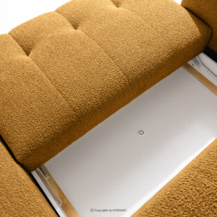Narożnik prawy i puf boucle miodowy doda wnętrzu elementu luksusu i przytulności. Unikalna struktura tkaniny tworzy subtelne wzory, które pięknie współgrają z naturalnym światłem, nadając meblowi głębi i charakteru. Tapicerowana luksusową tkaniną boucle, sofa ta zachwyca swoją miękkością i przyjemnym w dotyku wykończeniem. Innowacyjny system sprężynowy DL zapewnia wyjątkową trwałość i elastyczność siedziska.
