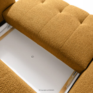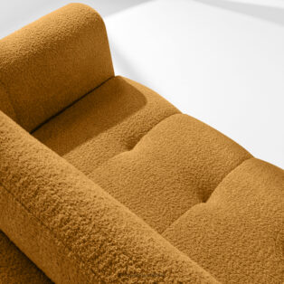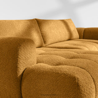 Narożnik lewy i puf boucle miodowy doda wnętrzu elementu luksusu i przytulności. Unikalna struktura tkaniny tworzy subtelne wzory, które pięknie współgrają z naturalnym światłem, nadając meblowi głębi i charakteru. Tapicerowana luksusową tkaniną boucle, sofa ta zachwyca swoją miękkością i przyjemnym w dotyku wykończeniem. Innowacyjny system sprężynowy DL zapewnia wyjątkową trwałość i elastyczność siedziska.