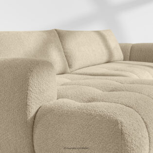 Narożnik lewy i puf w tkaninie boucle jasny beżowy doda wnętrzu elementu luksusu i przytulności. Unikalna struktura tkaniny tworzy subtelne wzory, które pięknie współgrają z naturalnym światłem, nadając meblowi głębi i charakteru. Tapicerowana luksusową tkaniną boucle, sofa ta zachwyca swoją miękkością i przyjemnym w dotyku wykończeniem. Innowacyjny system sprężynowy DL zapewnia wyjątkową trwałość i elastyczność siedziska.