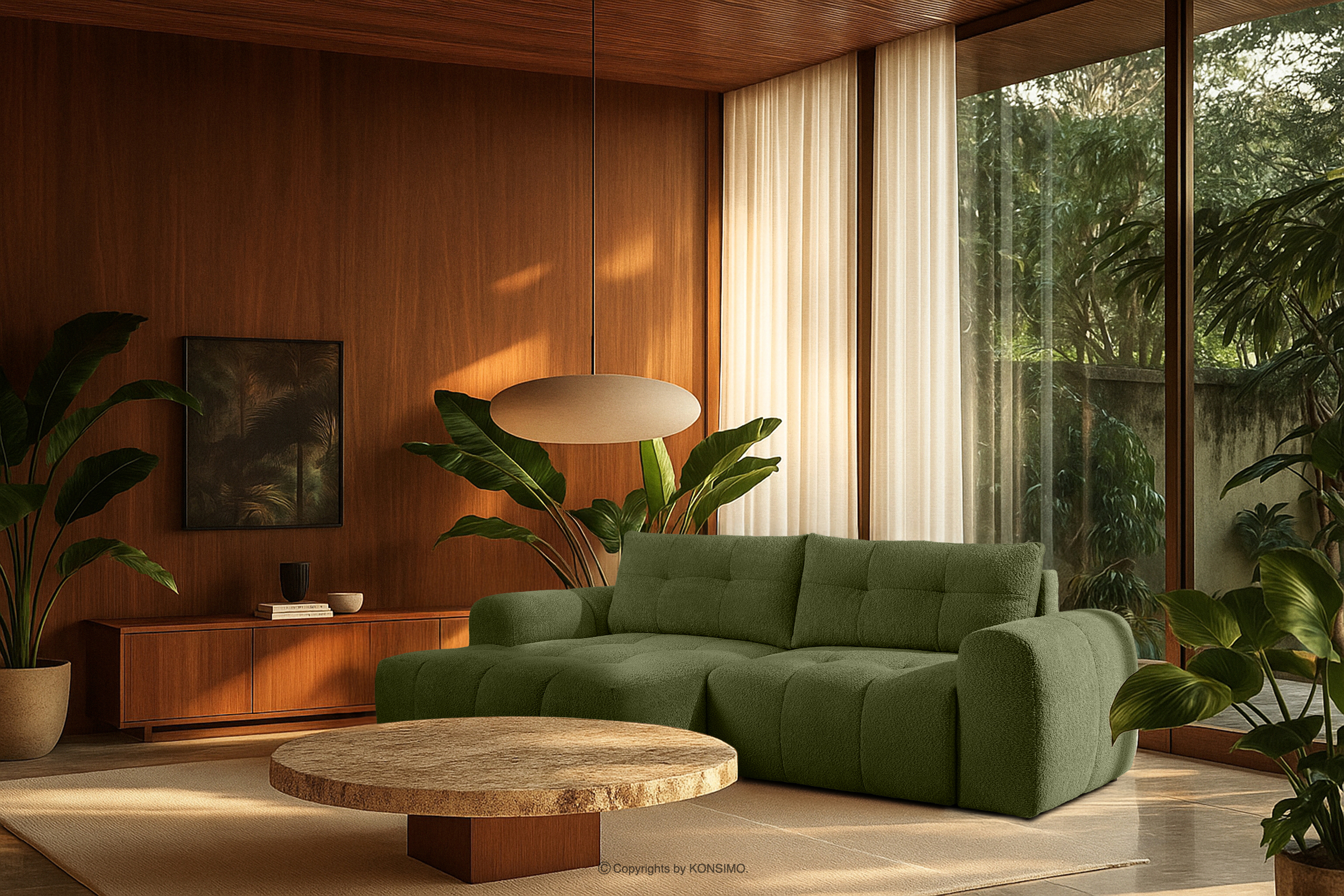 Narożnik z pikowaniem w stylu japandi boucle lewy oliwkowy łączy w sobie surową elegancję japońskiego designu z przytulnym minimalizmem skandynawskich wnętrz. Tapicerowana wyjątkową tkaniną boucle, która nie tylko zachwyca swoją fakturą i miękkością, ale również dodaje meblom luksusowego charakteru, kolekcja LIRA wnosi do każdego pomieszczenia poczucie spokoju i harmonii. Subtelne, nierównomierne sploty boucle tworzą na powierzchni mebli delikatne wzory, które pięknie odbijają światło, podkreślając głębię koloru i dodając meblom unikalnego, rzemieślniczego wyglądu.