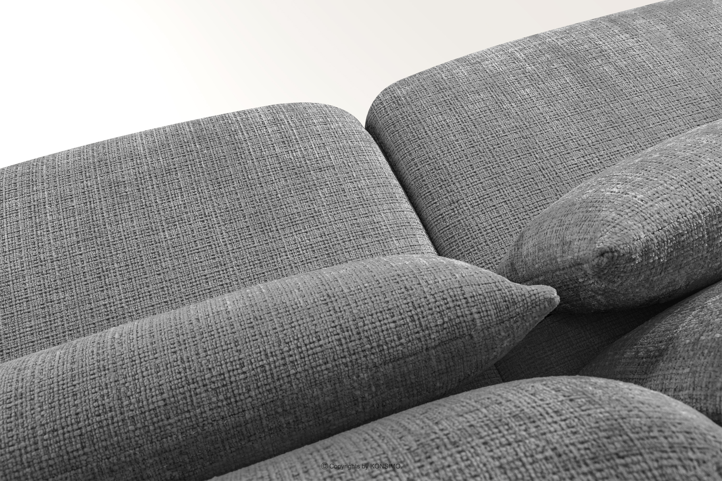 Meble zostały zaprojektowane z myślą o maksymalnej funkcjonalności i estetyce, którą docenią nawet najbardziej wymagające osoby. Jej podłokietniki, obite grubą, formowaną pianką, są niezwykle miękkie i zapraszają do odprężenia. Poduszki oparciowe wypełnione są mieszanką 70% kulki silikonowej i 30% granulatu piankowego, co zapewnia im doskonałe zachowanie kształtu, jednocześnie idealnie dopasowując się do ciała. Dwie poduszki lędźwiowe, w 100% wypełnione kulką silikonową, stanowią klucz do personalizacji komfortu. Ich wysoka i gruba forma efektywnie wypycha lędźwie, podtrzymując plecy aż do wysokości łopatek. Dzięki podwójnemu zastosowaniu tych poduszek, możesz modyfikować głębokość siedziska, z łatwością zmieniając pozycję z siedzącej na półleżącą, idealną do czytania, czy oglądania filmów. Co ważne, perfekcyjnie dopracowana forma mebla, czyli tapicerowany tył oraz solidne szycie pozwala na swobodne ustawienie mebli zarówno pod ścianą, jak i jako wolnostojący element aranżacji.