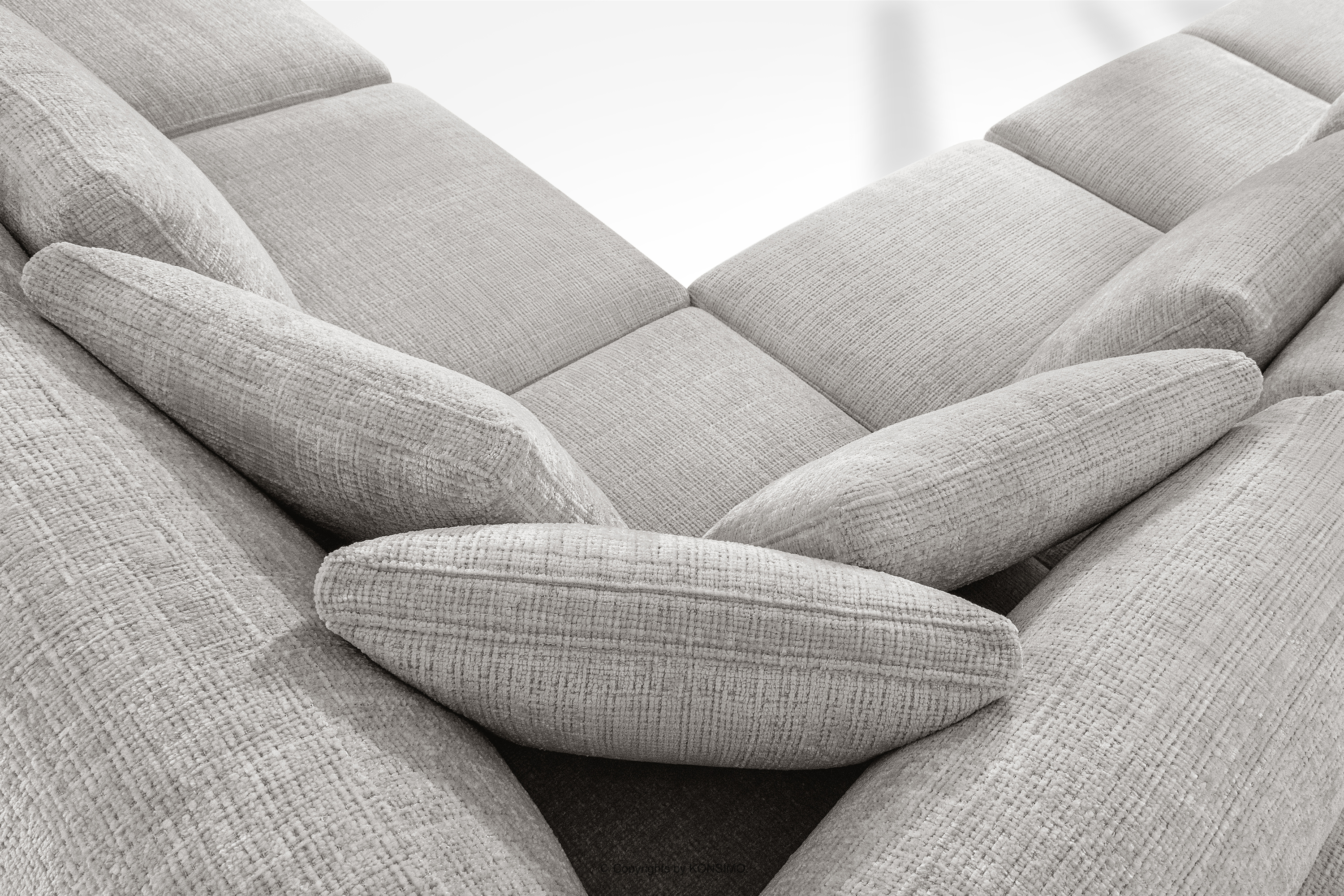 - Poduszki: 3x poduszka typu jasiek, 5x poduszka dekoracyjna prostokątna, 7x poduszka oparciowa, wypełnienie z kulki silikonowej i granulatu piankowego