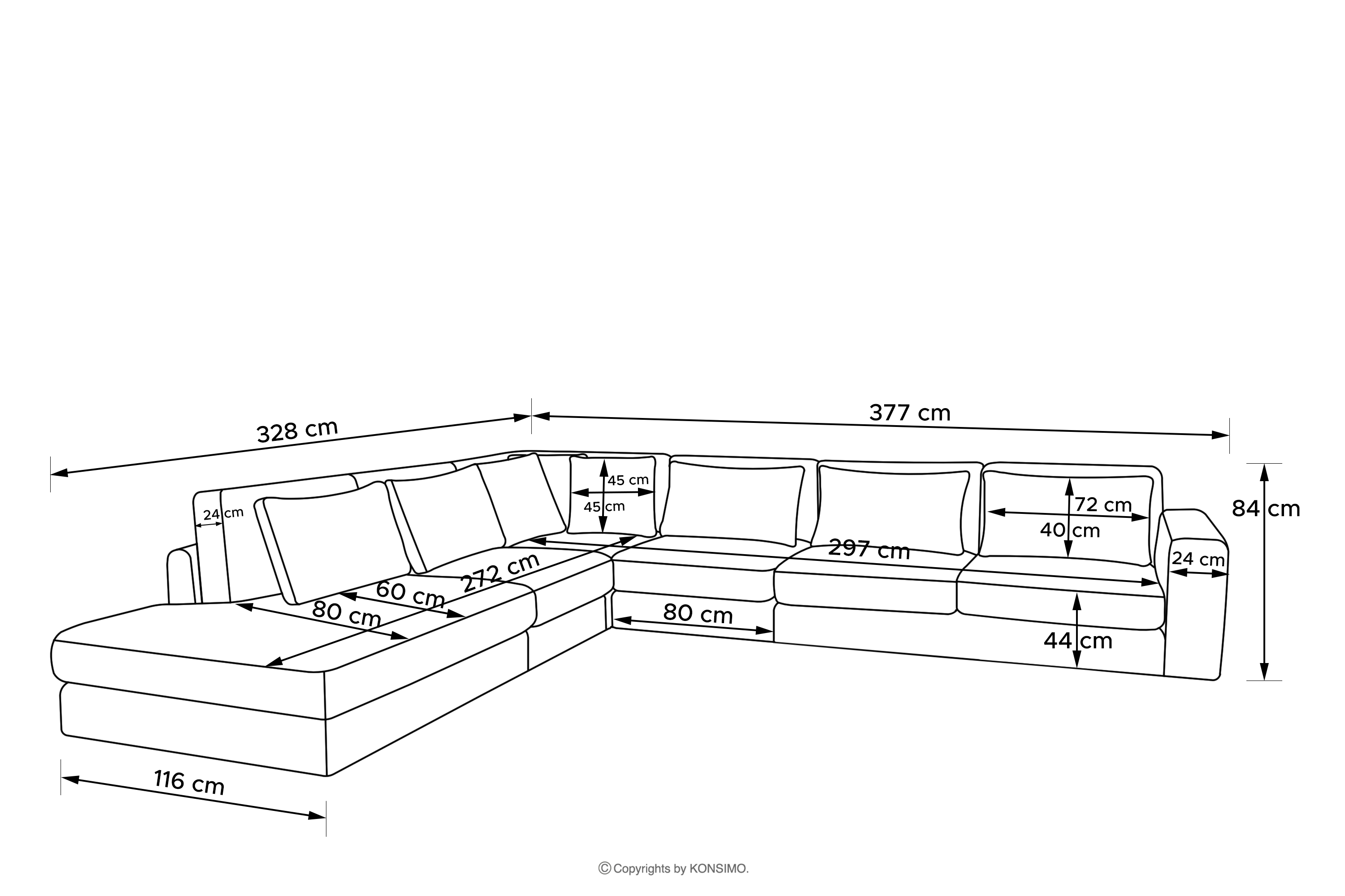 • Poduszki: 3x poduszka typu jasiek, 5x poduszka dekoracyjna prostokątna, 7x poduszka oparciowa, wypełnienie z kulki silikonowej i granulatu piankowego