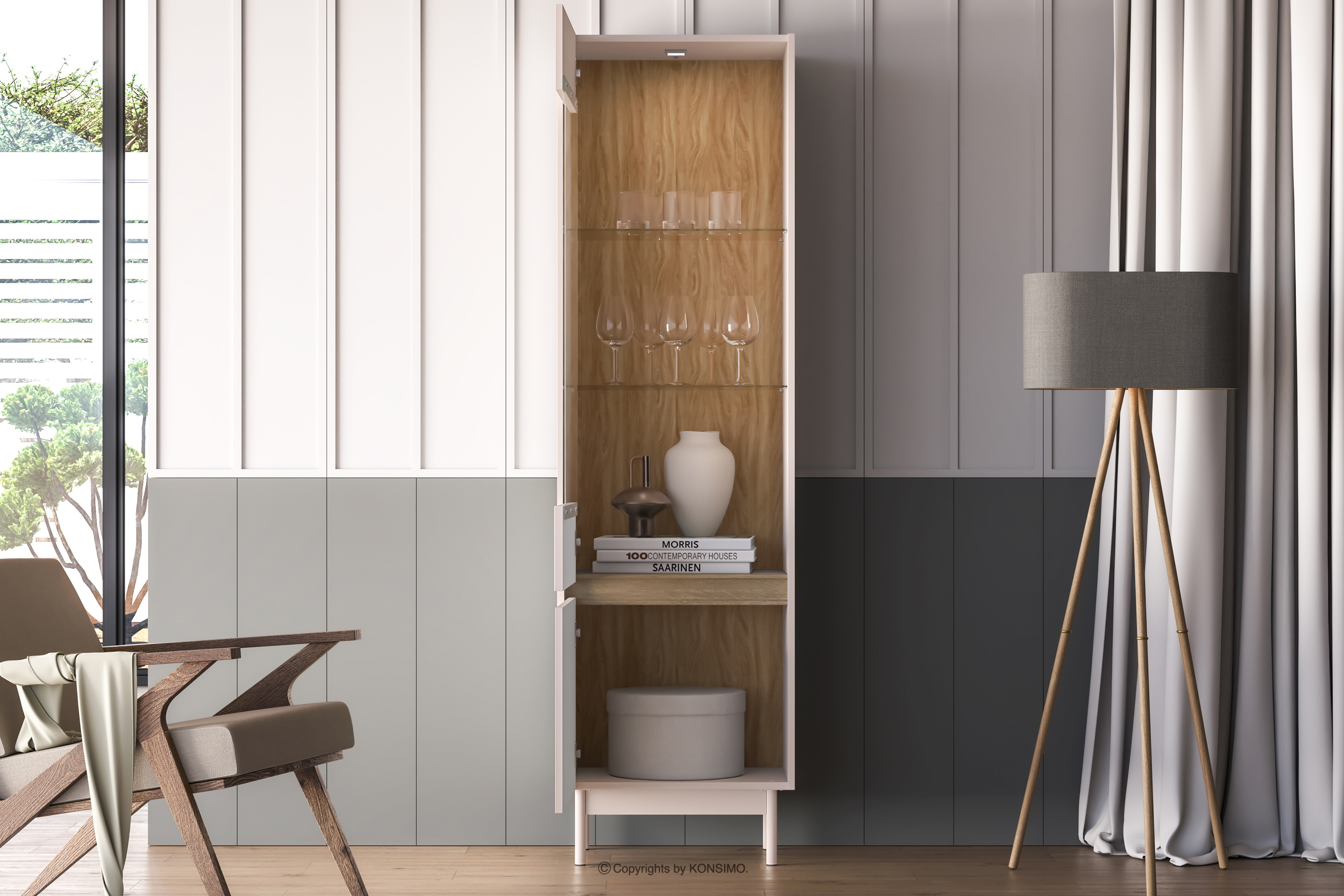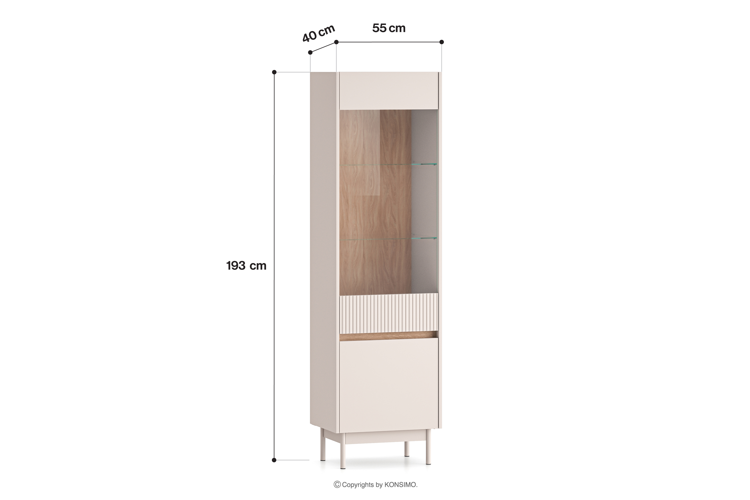 Elegancka witryna z ryflowaniem kremowy/dąb to wyjątkowy mebel, który doskonale łączy w sobie klasyczną elegancję z nowoczesną funkcjonalnością. Charakterystyczne ryflowanie na frontach nadaje jej niepowtarzalny charakter, tworząc subtelną grę światła i cienia, która dodaje wnętrzu głębi i wyrazistości. Ciepła kolorystyka w odcieniach kremowym i elementy koloru dębu sprawiają, że mebel harmonijnie wpisuje się w różnorodne aranżacje.