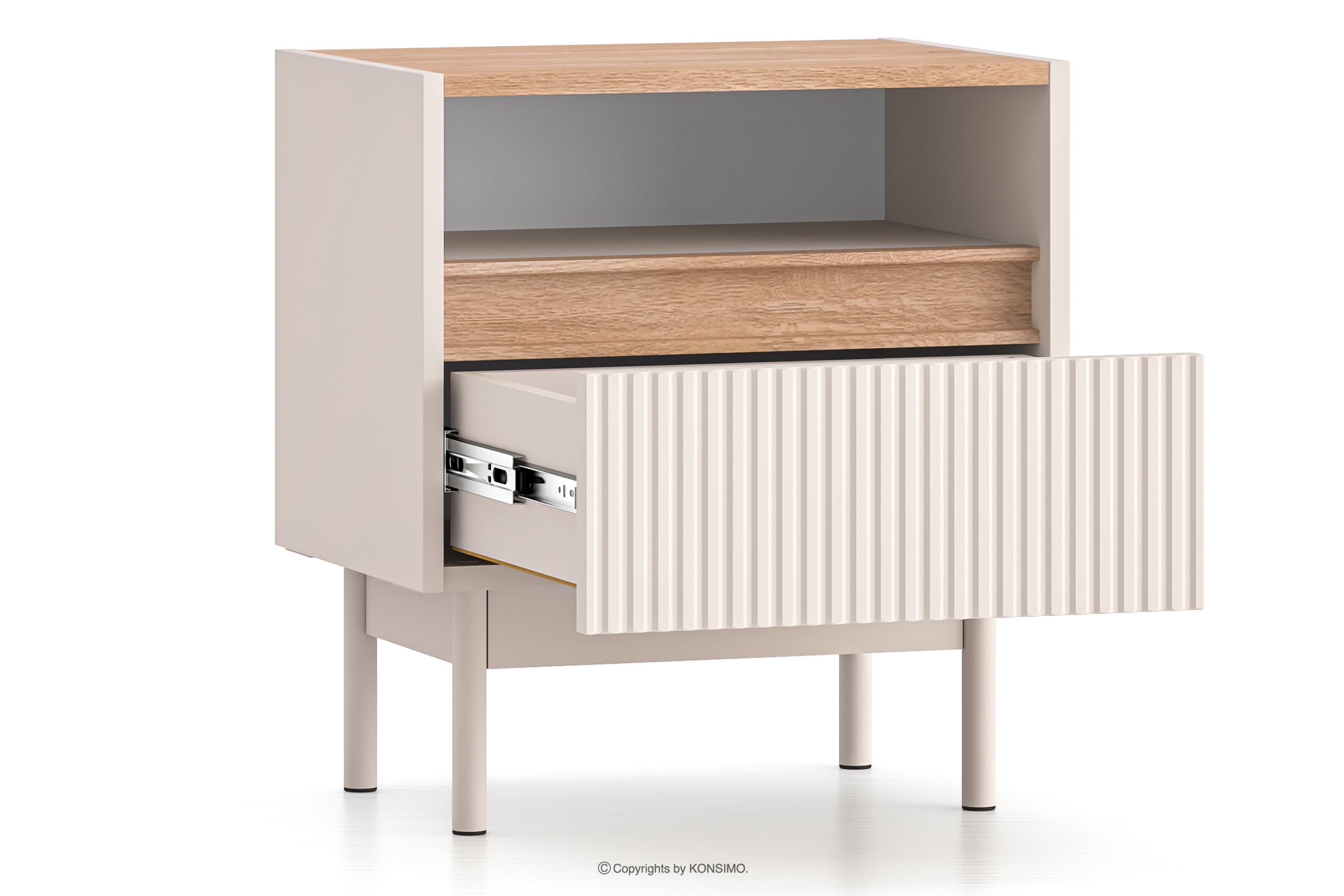 NALIA zobacz całą kolekcję Elegancki stolik nocny z ryflowaniem kremowy/dąb- kolor kremowy/dąb