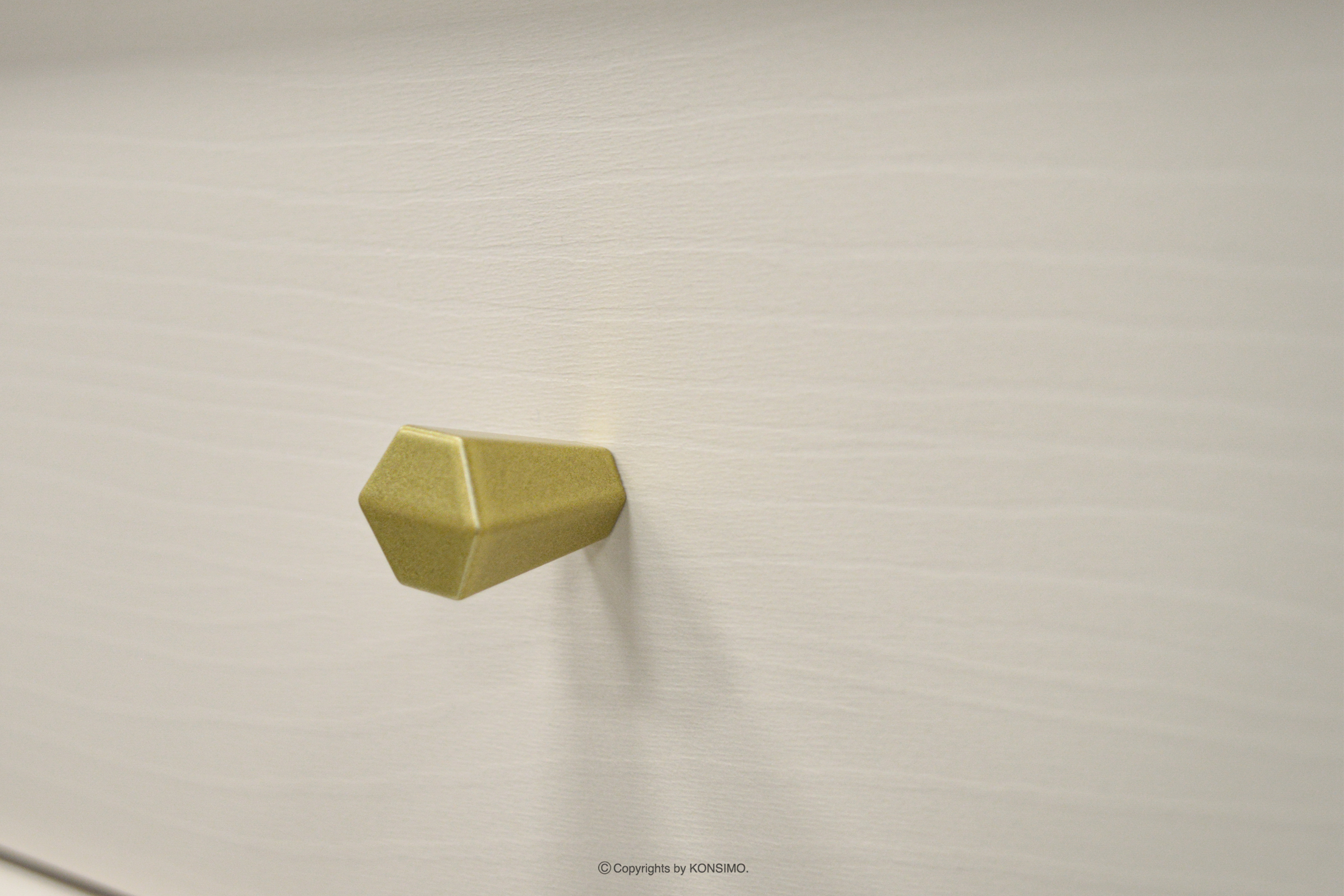 Wykonanie z najwyższej jakości materiałów gwarantuje trwałość i odporność mebli na codzienne użytkowanie. Korpus z płyty laminowanej o grubości 16 mm oraz ściany tylne z płyty HDF 2,5 mm zapewniają stabilność i solidność konstrukcji, co przekłada się na długowieczność całej kolekcji. Precyzyjne wykończenie krawędzi okleiną ABS o grubości 0,5 mm chroni meble przed uszkodzeniami mechanicznymi i wilgocią, zachowując ich estetyczny wygląd przez długi czas. Metalowe złote uchwyty i nóżki dopełniają nowoczesny wizerunek kolekcji oraz stanowią elegancki akcent kolorystyczny.