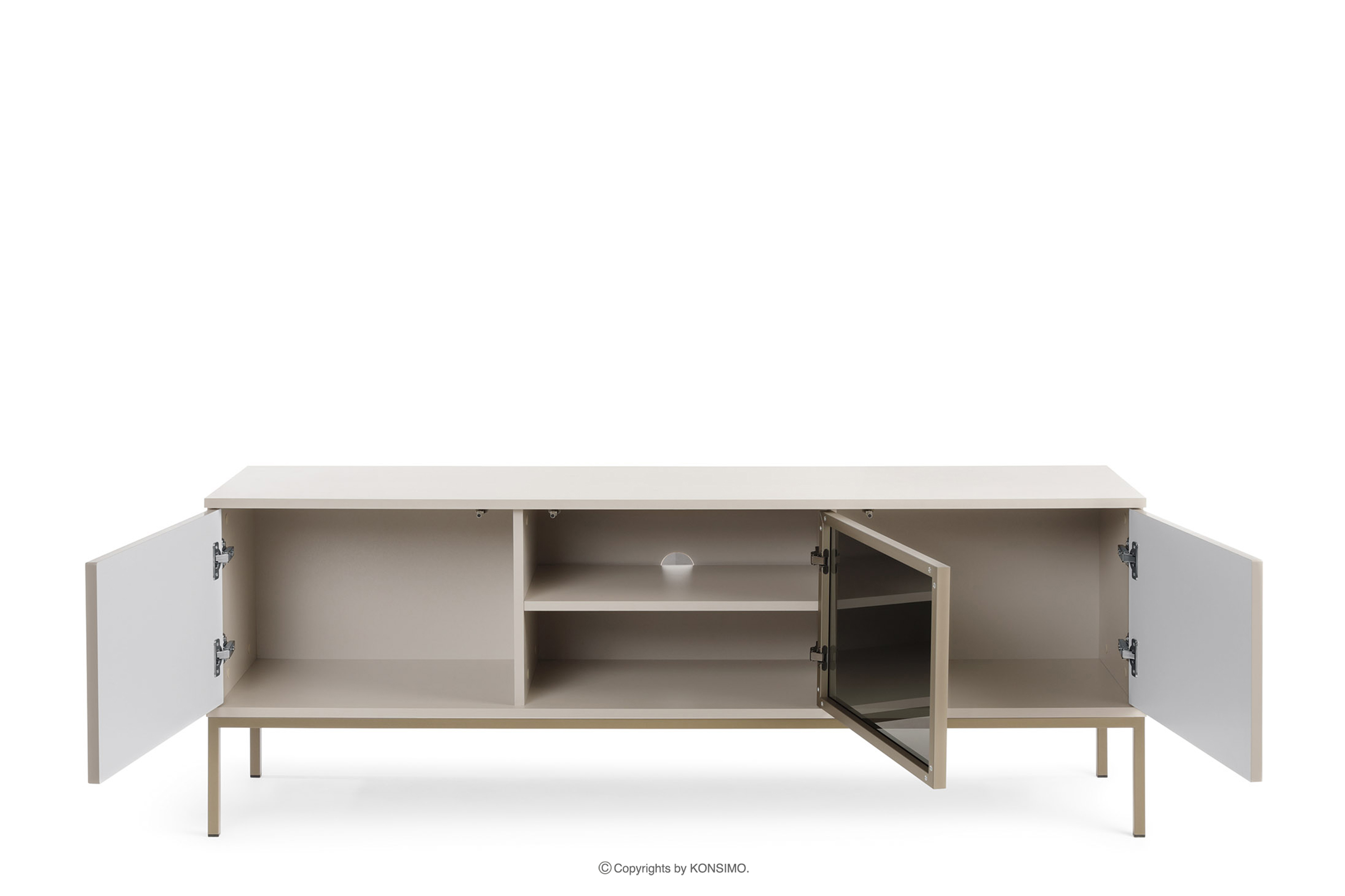Kremowa komoda z lamelami na wysokich nóżkach wykonana z wysokiej jakości płyty laminowanej o grubości 16 mm, gwarantuje trwałość i odporność na codzienne użytkowanie. Fronty z frezowanego MDF o grubości 18 mm dodają elegancji i głębi, tworząc unikalny trójwymiarowy efekt. Szklane elementy, wykonane z hartowanego szkła antisol w kolorze czarnym o grubości 4 mm, oprawione w aluminiowe ramki podkreślają estetykę mebla.