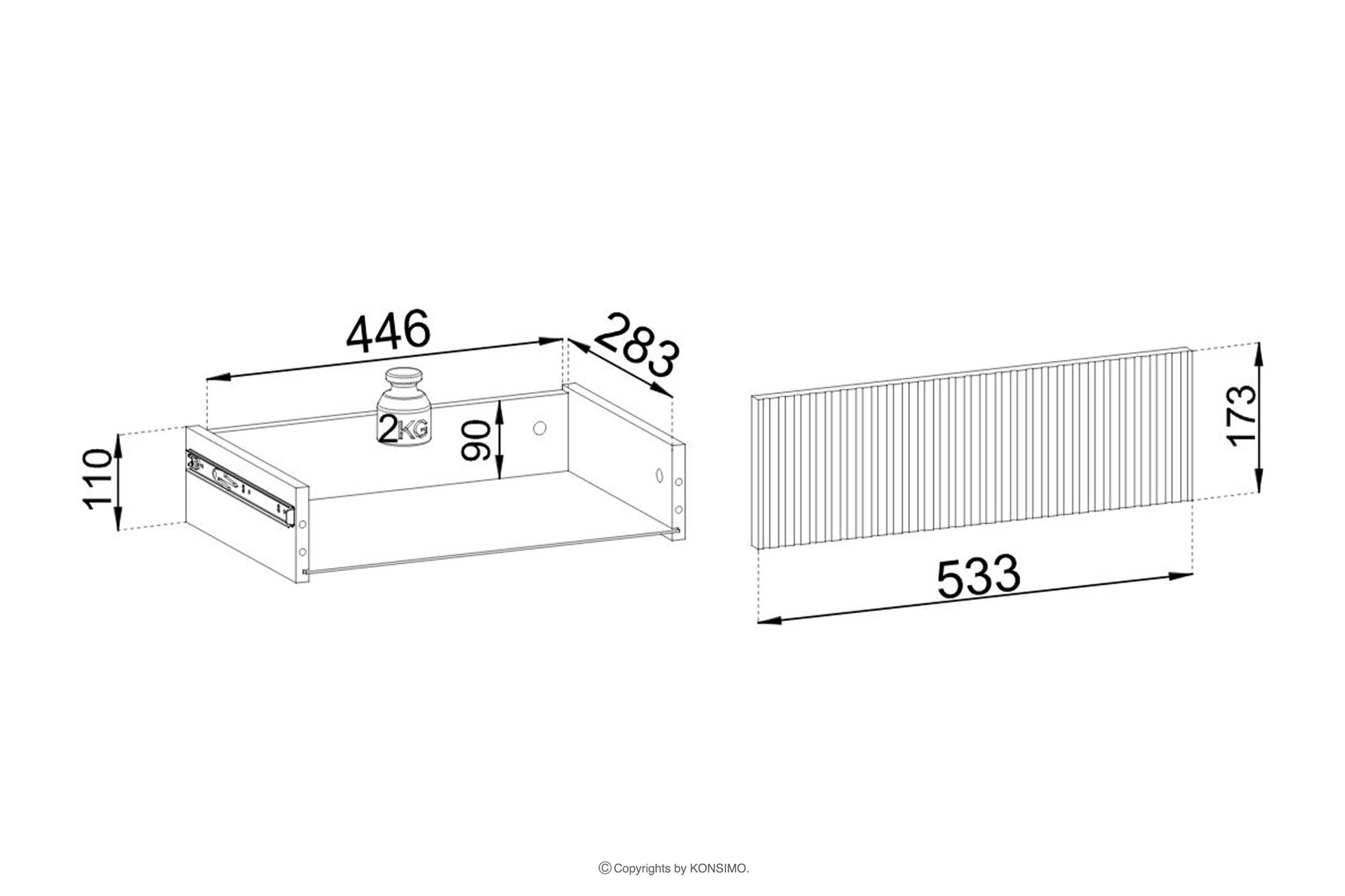 Kremowy stolik nocny z lamelami na wysokich nóżkach wykonana z wysokiej jakości płyty laminowanej o grubości 16 mm, gwarantuje trwałość i odporność na codzienne użytkowanie. Fronty z frezowanego MDF o grubości 18 mm dodają elegancji i głębi, tworząc unikalny trójwymiarowy efekt. Szklane elementy, wykonane z hartowanego szkła antisol w kolorze czarnym o grubości 4 mm, oprawione w aluminiowe ramki podkreślają estetykę mebla.