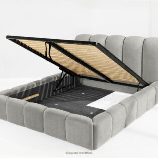 Pod tą warstwą przytulności i miękkości kryje się solidna inżynieria i funkcjonalność, która odpowiada na potrzeby nowoczesnych mieszkań, gdzie każdy centymetr przestrzeni jest na wagę złota. Konstrukcja łóżka opiera się na wytrzymałym stelażu metalowym, który stanowi gwarancję stabilności i braku irytującego skrzypienia, a wyposażenie go w wysokiej jakości listwy drewniane sprężynujące zapewnia optymalną pracę materaca, poprawiając jego wentylację i precyzyjnie reagując na nacisk ciała śpiącej osoby. Co więcej, pod całą powierzchnią spania ukryto niezwykle pojemną skrzynię na pościel, która z powodzeniem zastąpi dodatkową szafę czy komodę, mieszcząc kołdry, poduszki, koce czy sezonową odzież; aby korzystanie z tego schowka było czystą przyjemnością, zastosowaliśmy zaawansowany automat z siłownikami gazowymi. Dzięki niemu uniesienie ciężkiego materaca wraz ze stelażem nie wymaga użycia siły – mechanizm działa płynnie i cicho, utrzymując stelaż w górze podczas pakowania rzeczy, co sprawia, że codzienne ścielenie łóżka czy chowanie pościeli jest procesem szybkim, lekkim i intuicyjnym, wpisującym się w filozofię funkcjonalnego minimalizmu.